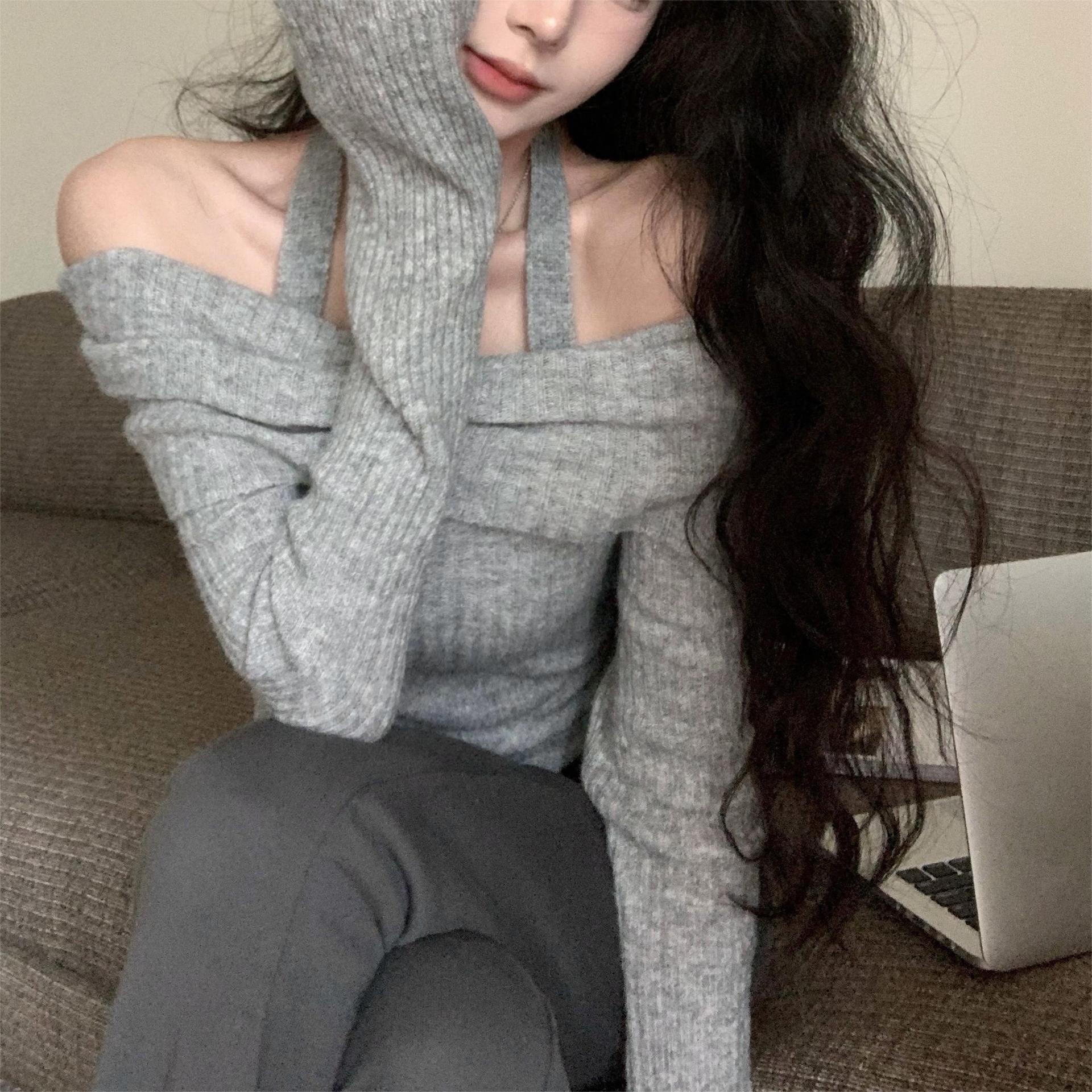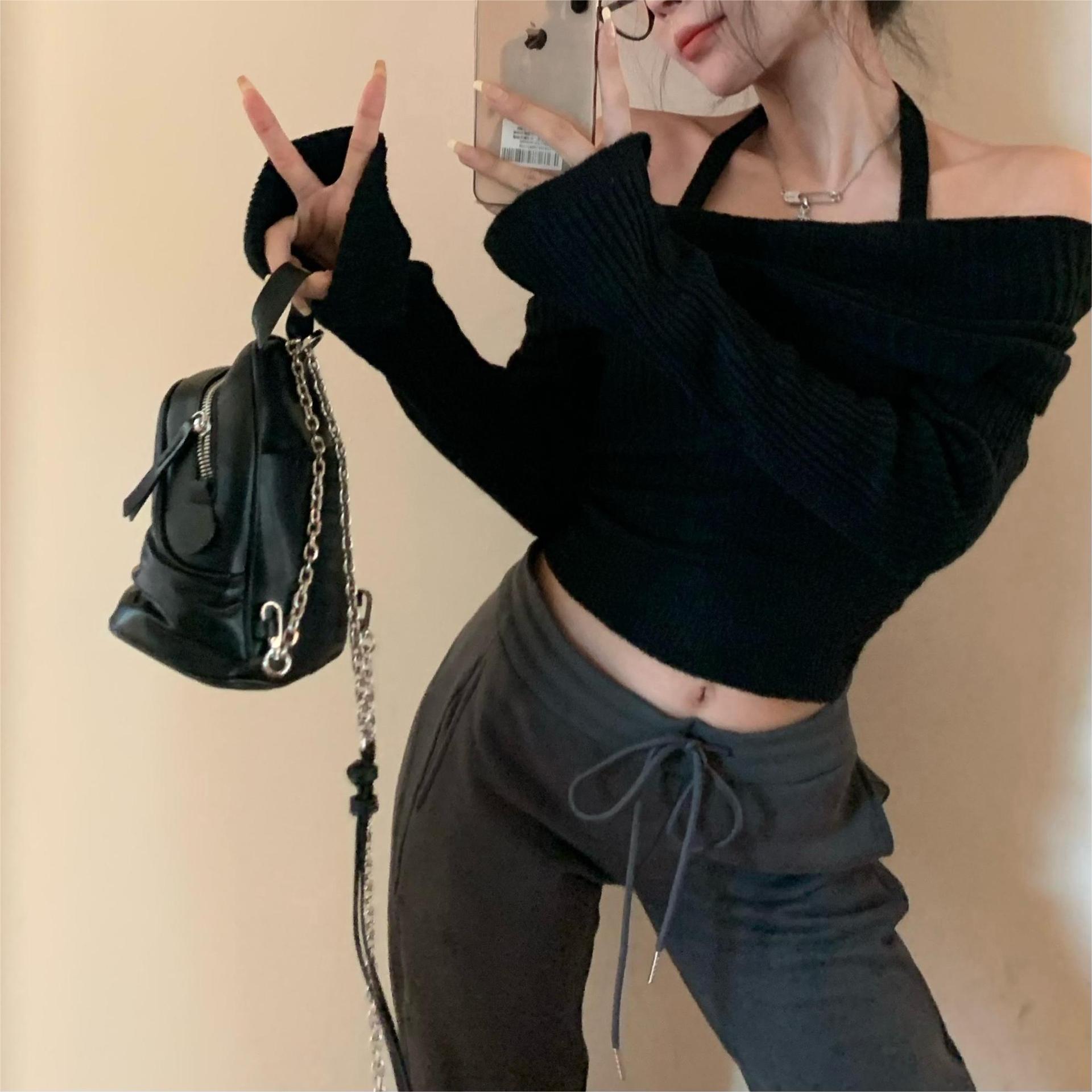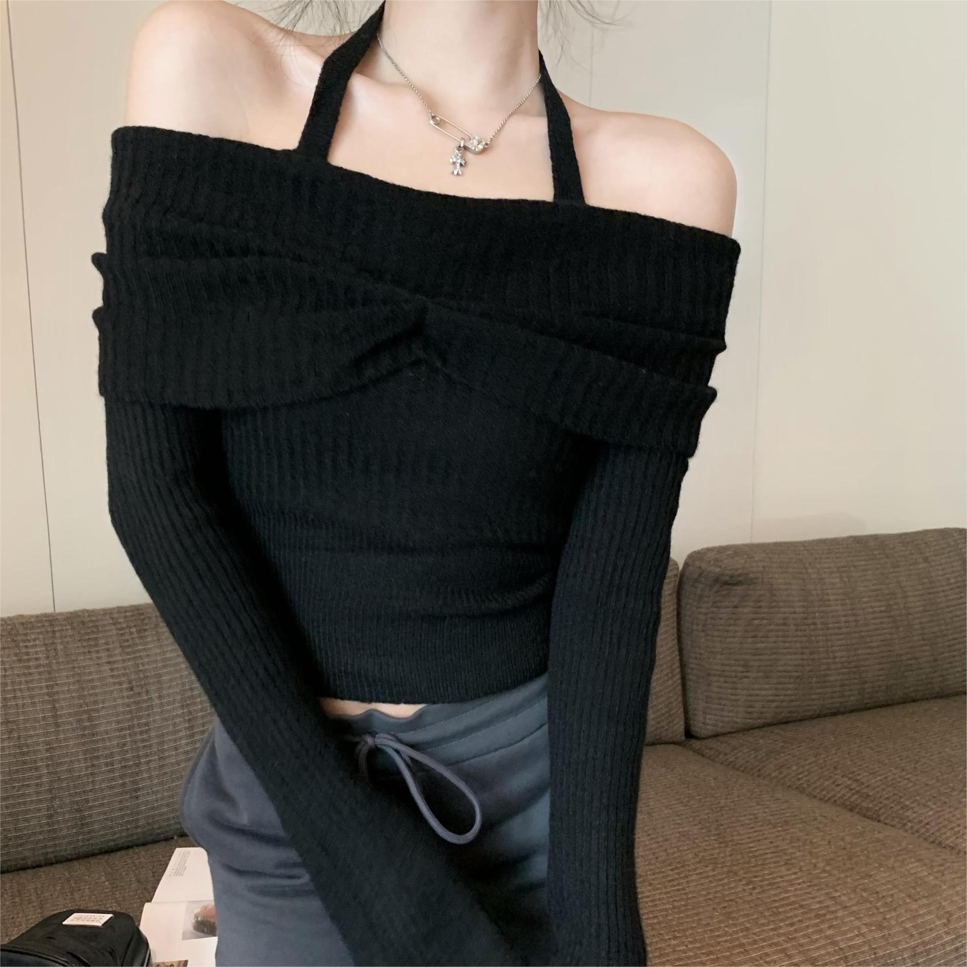 가을과 겨울 새로운 다랑 니트 숄더 넥 긴팔 슬림핏 스파이스 걸스 퓨어 욕망 여성용 스웨터 탑