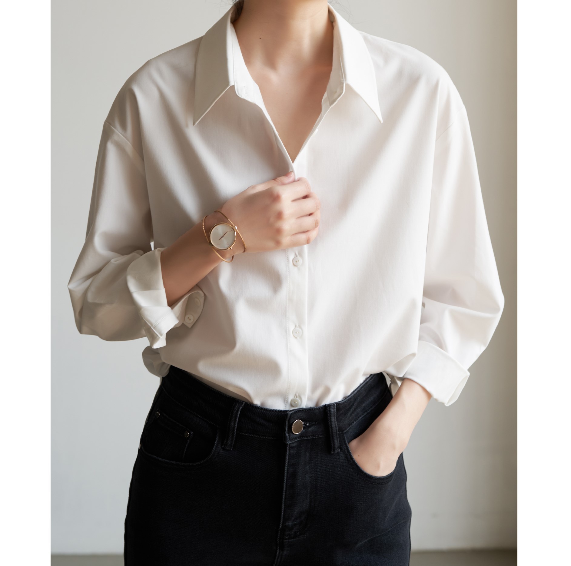 [체험모델] 여성을 위한 프로 통근 레이어드 화이트 셔츠, 루즈한 긴팔 포멀 인터뷰 셔츠