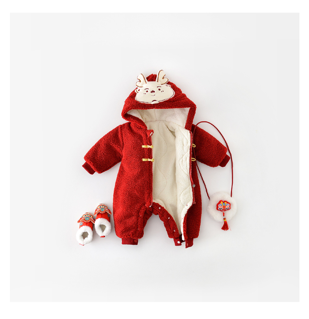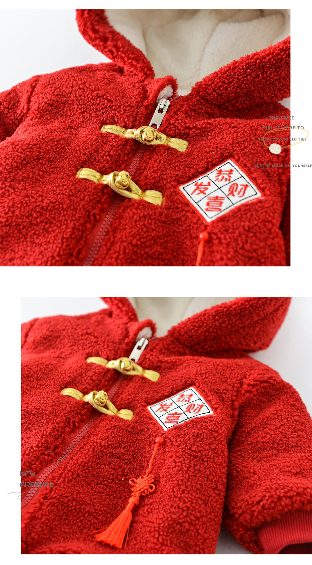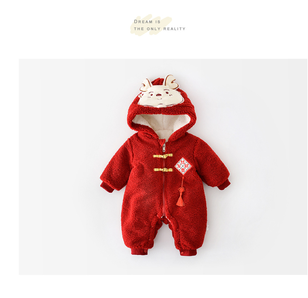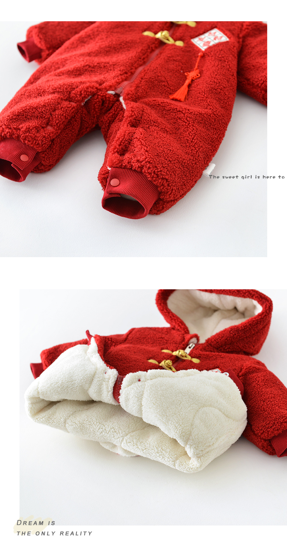 아기의 기모 점프 슈트 겨울 용 아기 두꺼운 따뜻한 중국 스타일 연간 세트 겉옷을 입고 후드 모자 등산 세트