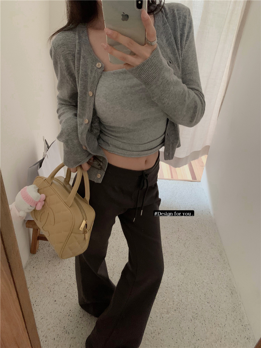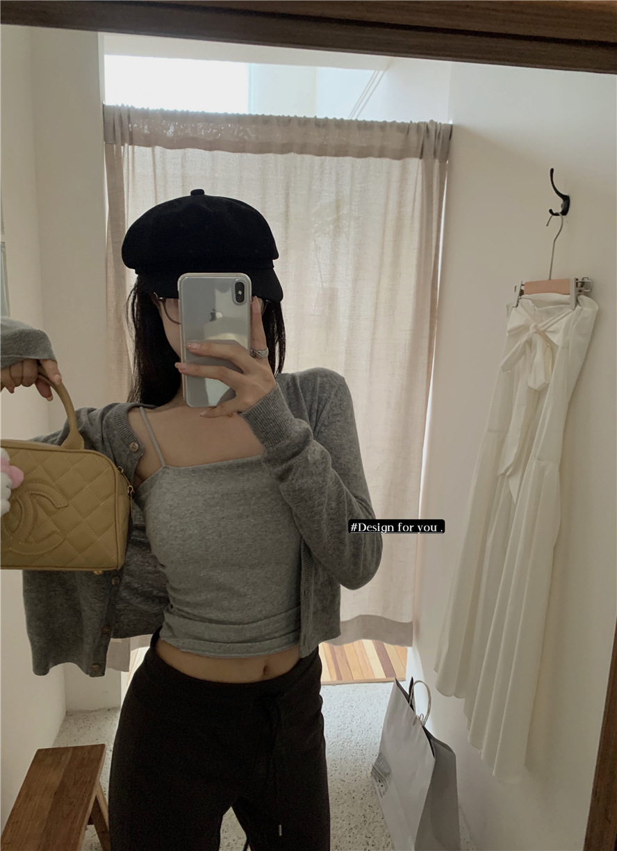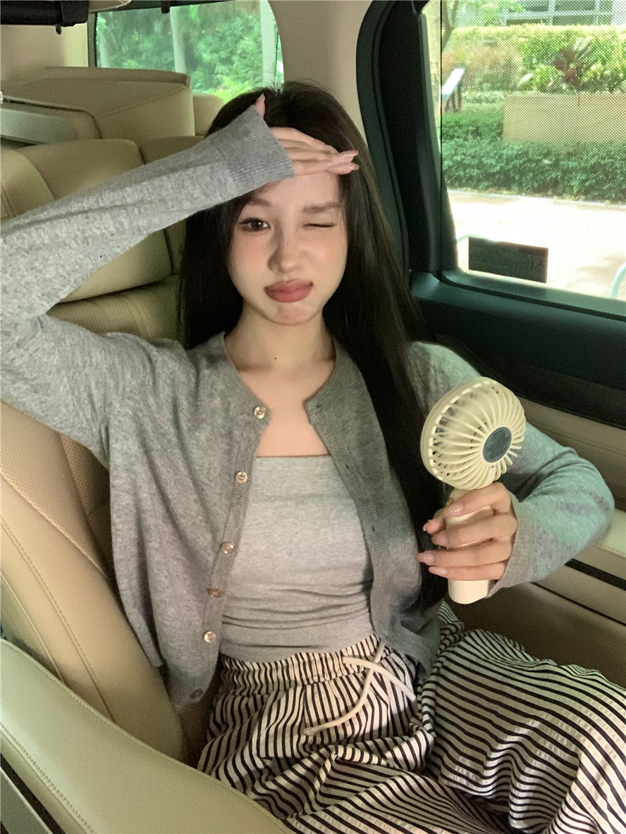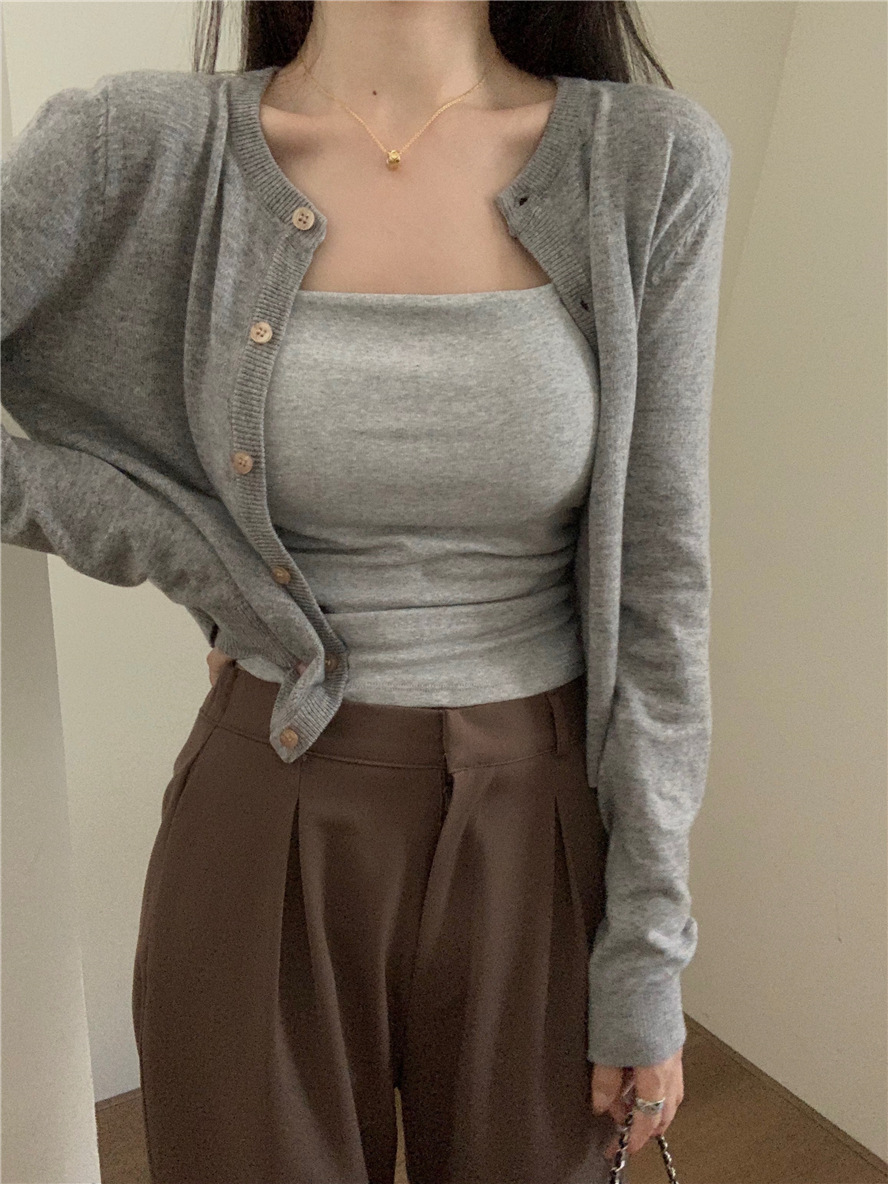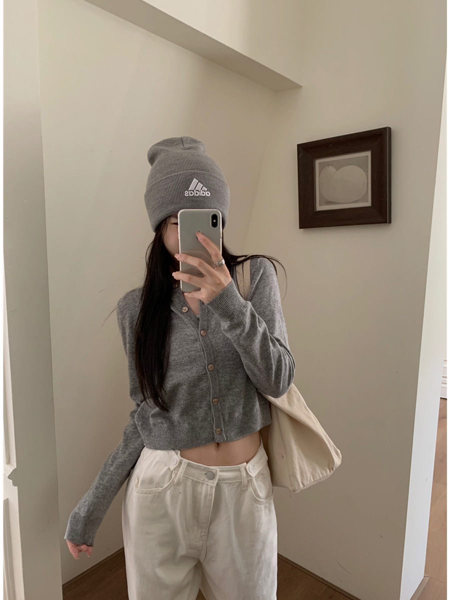 니트 카디건 재킷 여성 봄, 가을 새로운 스타일 몸집이 작은 슬림 슬림 회색 스웨터와 짧은 탑