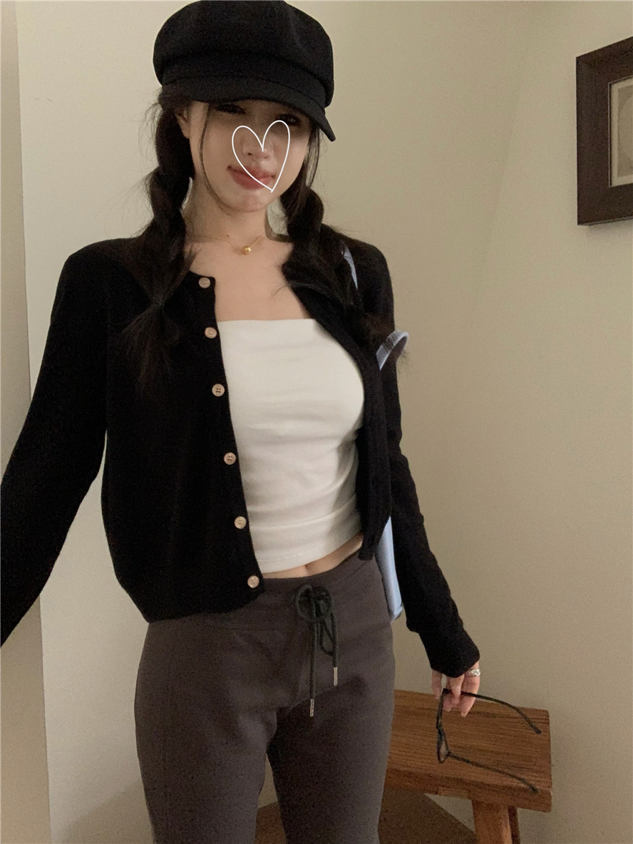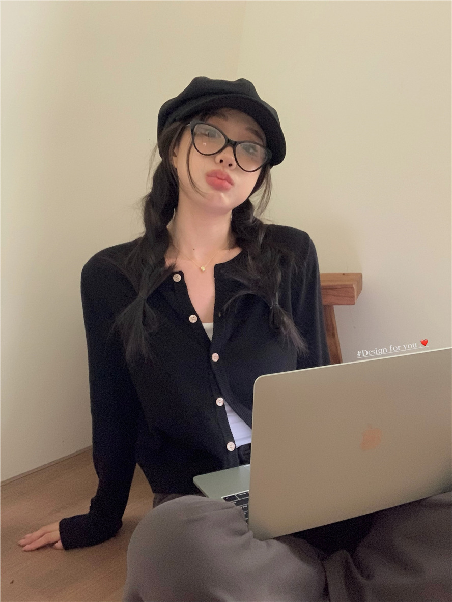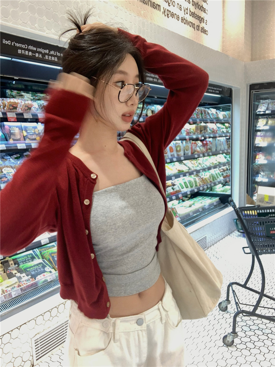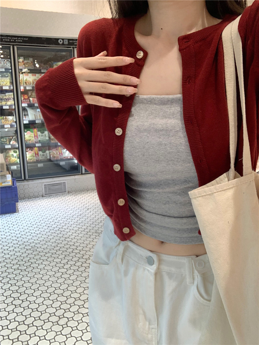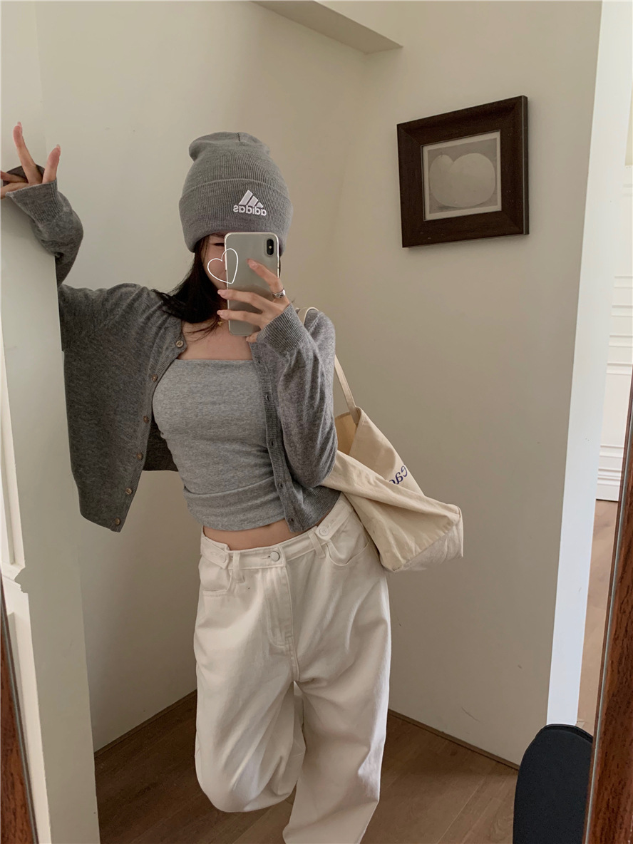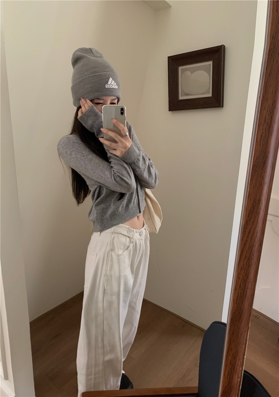 니트 카디건 재킷 여성 봄, 가을 새로운 스타일 몸집이 작은 슬림 슬림 회색 스웨터와 짧은 탑