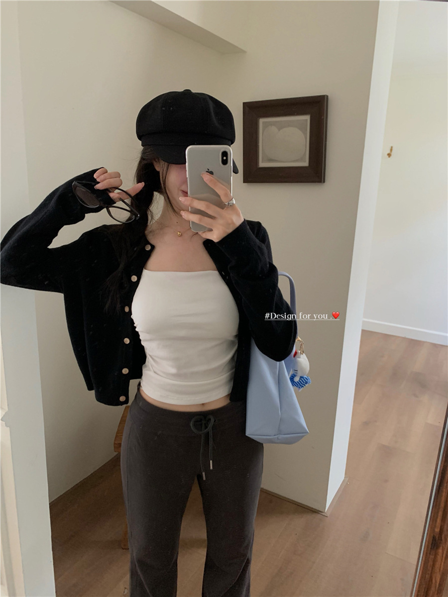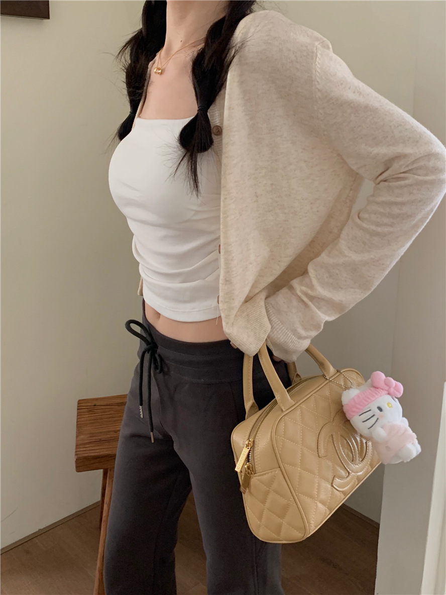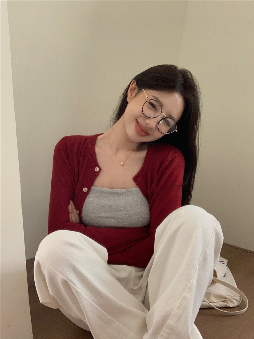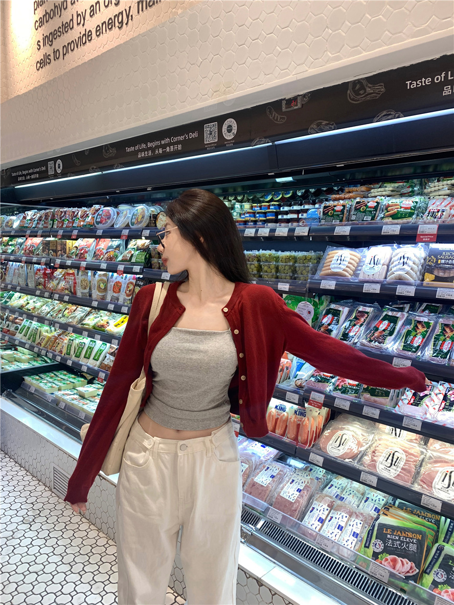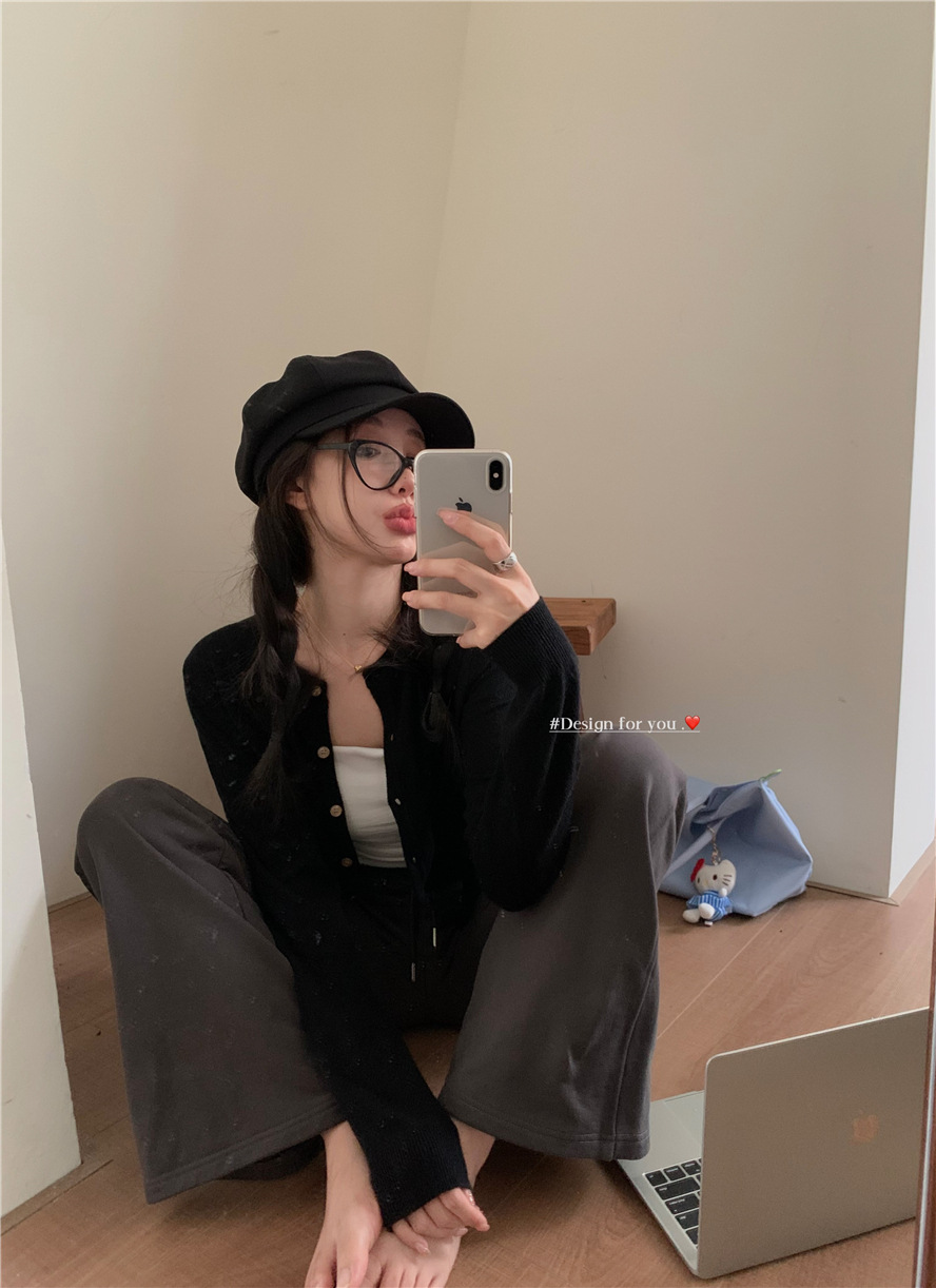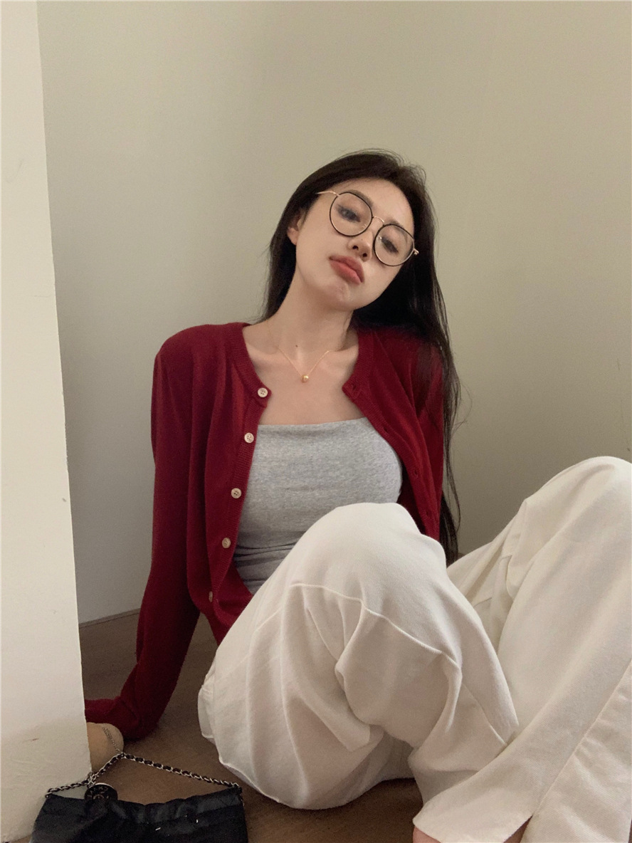 니트 카디건 재킷 여성 봄, 가을 새로운 스타일 몸집이 작은 슬림 슬림 회색 스웨터와 짧은 탑