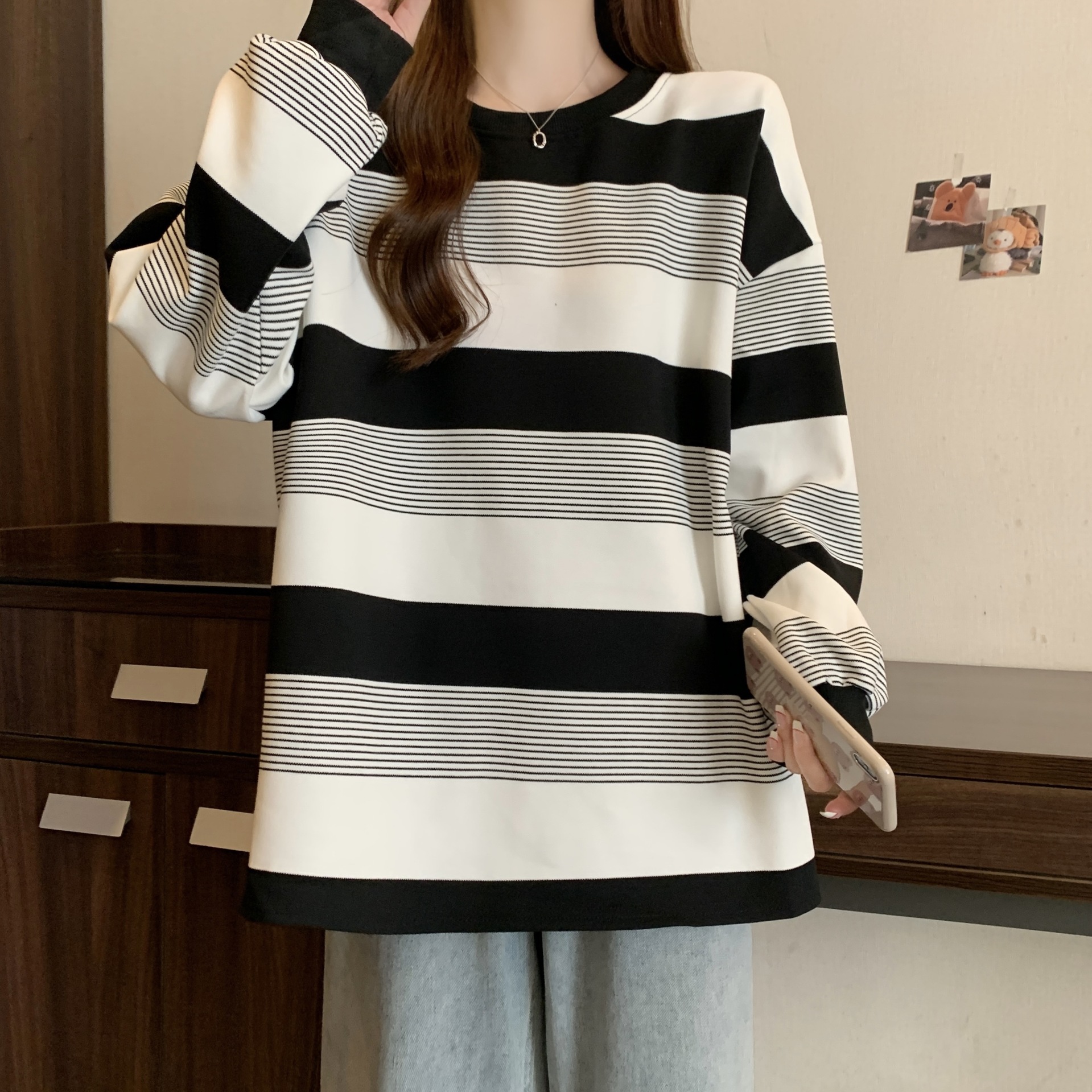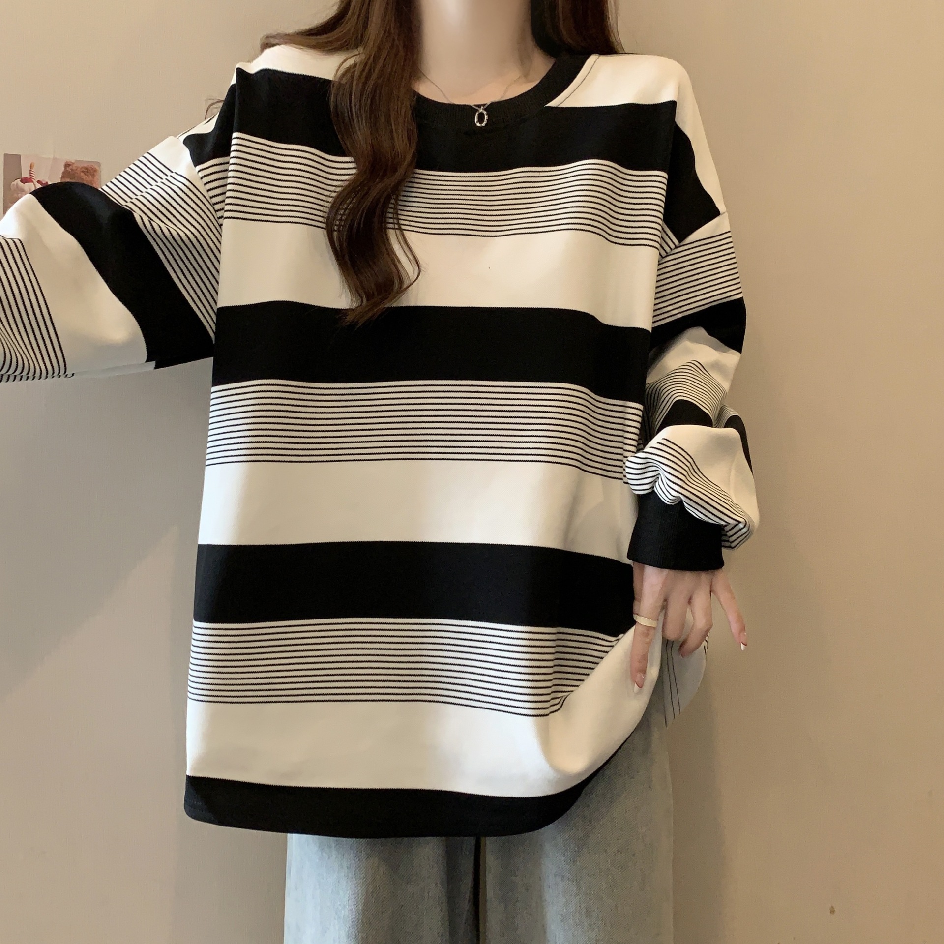 미국 레트로 스타일 스트라이프 얇은 스웨트셔츠 여성용 2025 신상 가을 슬림핏 뚱뚱한 여성용 배 가리기 루즈 학생용 상의스토어 가기