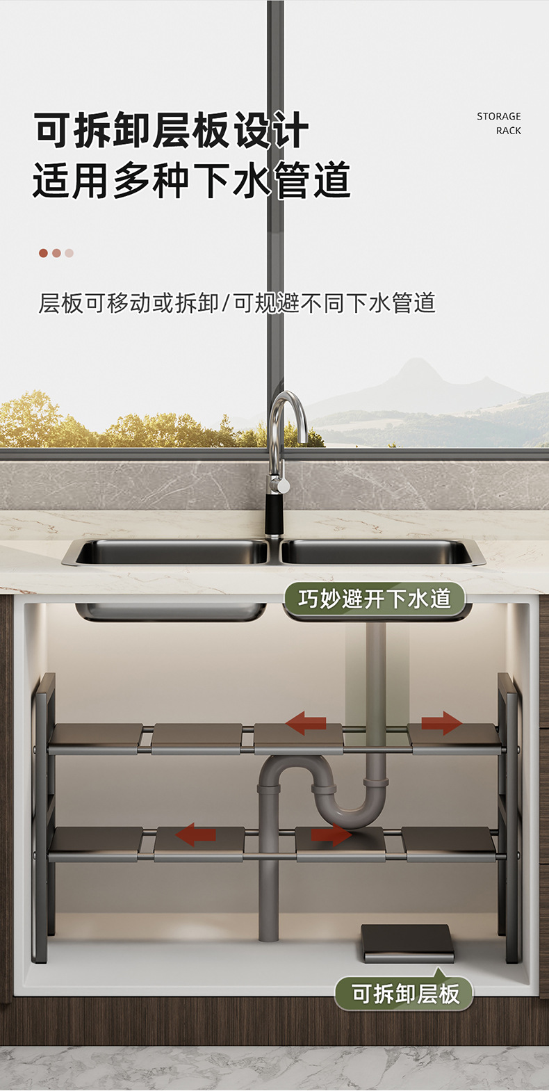 낮은 싱크 스토리지 랙 카운터 탑 캐비닛 레이어드 랙 다목적 스토리지 랙 주방 스토리지 랙 높이 조정 가능