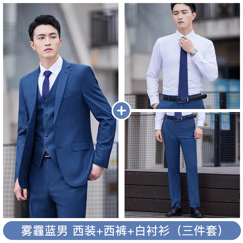• YRNN-YR8898 남성 헤이즈 블루 조끼 + 헤이즈 블루 팬츠 + TL021 화이트 셔츠