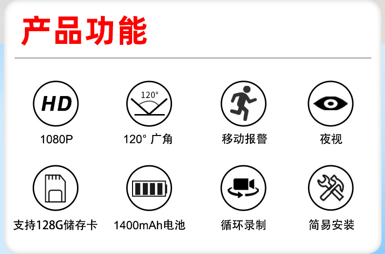 功 能:录像,拍照、夜视红外、广角140度、移动侦测、