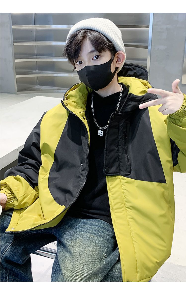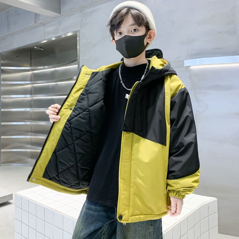 남아 코튼 코트 가을과 겨울 2023 가을과 겨울 새로운 스타일 미드 빅 어린이 트렌디 쿨 대비 컬러 야외 후드 코트