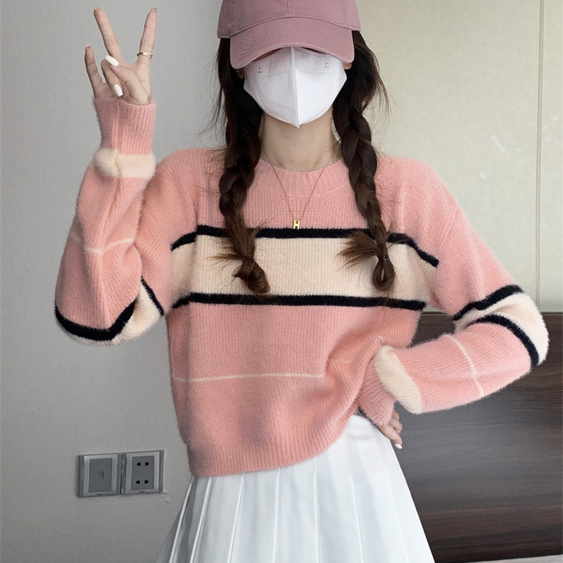 리얼 샷 가을과 겨울 새로운 부드러운 왁스 플러시 스웨터 라운드 넥 니트 긴 소매 느슨한 게으른 대비 컬러 스트라이프 짧은 연령 감소