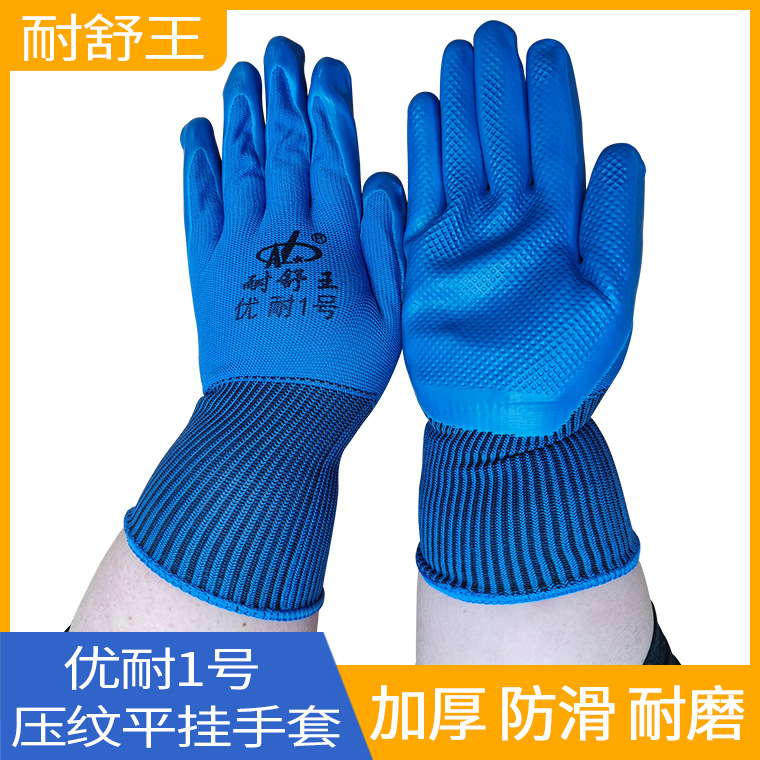 【商品名称】:耐舒王优耐1号蓝纱蓝压纹平挂浸胶手套