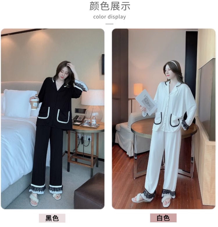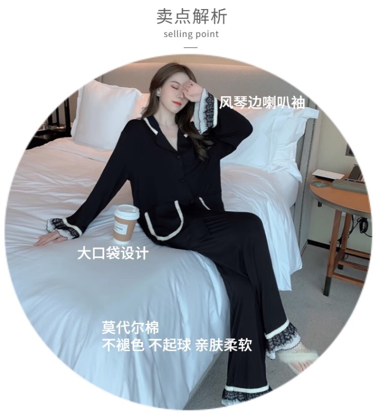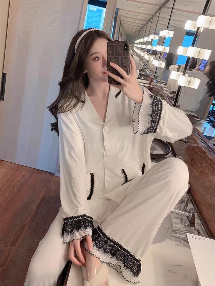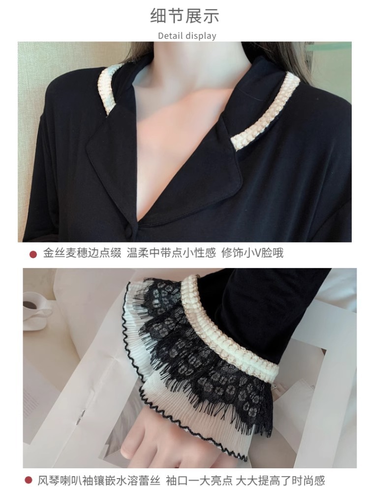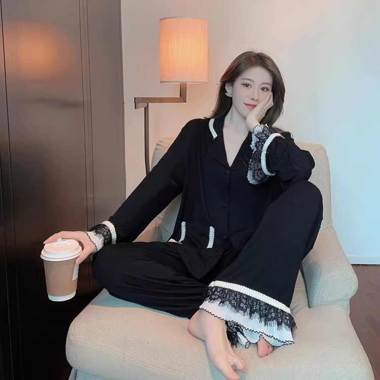 여성을위한 인터넷 연예인 스타일 잠옷 봄, 가을 긴팔 바지 정장 섹시한 레이스 블랙 2025 새로운 홈웨어스토어 가기