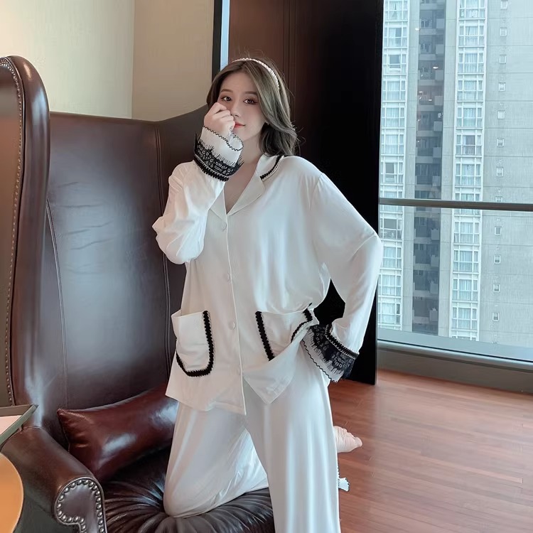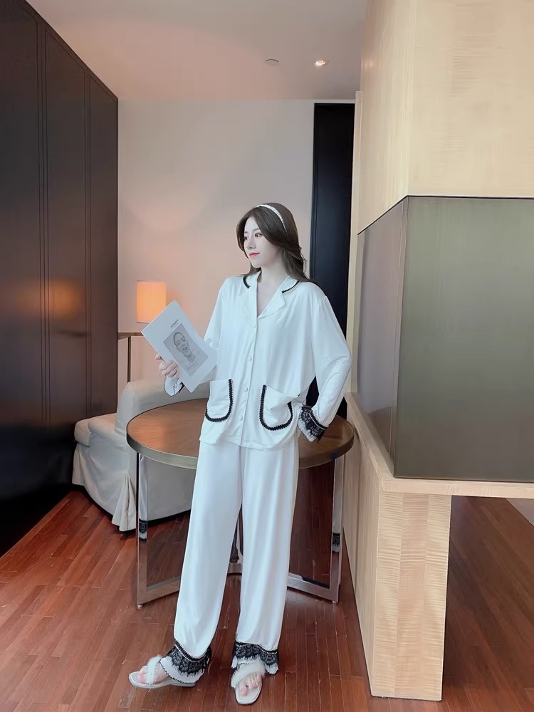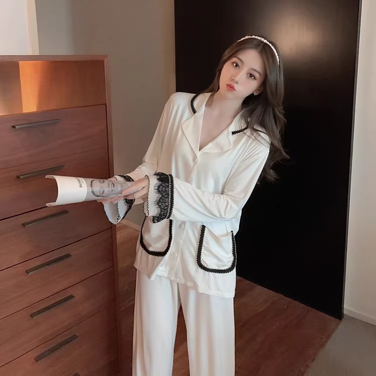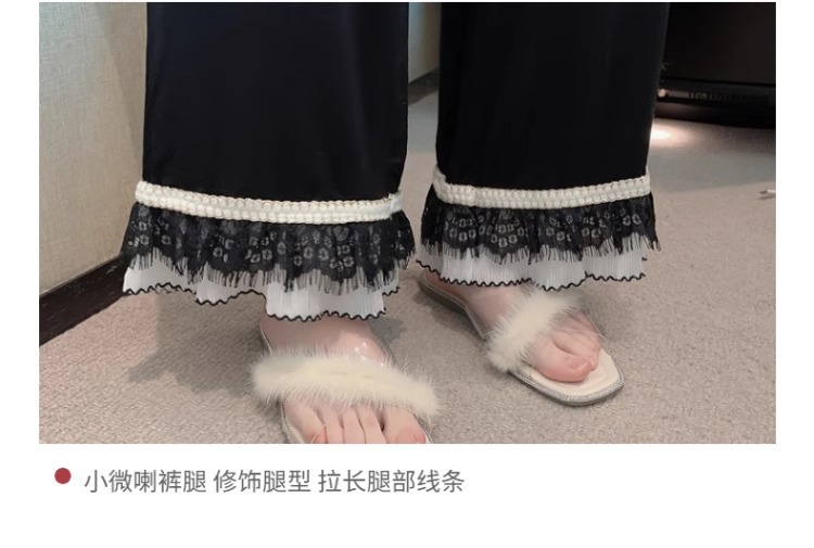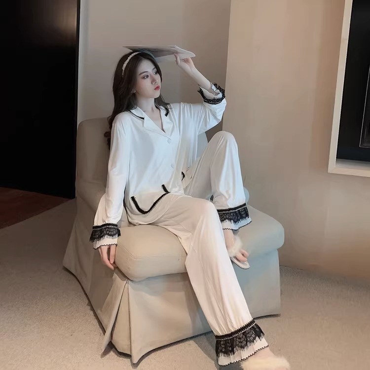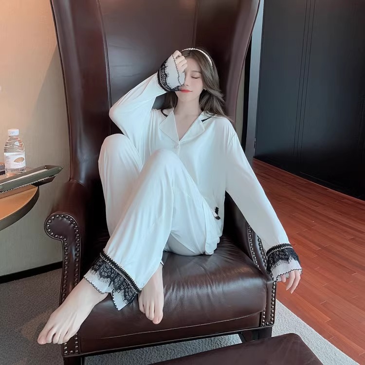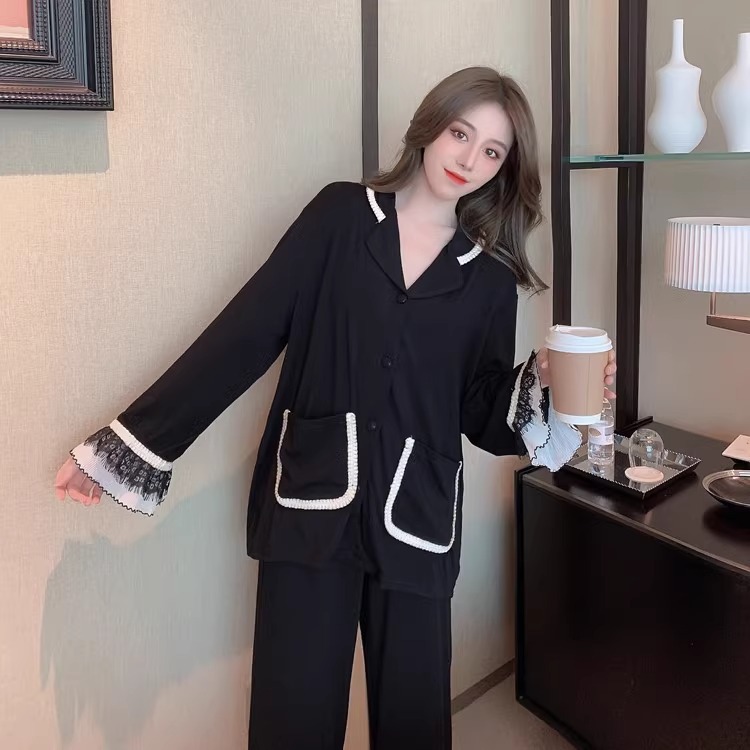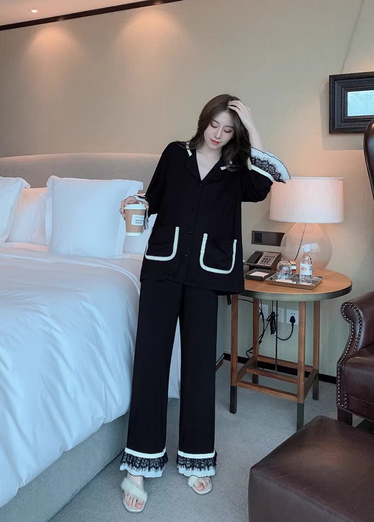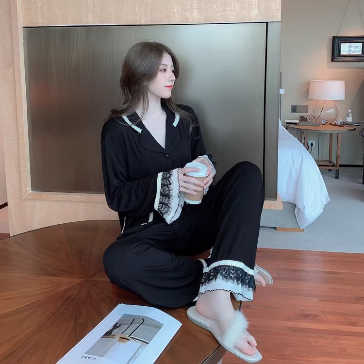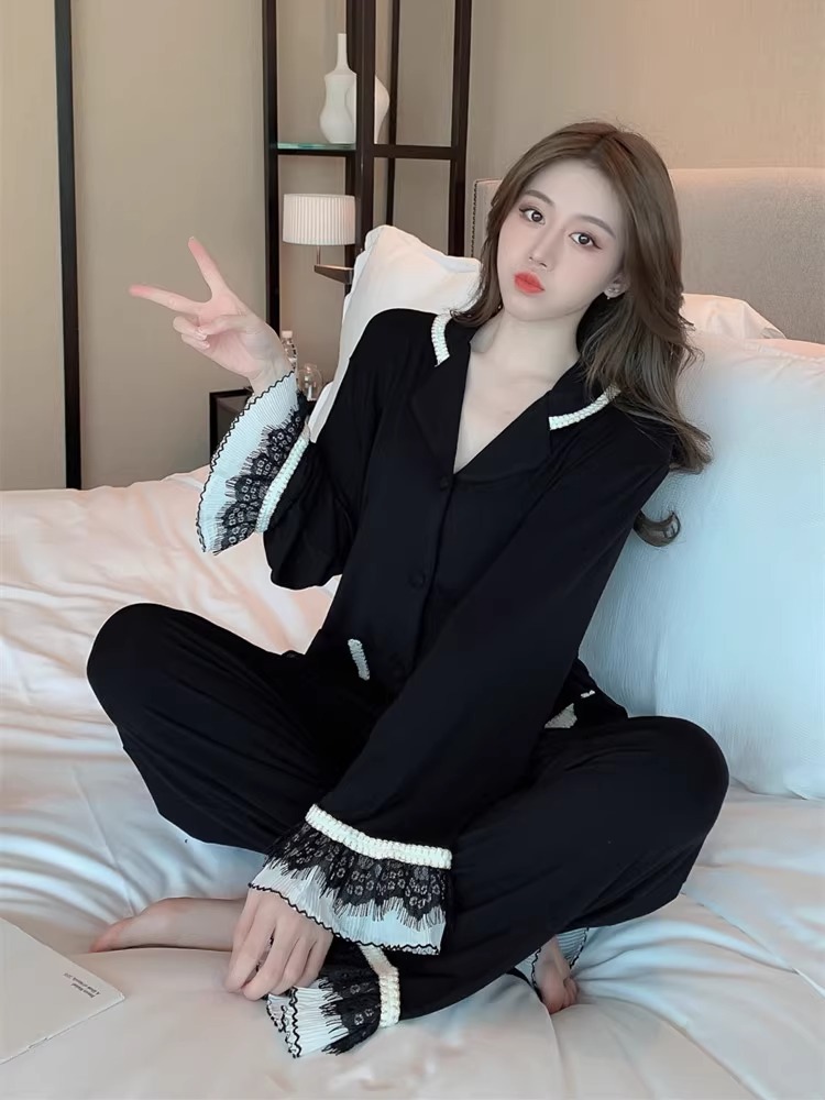 여성을위한 인터넷 연예인 스타일 잠옷 봄, 가을 긴팔 바지 정장 섹시한 레이스 블랙 2025 새로운 홈웨어