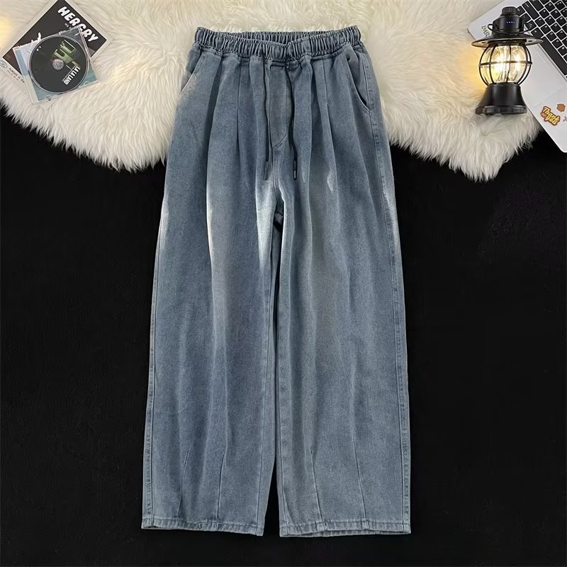 홍콩 스타일 청바지 남성용 트렌디 브랜드 와이드 레그 드로스트링 레그 트렌디 루즈한 스트레이트 올매치 캐주얼 롱 팬츠