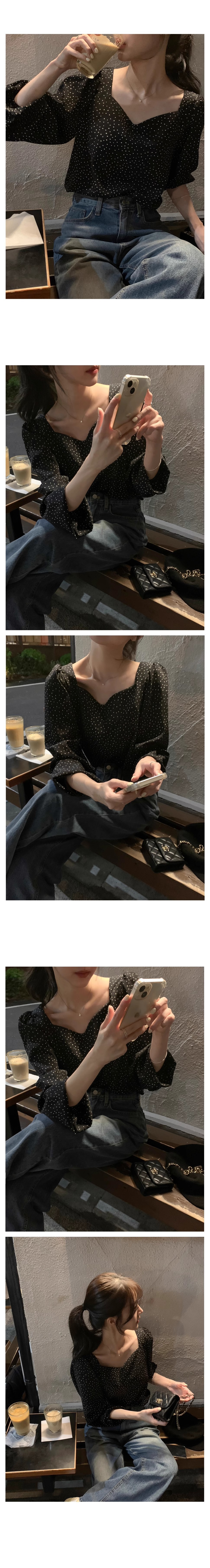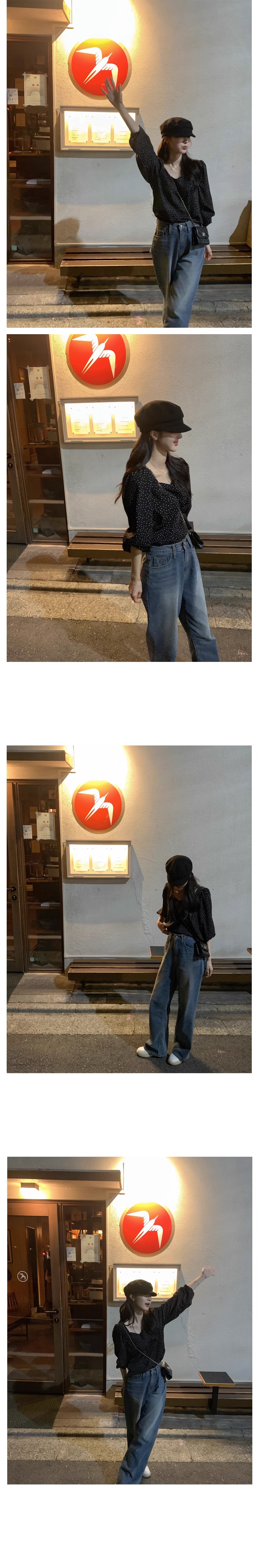 한국 세련된 가을 프랑스 레트로 스퀘어 칼라 본 컬러 대비 웨이브 도트 디자인 느슨한 여성을위한 올 매치 긴팔 셔츠스토어 가기