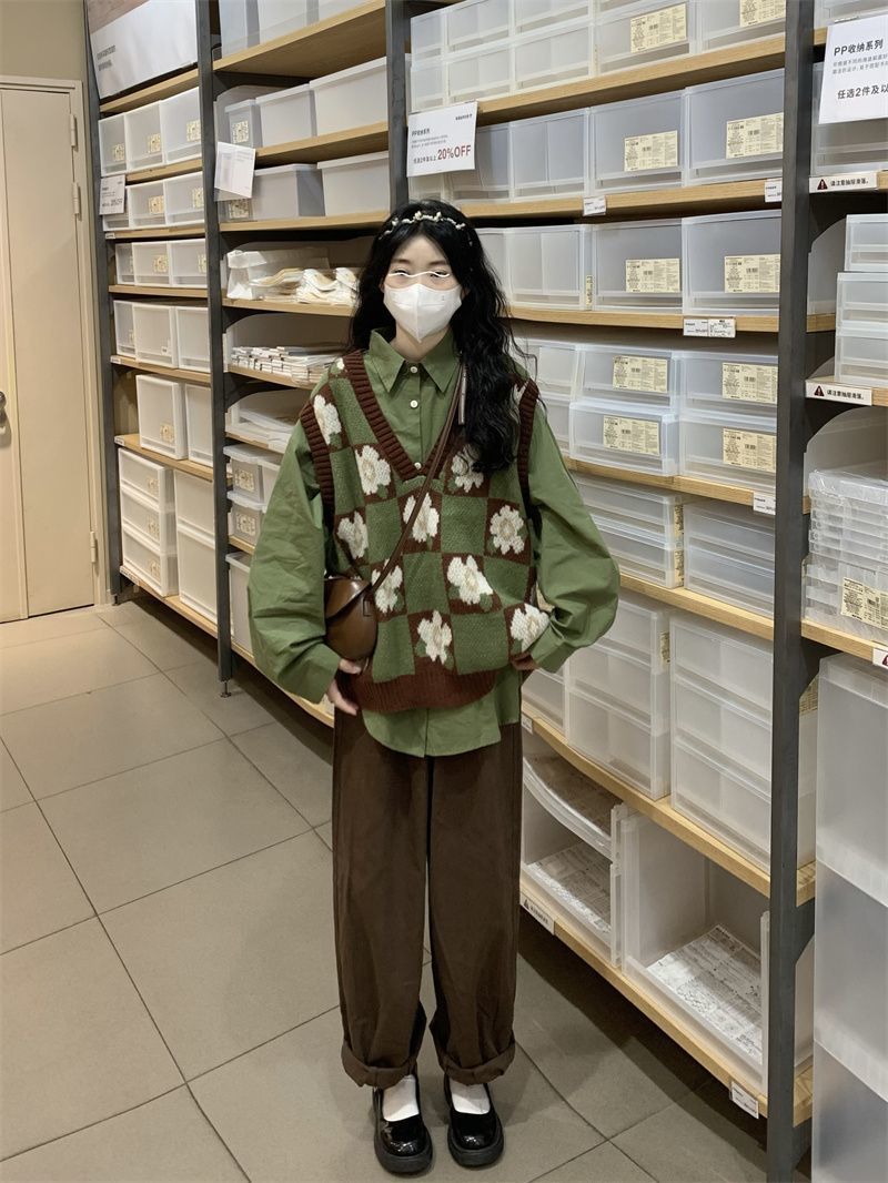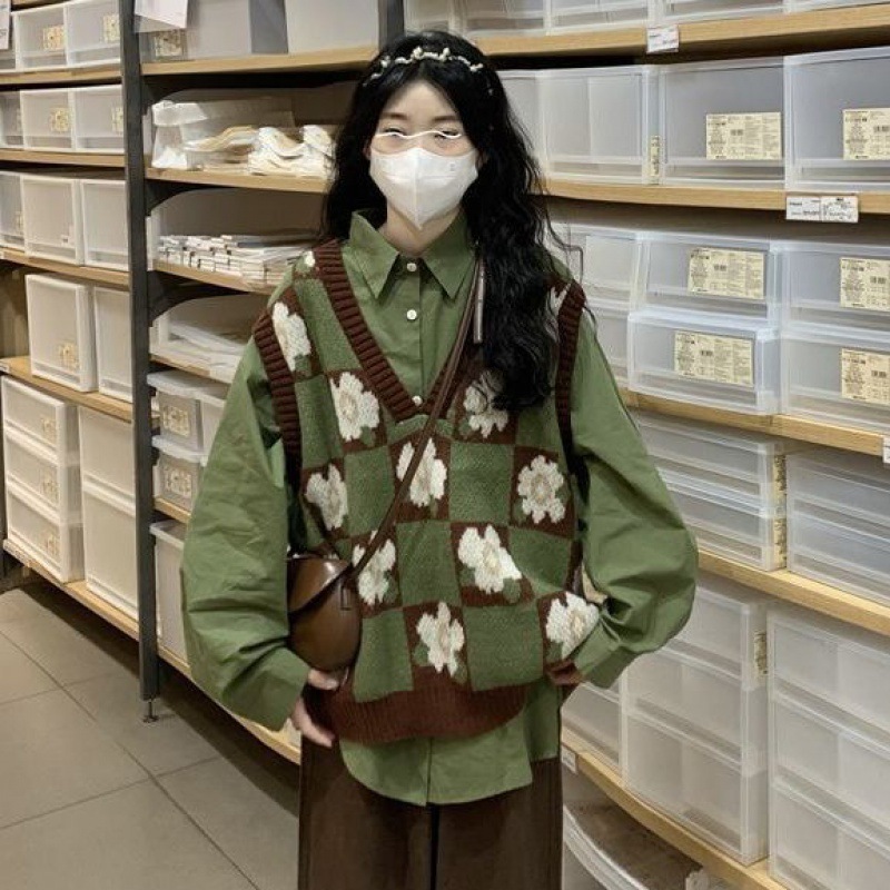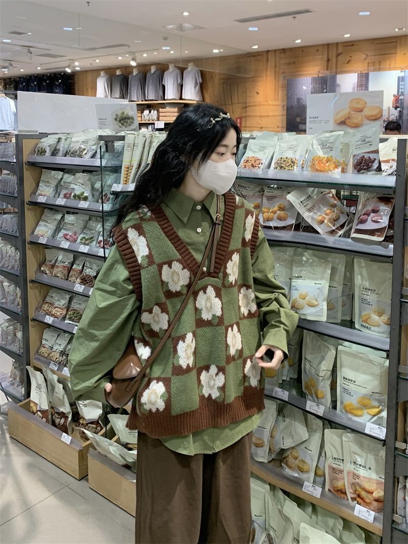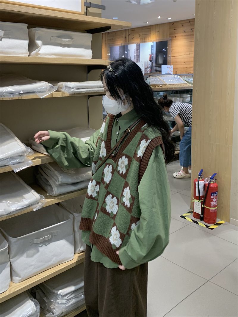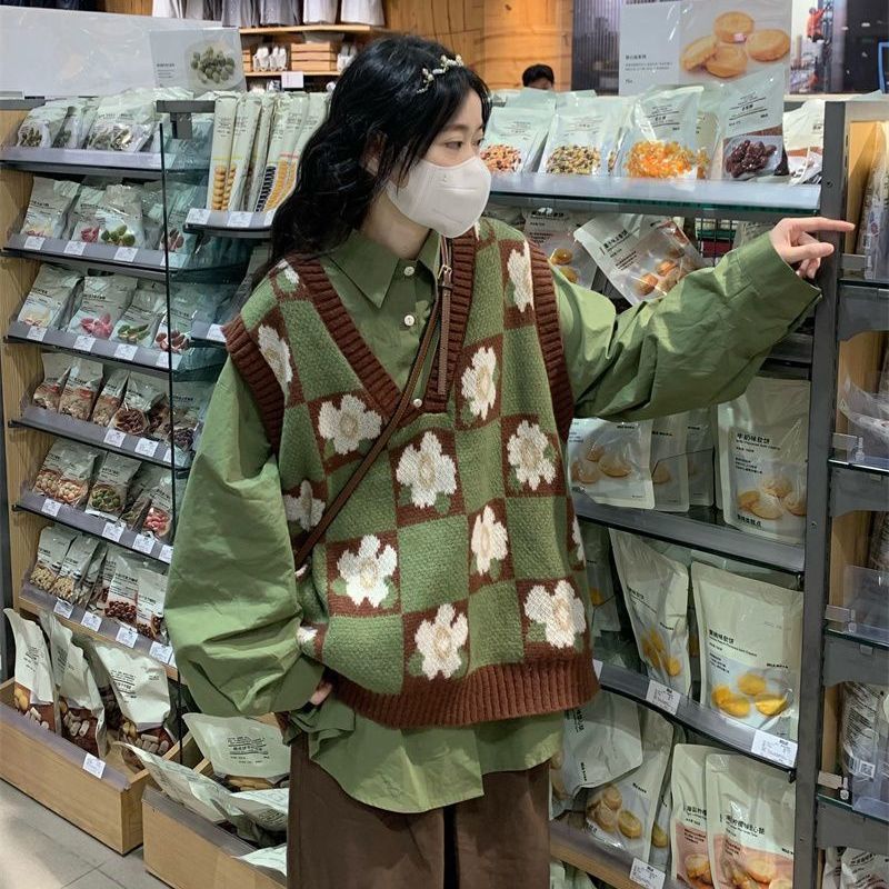 일본의 달콤한 격자 무늬 겉옷 꽃 니트 조끼 스웨터 여학생 + 녹색 탑 싱글 피스 세트스토어 가기