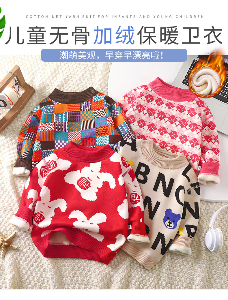 어린이 기모 두꺼운 스웨터 2023 가을/겨울 소년과 소녀를위한 새로운 뼈없는 긴 소매 니트 스웨터 따뜻한 스웨터스토어 가기