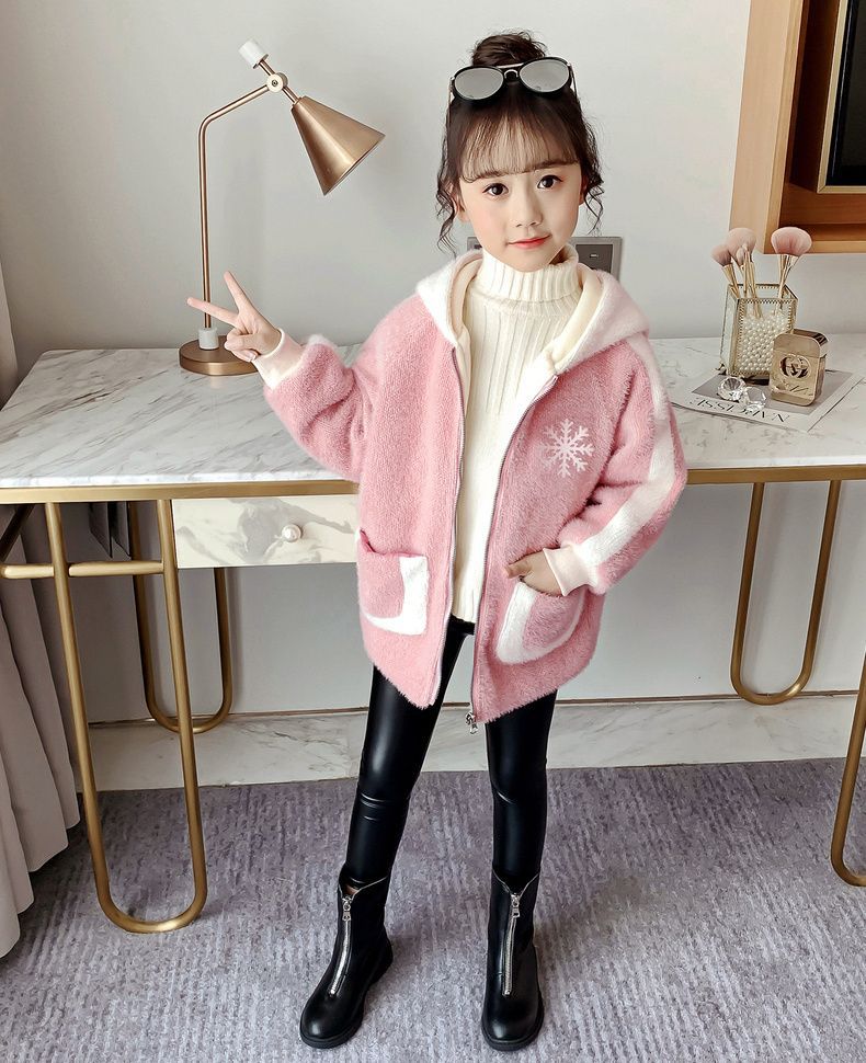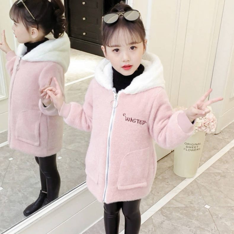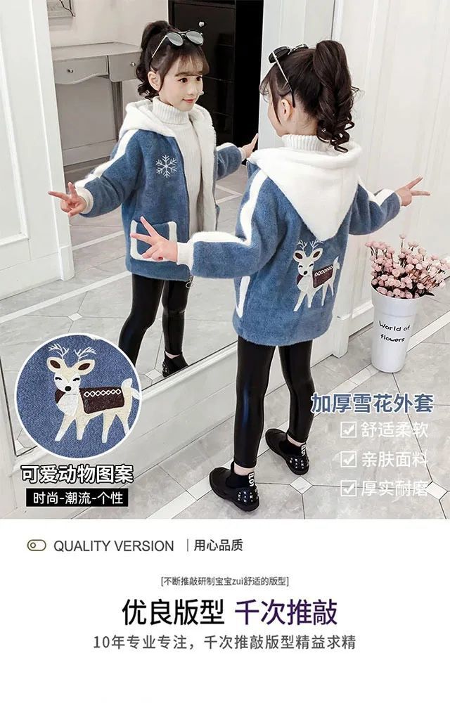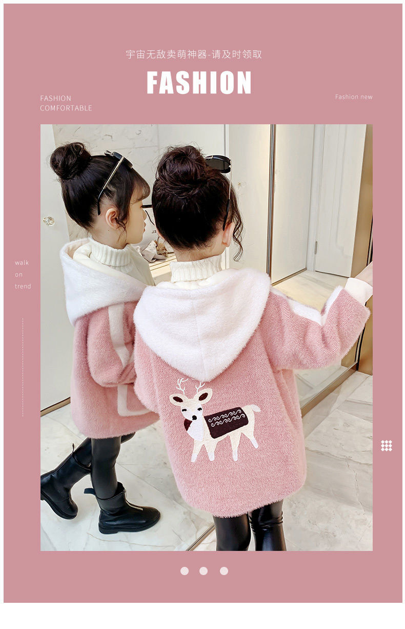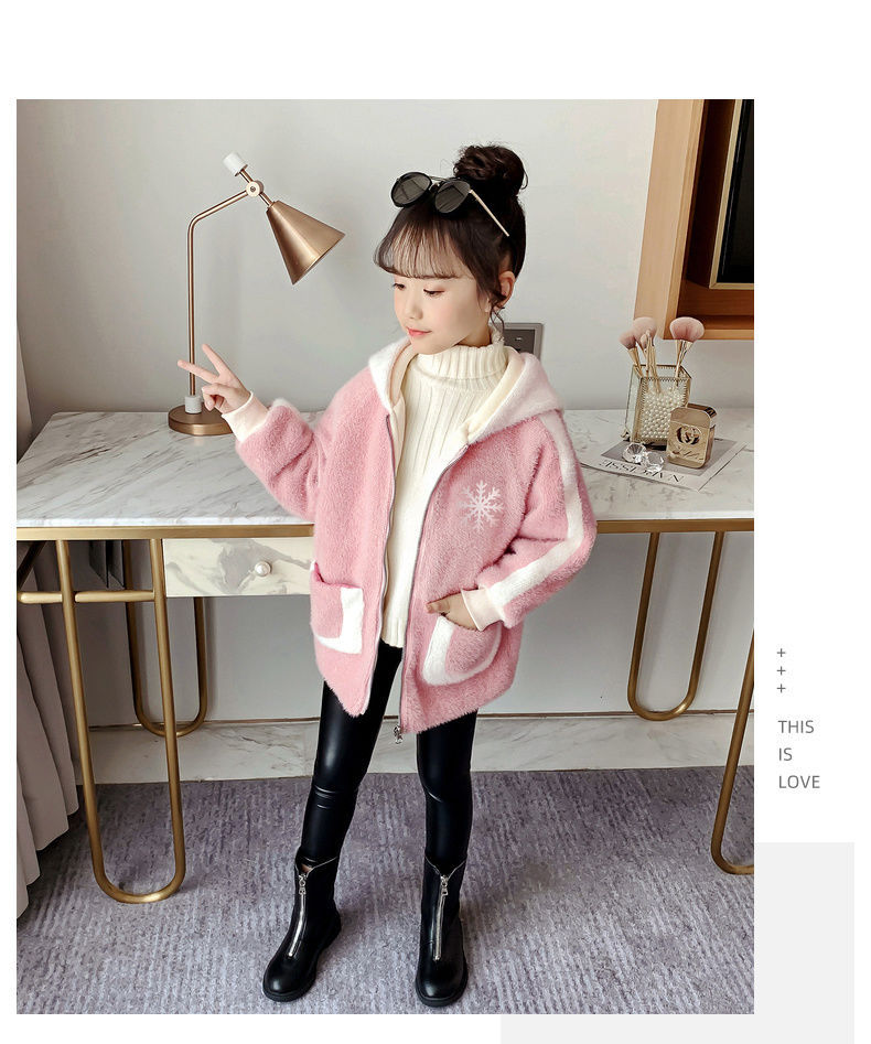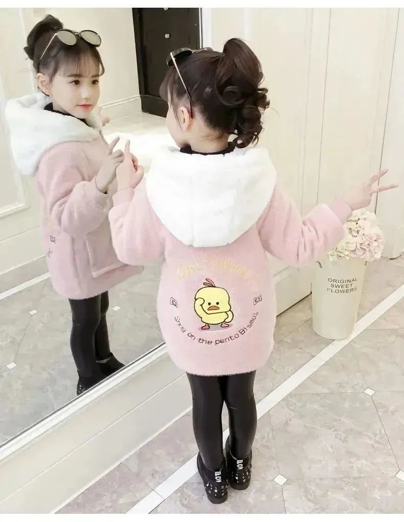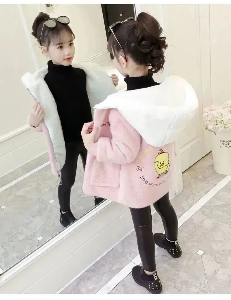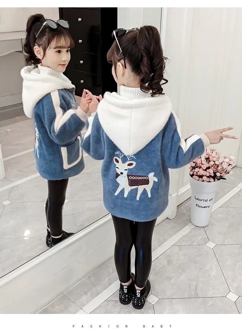 여아용 두꺼운 모직 스웨터 코트 아동용 2024 가을 겨울 새 스타일 작은 오리 따뜻하고 세련된 후드 두꺼운 탑스토어 가기