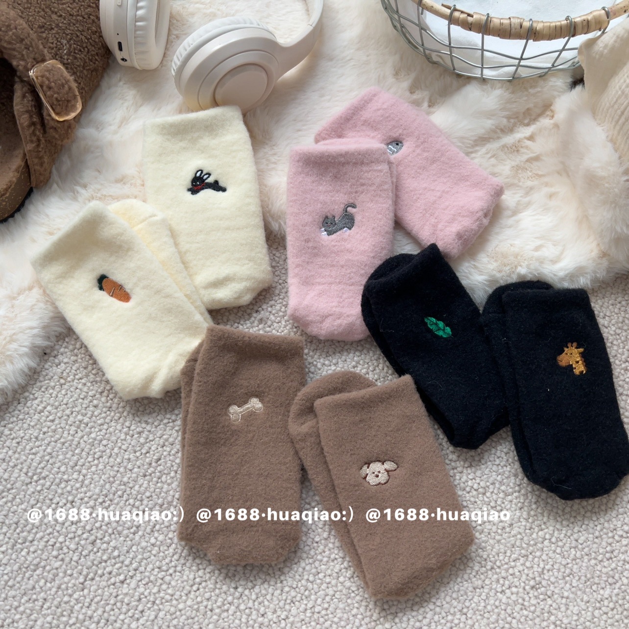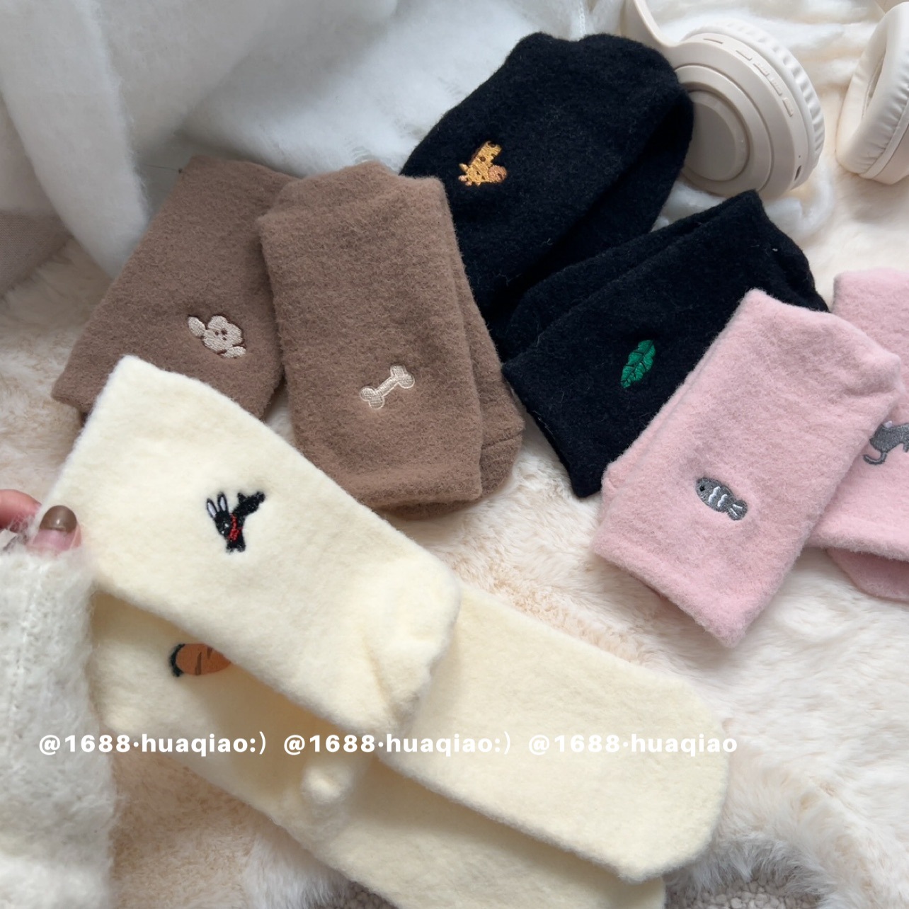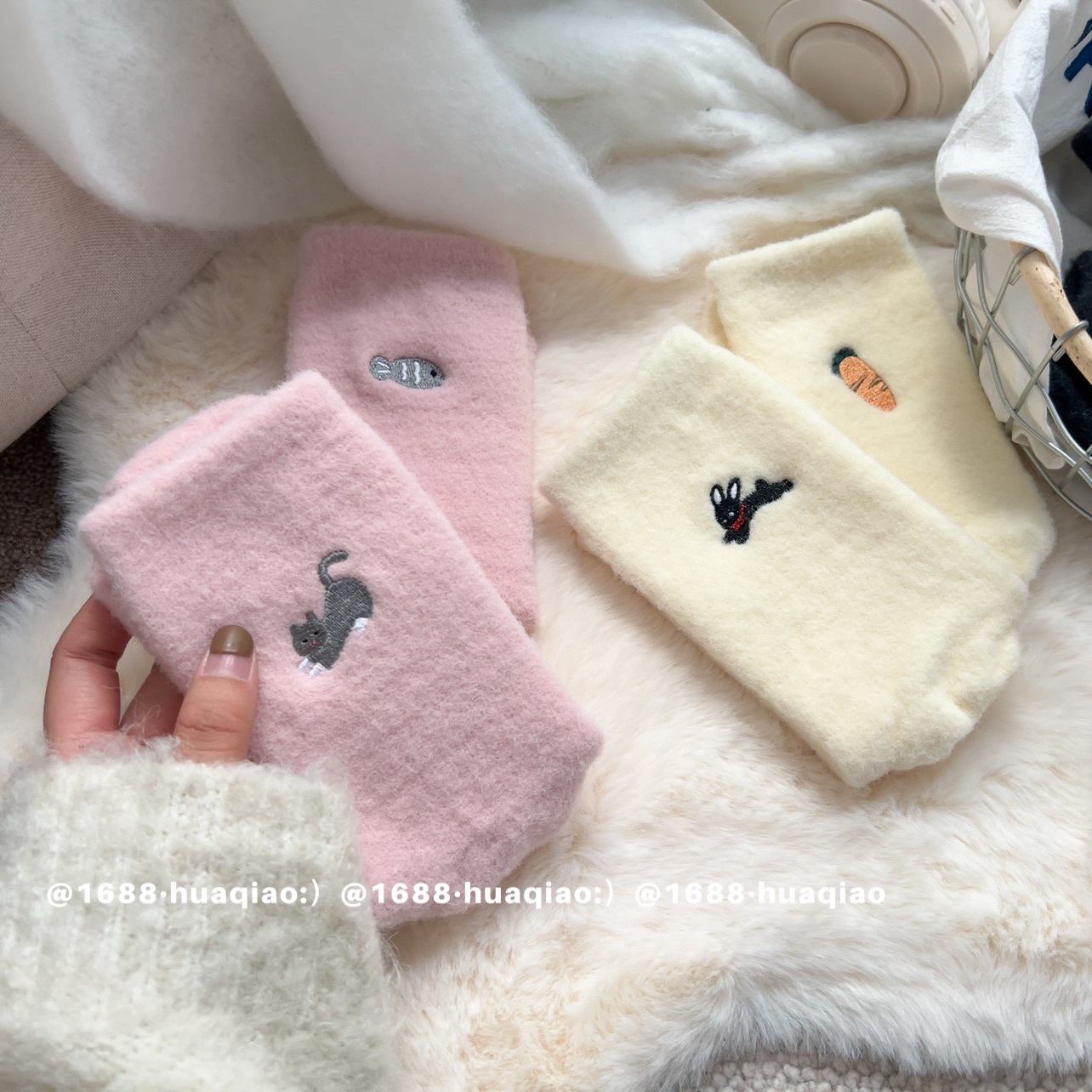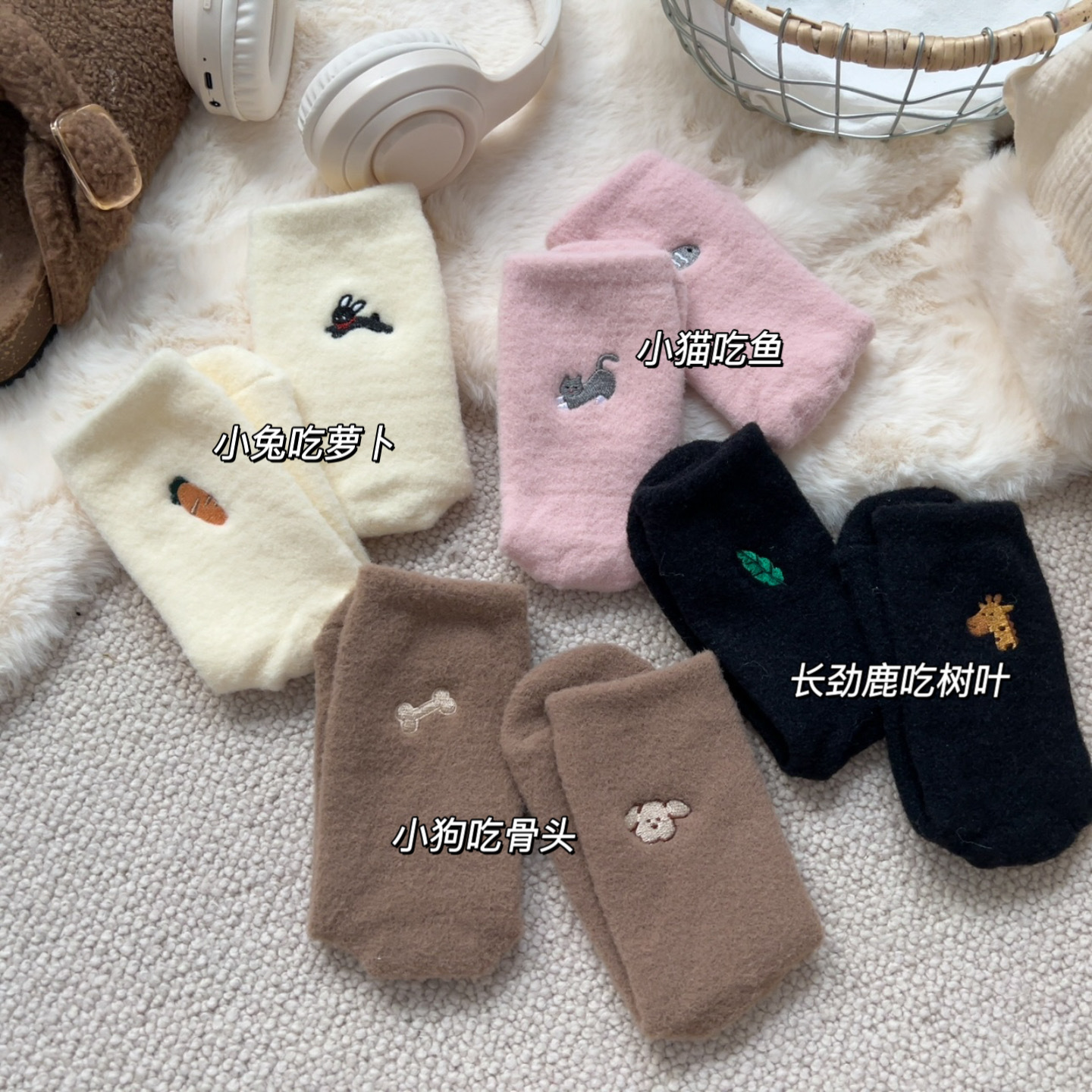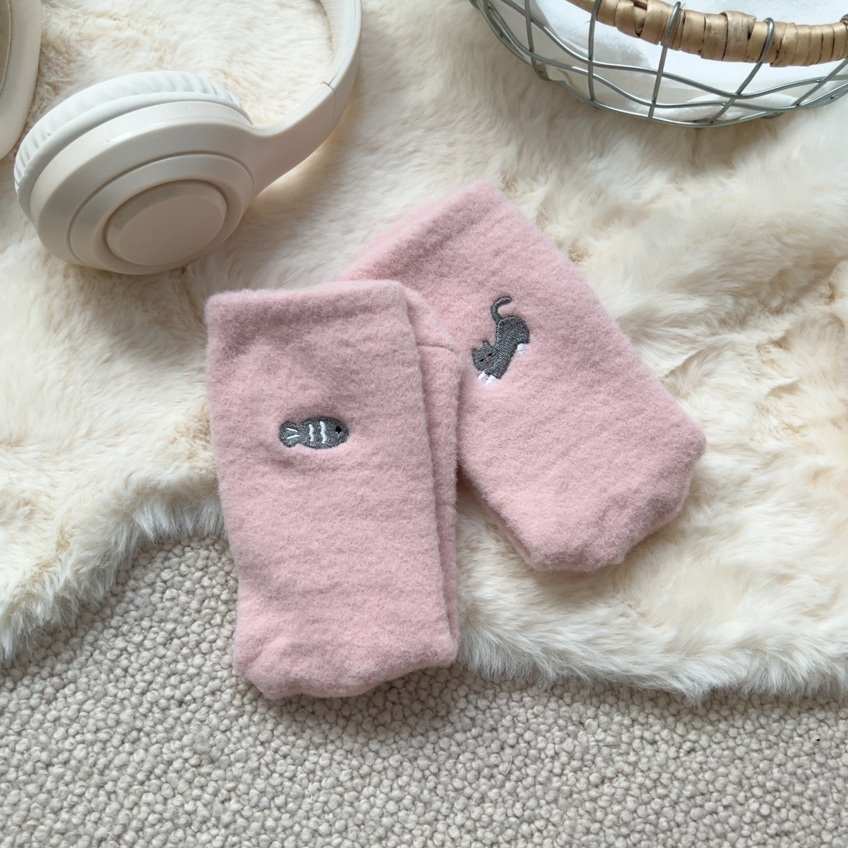 고양이 물고기 먹는 양말 여자의 가을과 겨울 새로운 동대문 기모 두꺼운 Ao 벨벳 일본 중간 자수 따뜻한 달 양말