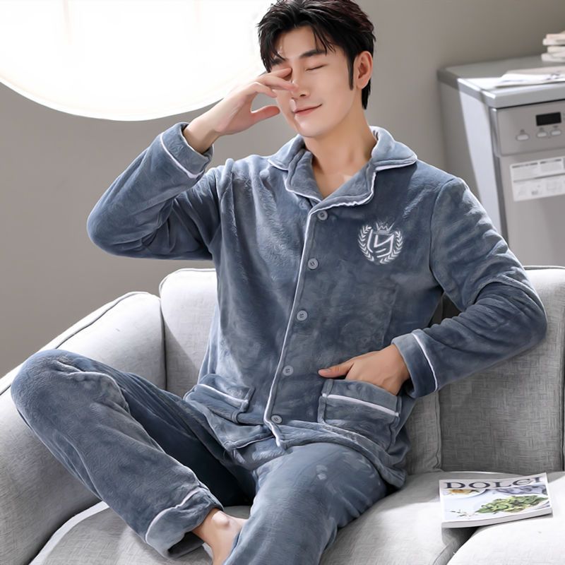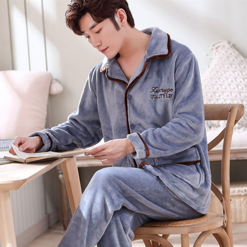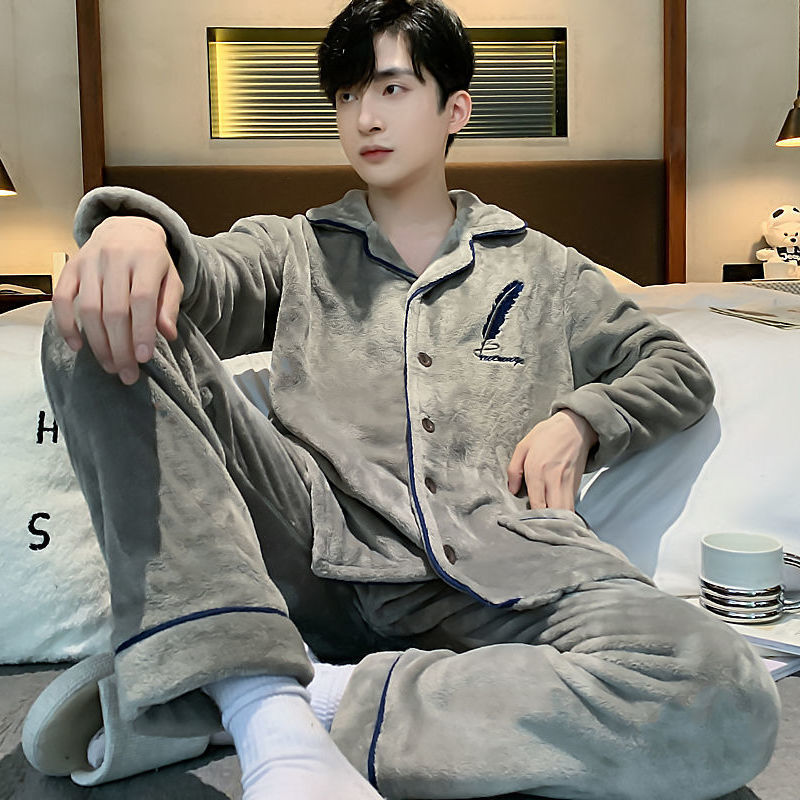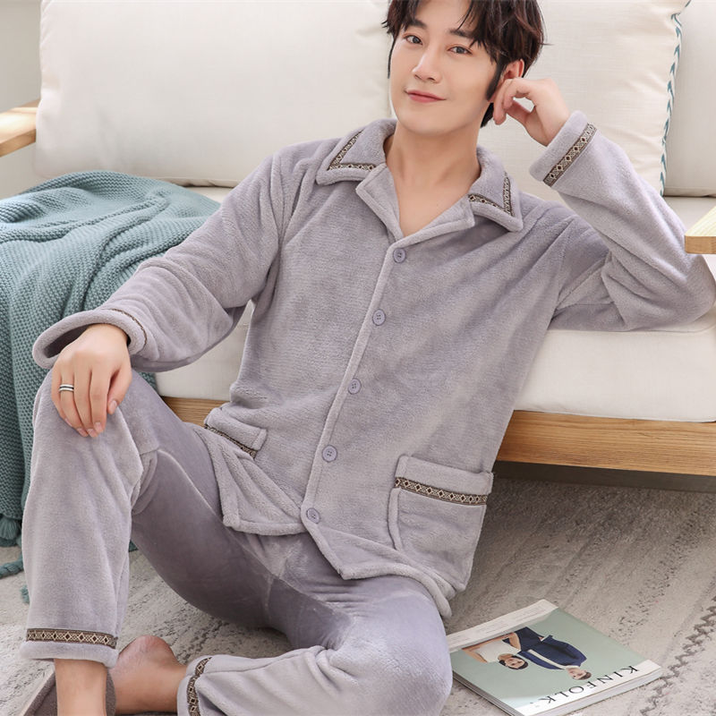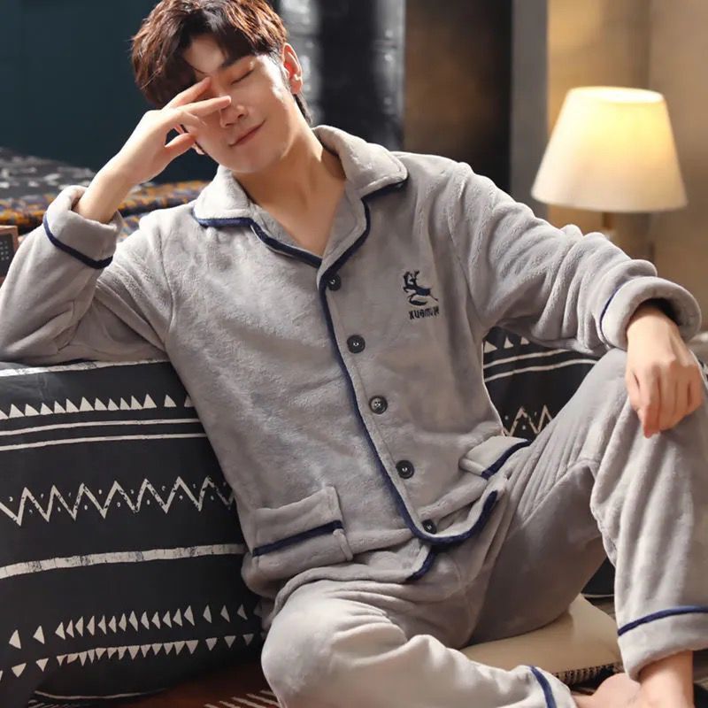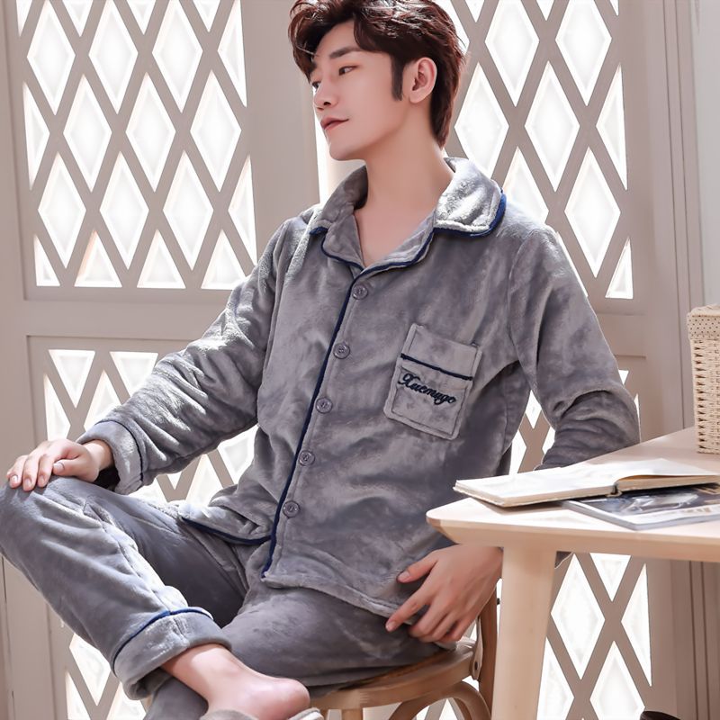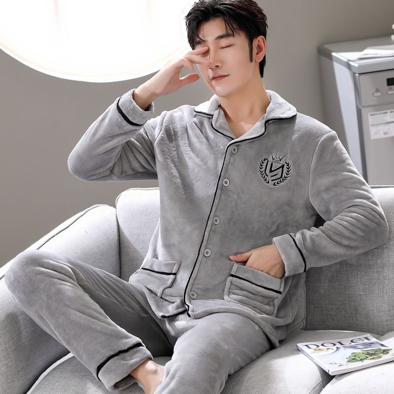 Shanlidadi 가을과 겨울 남성 산호 양털 잠옷 두꺼운 기모 겨울 플란넬 따뜻한 카디건 세트