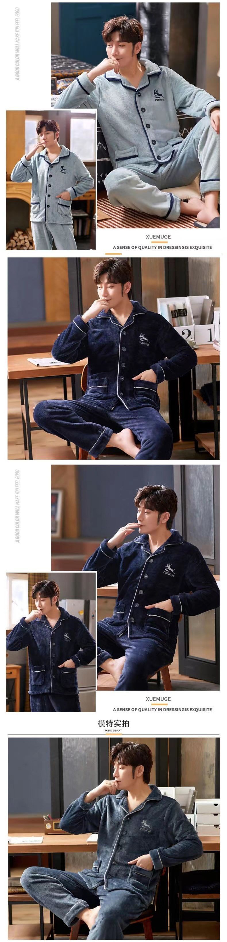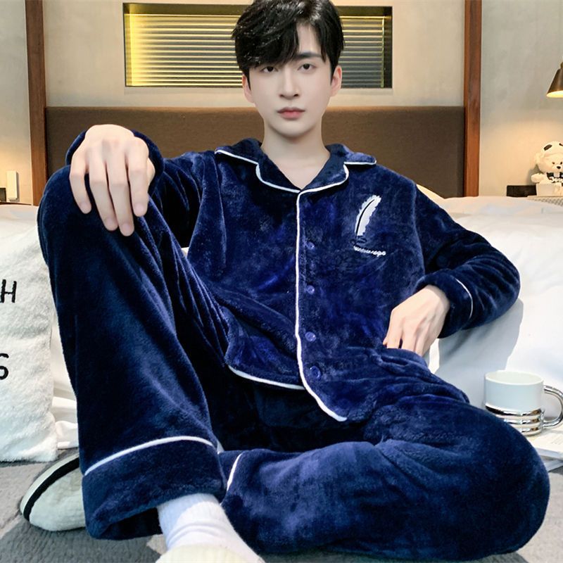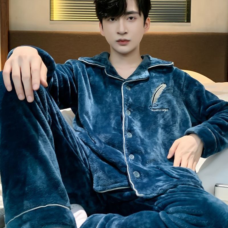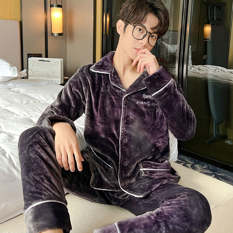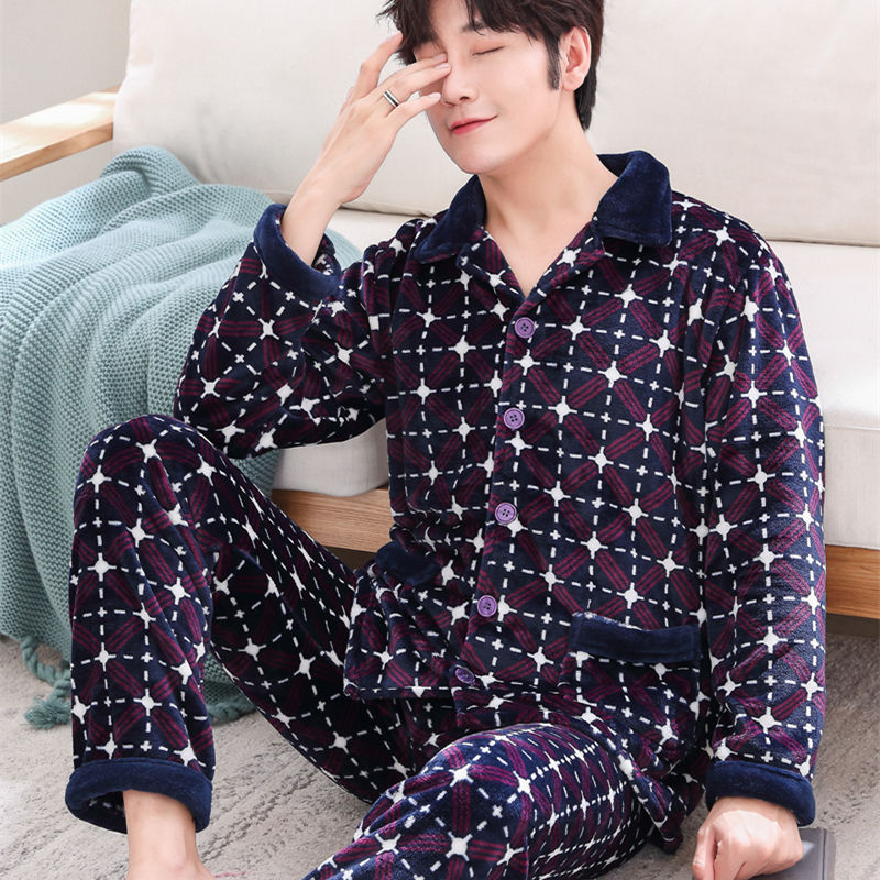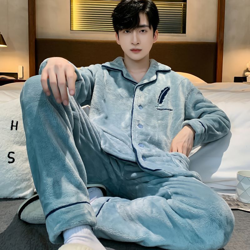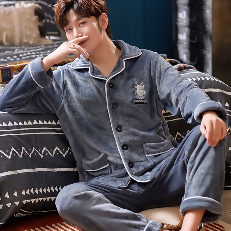 Shanlidadi 가을과 겨울 남성 산호 양털 잠옷 두꺼운 기모 겨울 플란넬 따뜻한 카디건 세트