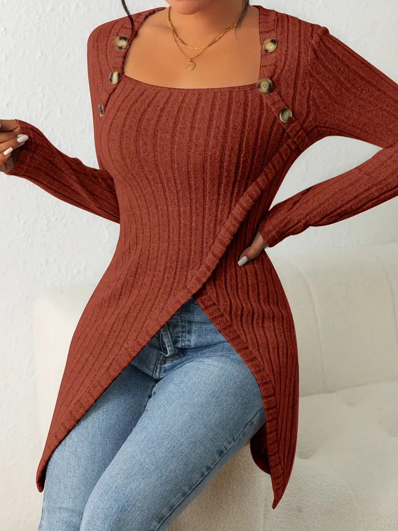 유럽과 미국 크로스 보더 여성용 2023 솔리드 컬러 롱 슬리브 니트 스퀘어 칼라 불규칙한 티셔츠 탑 아마존 핫 세일