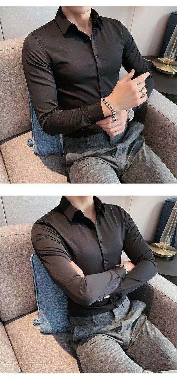 스트레치 긴팔 셔츠 슬림 핏 얇은 검은 셔츠 비즈니스 캐주얼 전문 원피스 작업복 남성용 셔츠