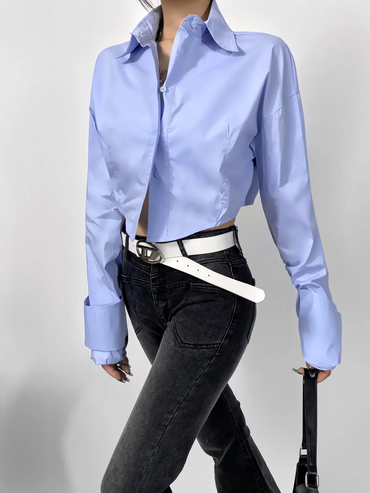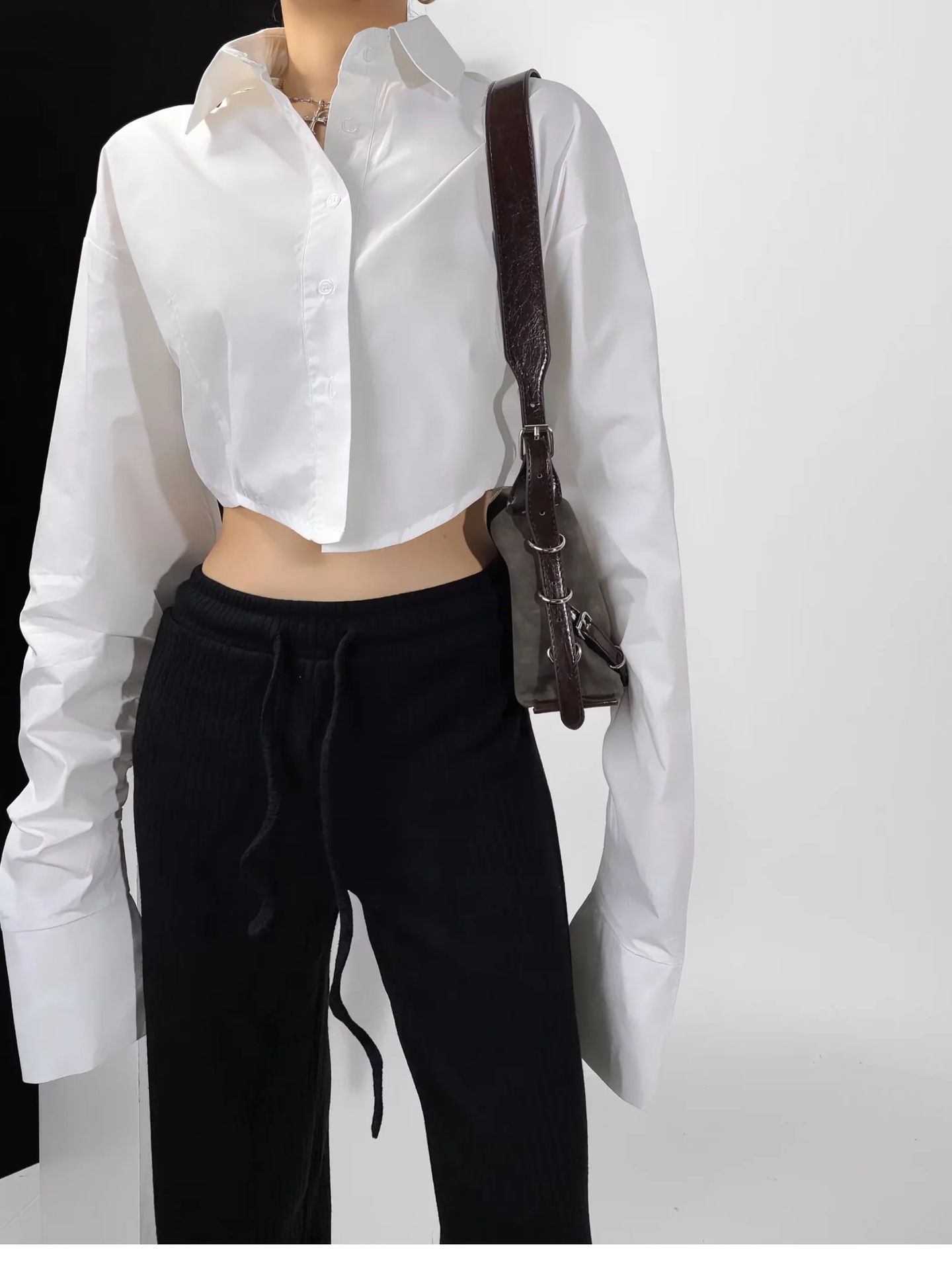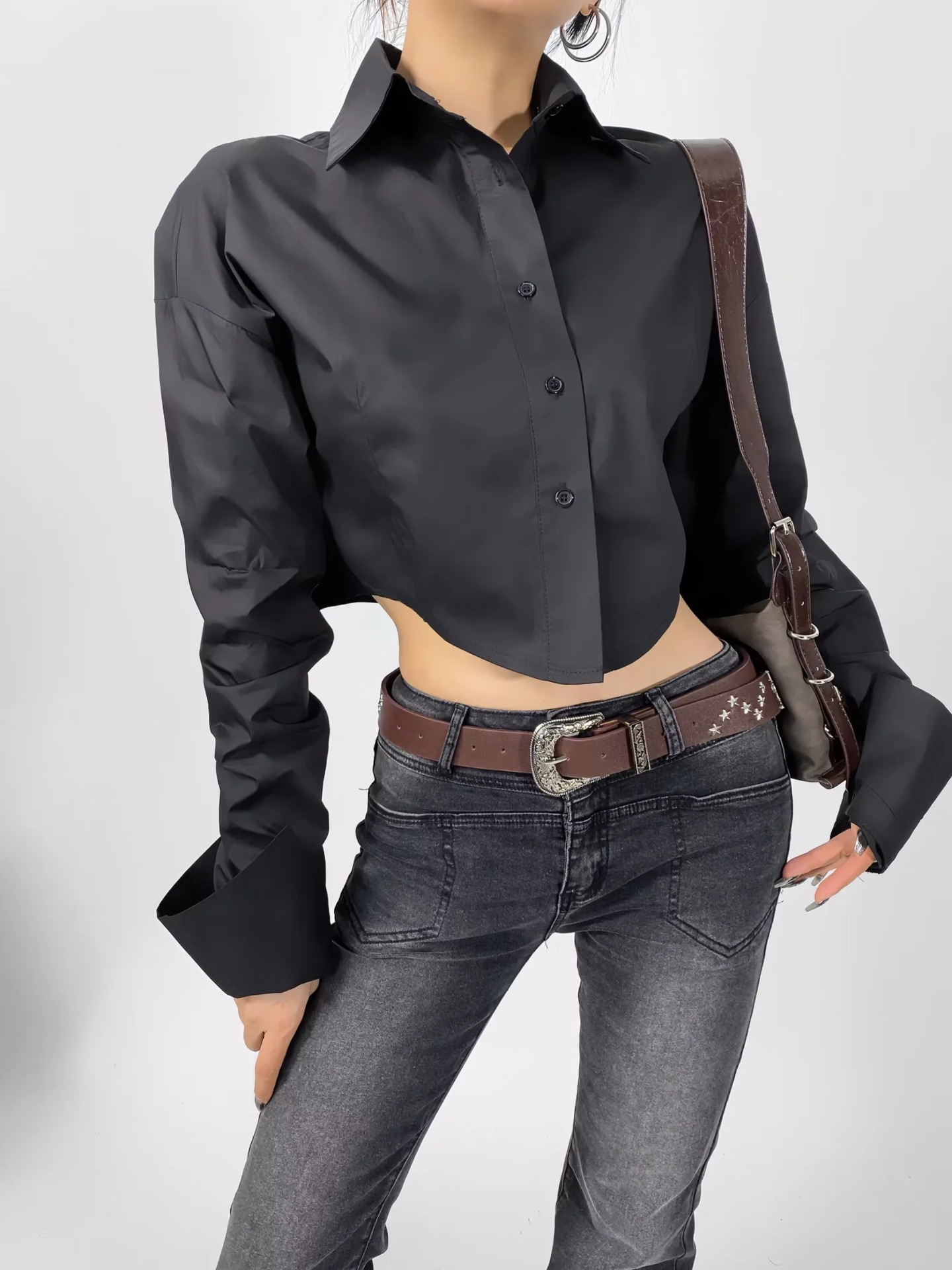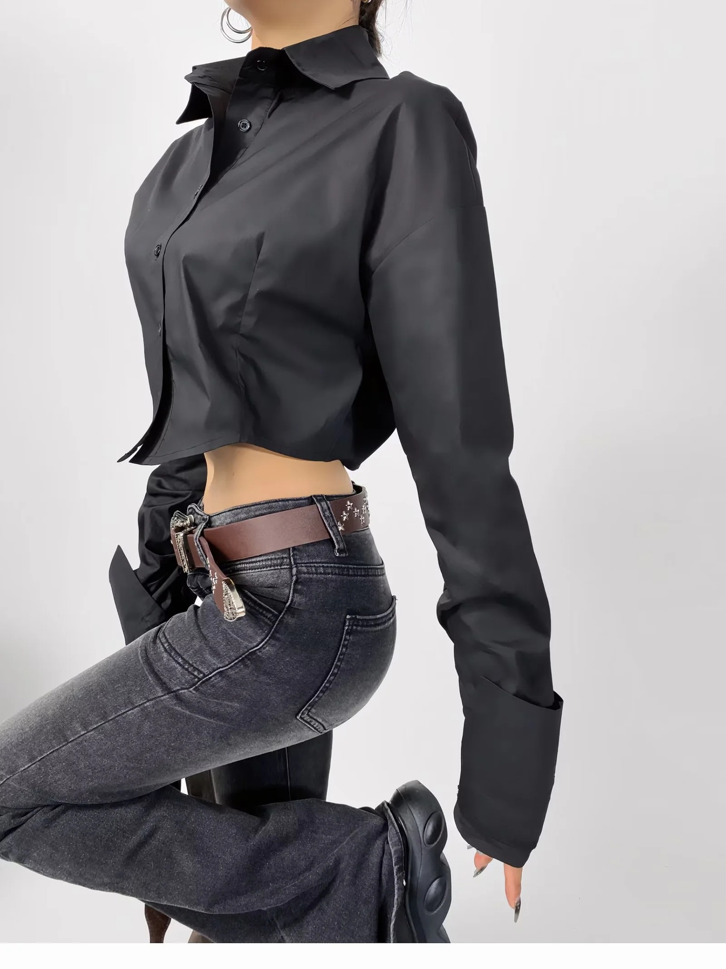 가을 2023 새로운 스파이스 걸 라펠 싱글 브레스트 짧은 배꼽 오픈 카디건 여성용 느슨한 캐주얼 주름 슈퍼 긴 소매 셔츠스토어 가기