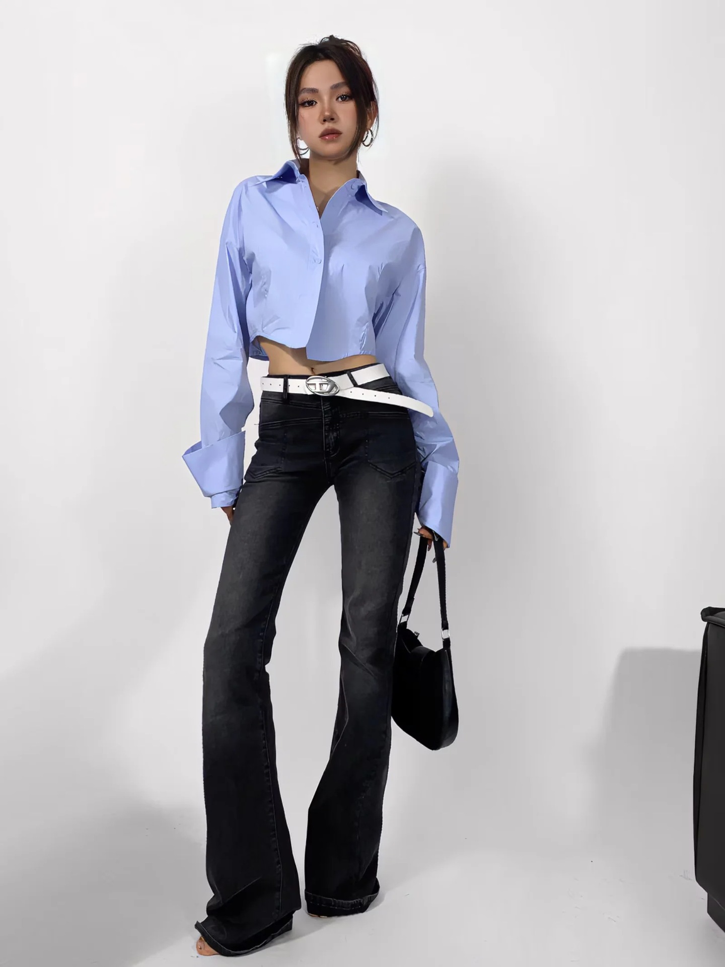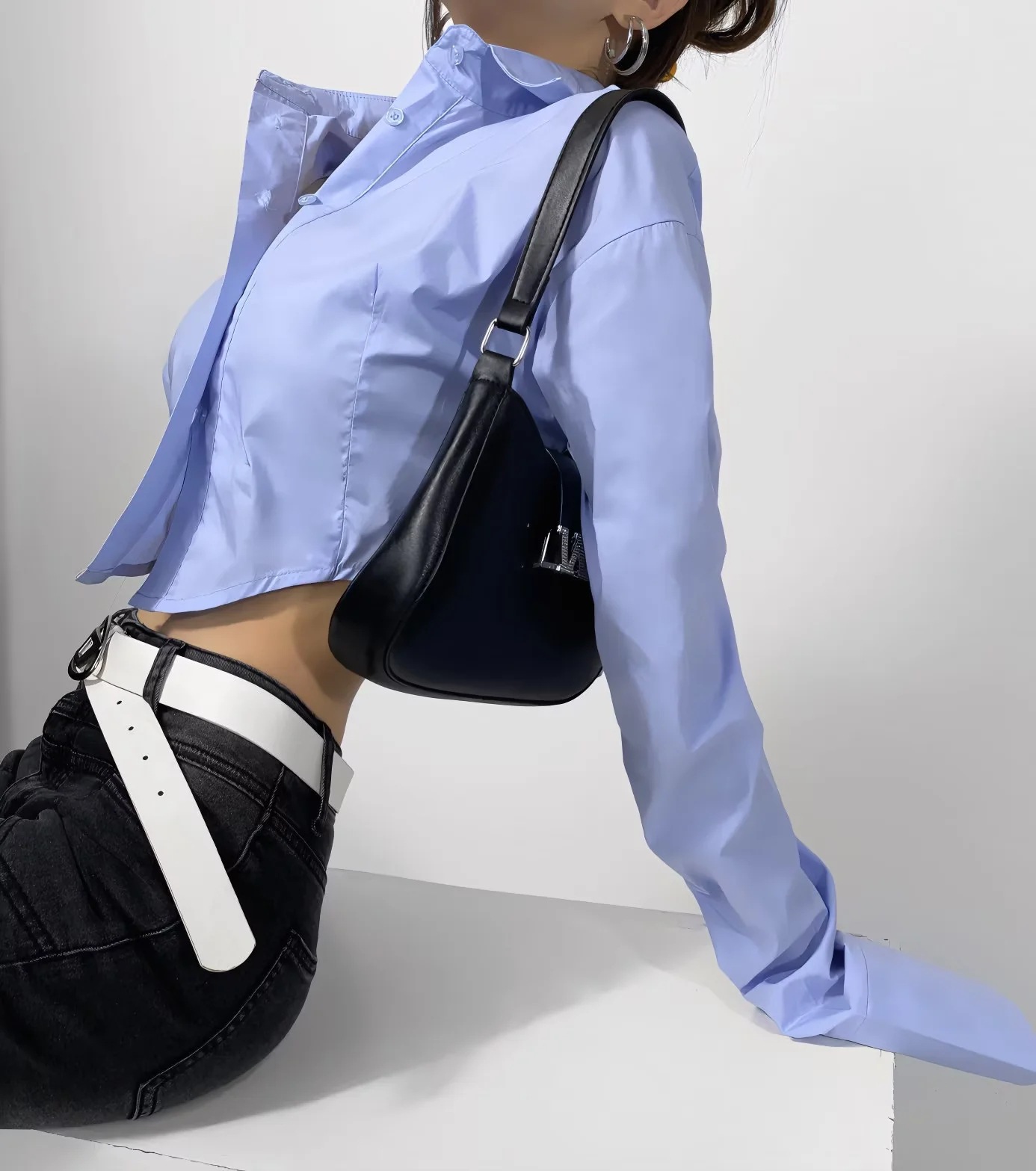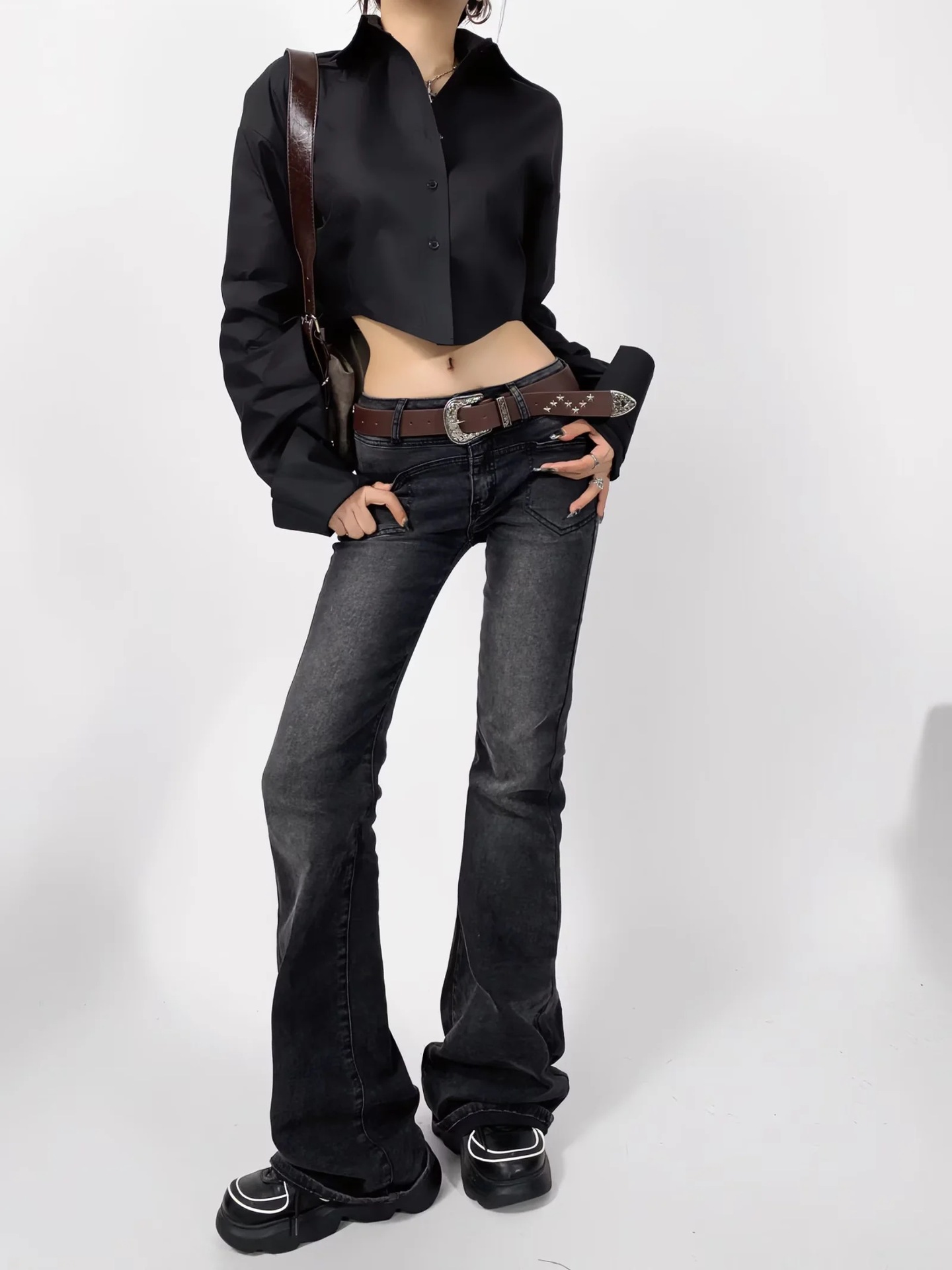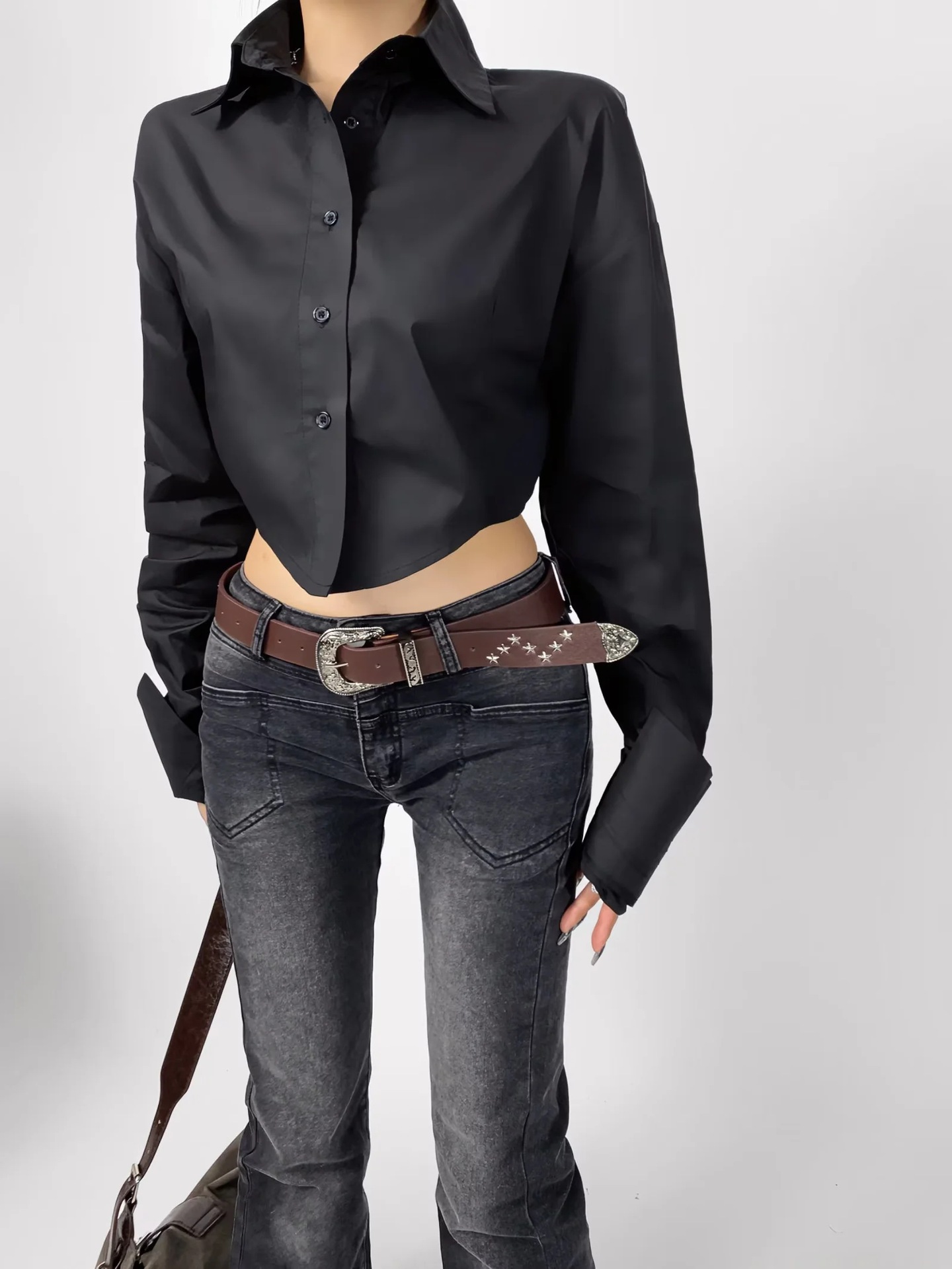가을 2023 새로운 스파이스 걸 라펠 싱글 브레스트 짧은 배꼽 오픈 카디건 여성용 느슨한 캐주얼 주름 슈퍼 긴 소매 셔츠스토어 가기