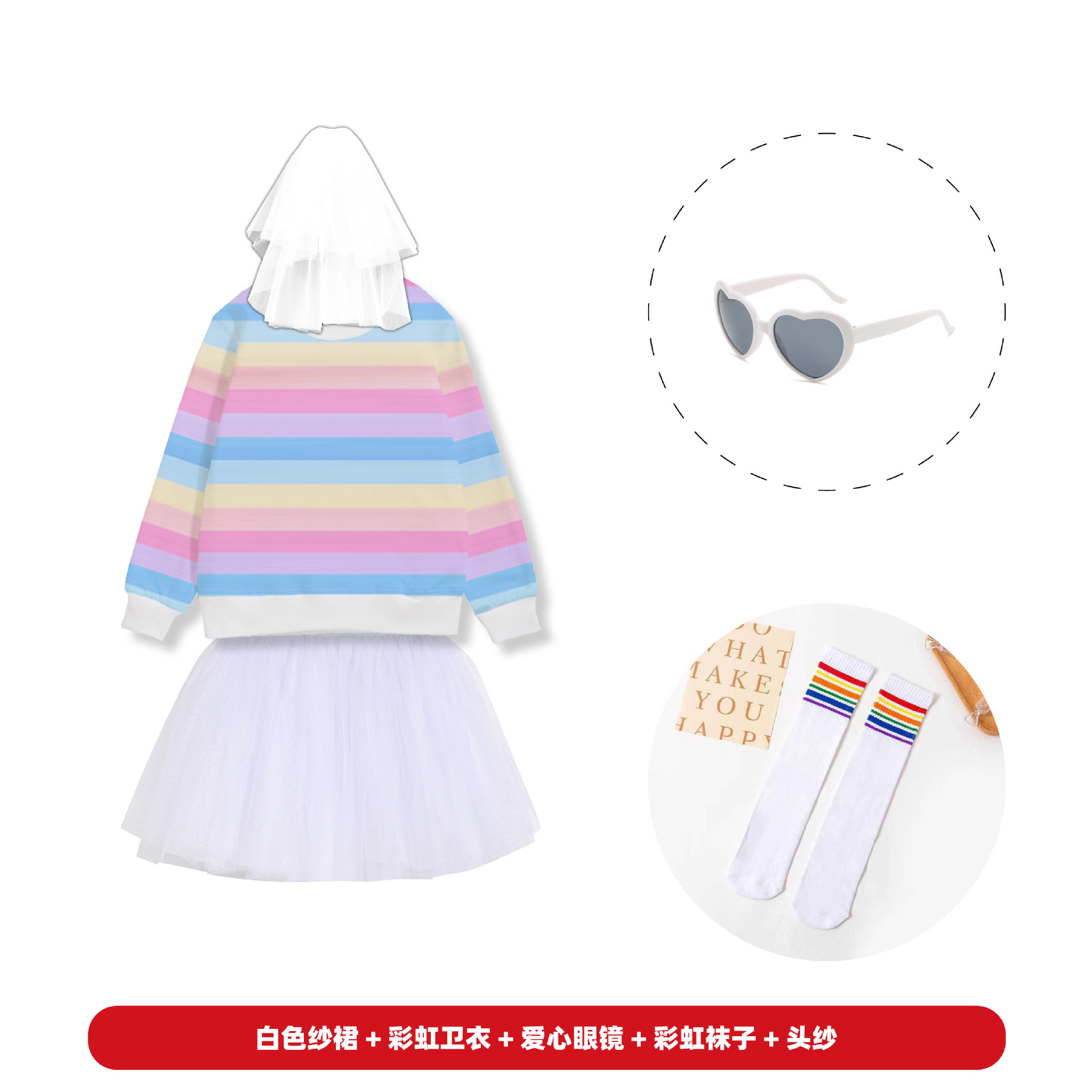 • 레인보우 조끼 + 흰색 조끼 + 베일 + 흰색 프레임 안경 + 흰색 양말