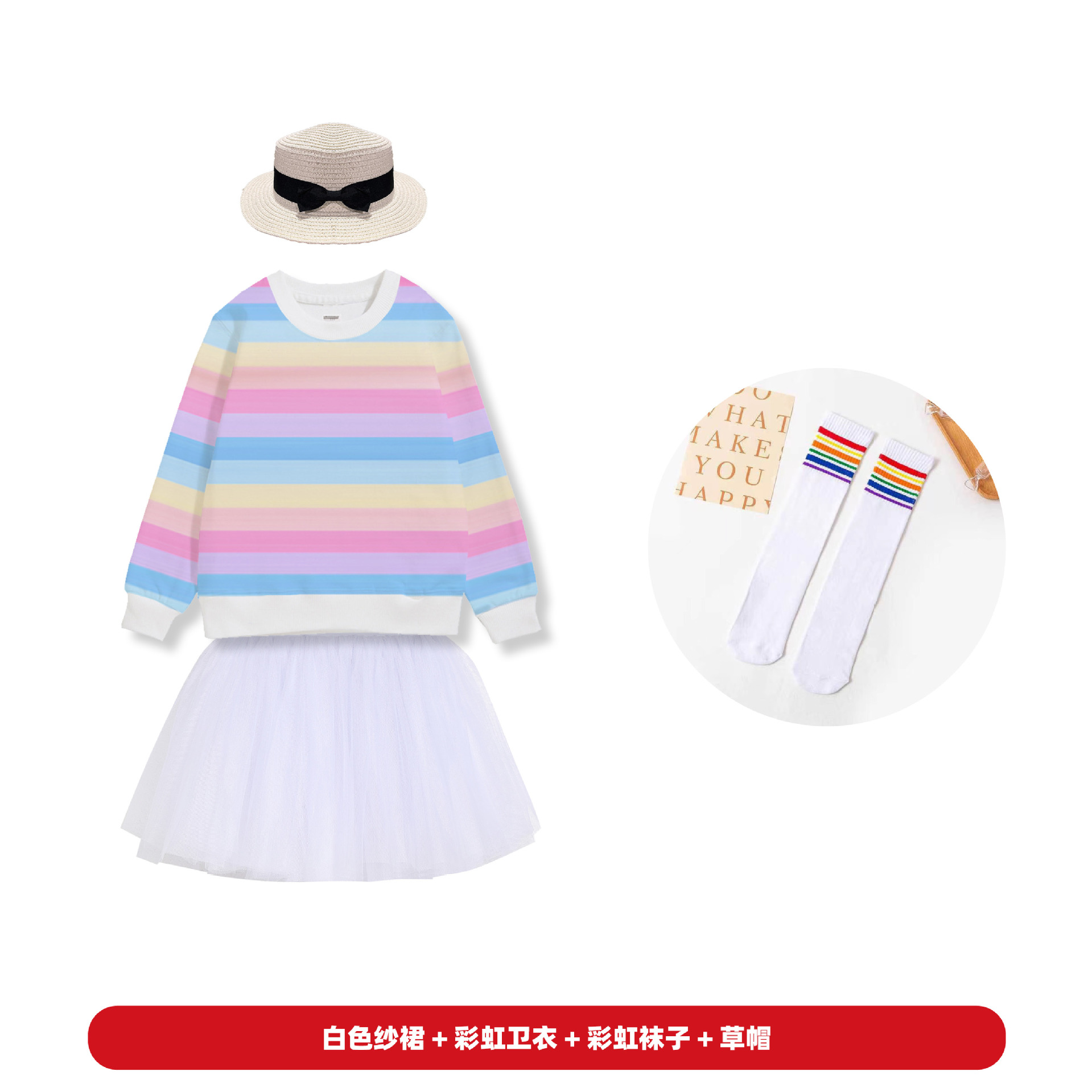 • 레인보우 스웨터 + 화이트 투투 스커트 + 밀짚모자 + 레인보우 양말