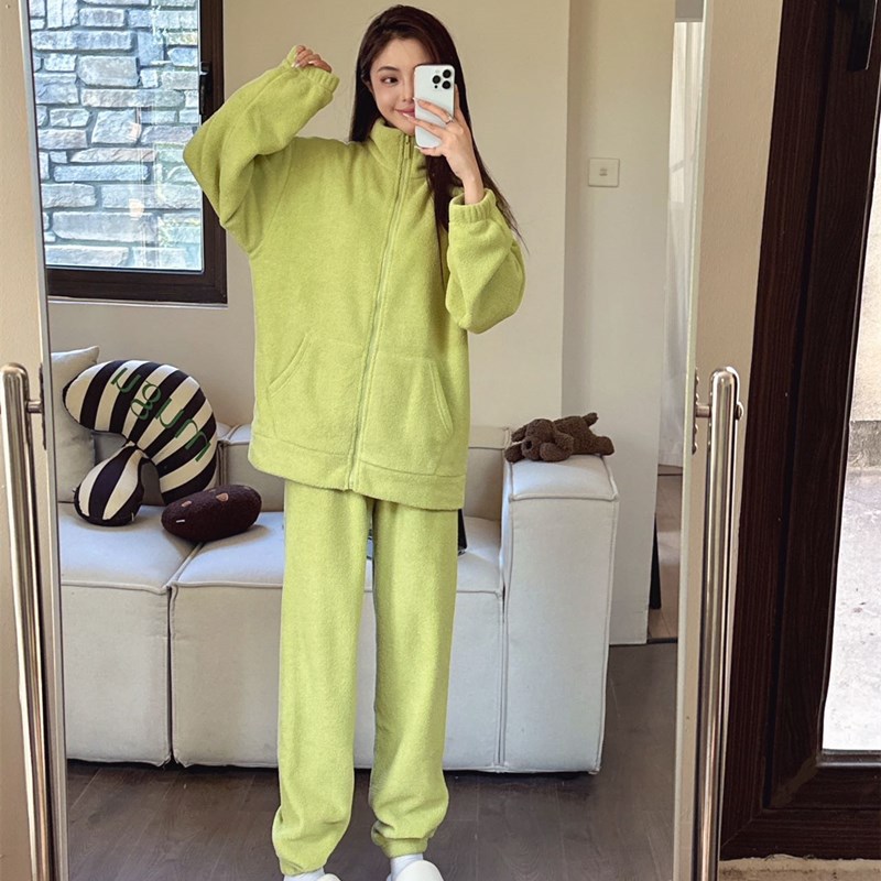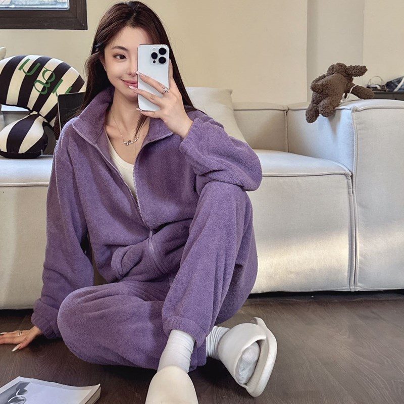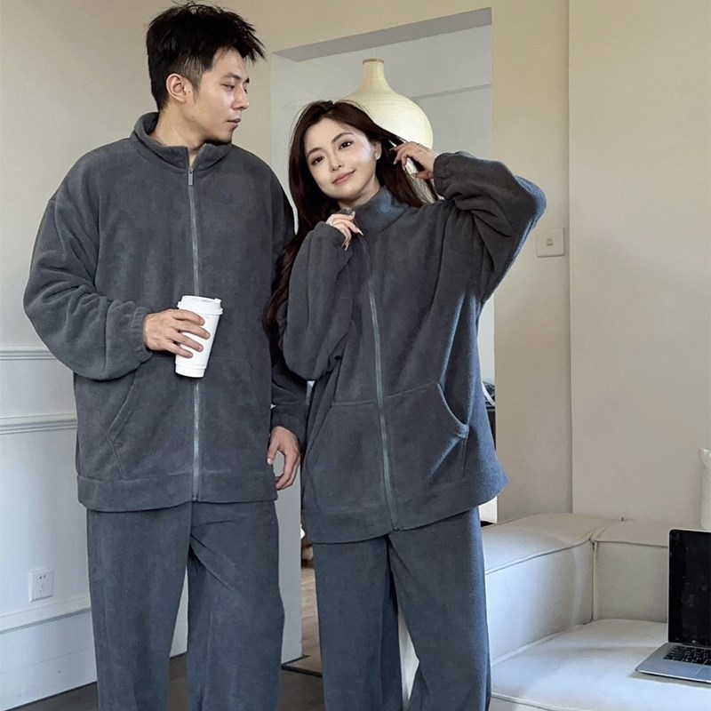가을과 겨울 따뜻한 벨벳 지퍼 커플 잠옷 여자의 공주 스타일 소년을위한 따뜻한 고양이 벨벳 높은 칼라 지퍼 세트스토어 가기