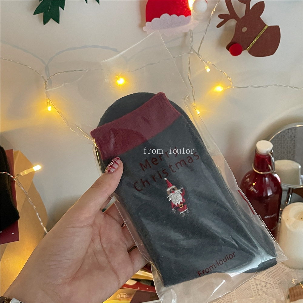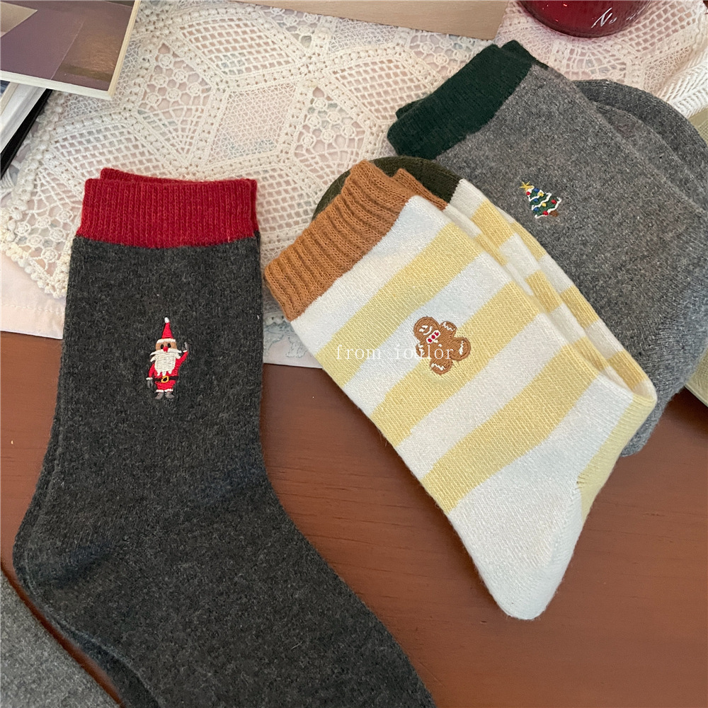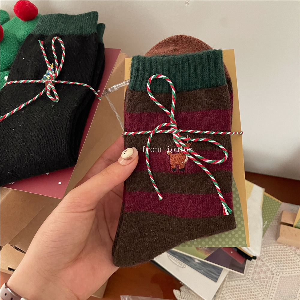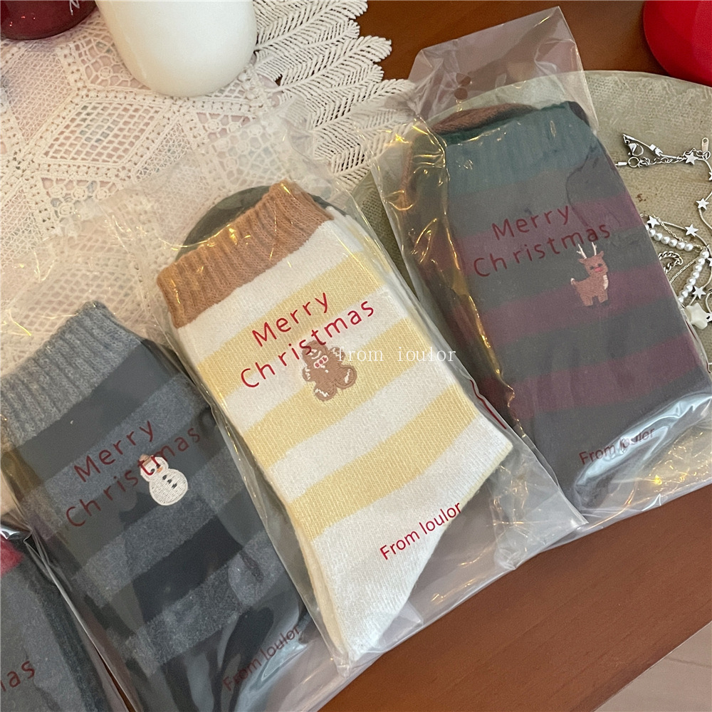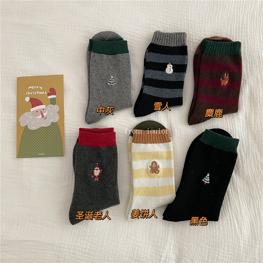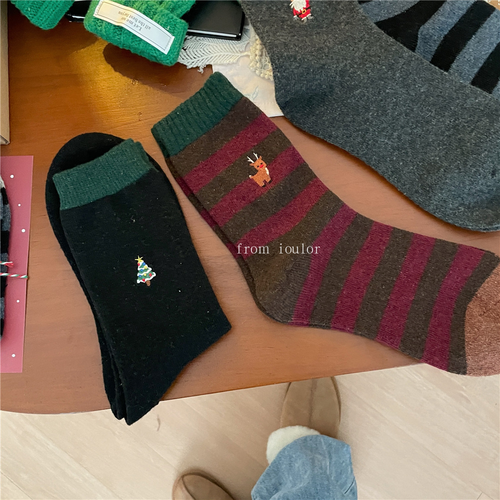 IOULOR 새로운 크리스마스 양말 양모 양말 눈사람 산타 클로스 스타일 중간 길이 양말 스트라이프 여성 양말