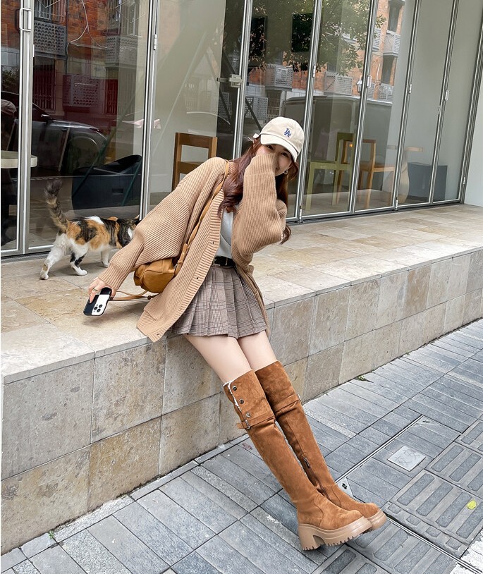 두꺼운 밑창 8cm 키높이 롱부츠 슬림 탄력 스노우 부츠 투웨이 접이식 하이탑 오버니 부츠 여성용