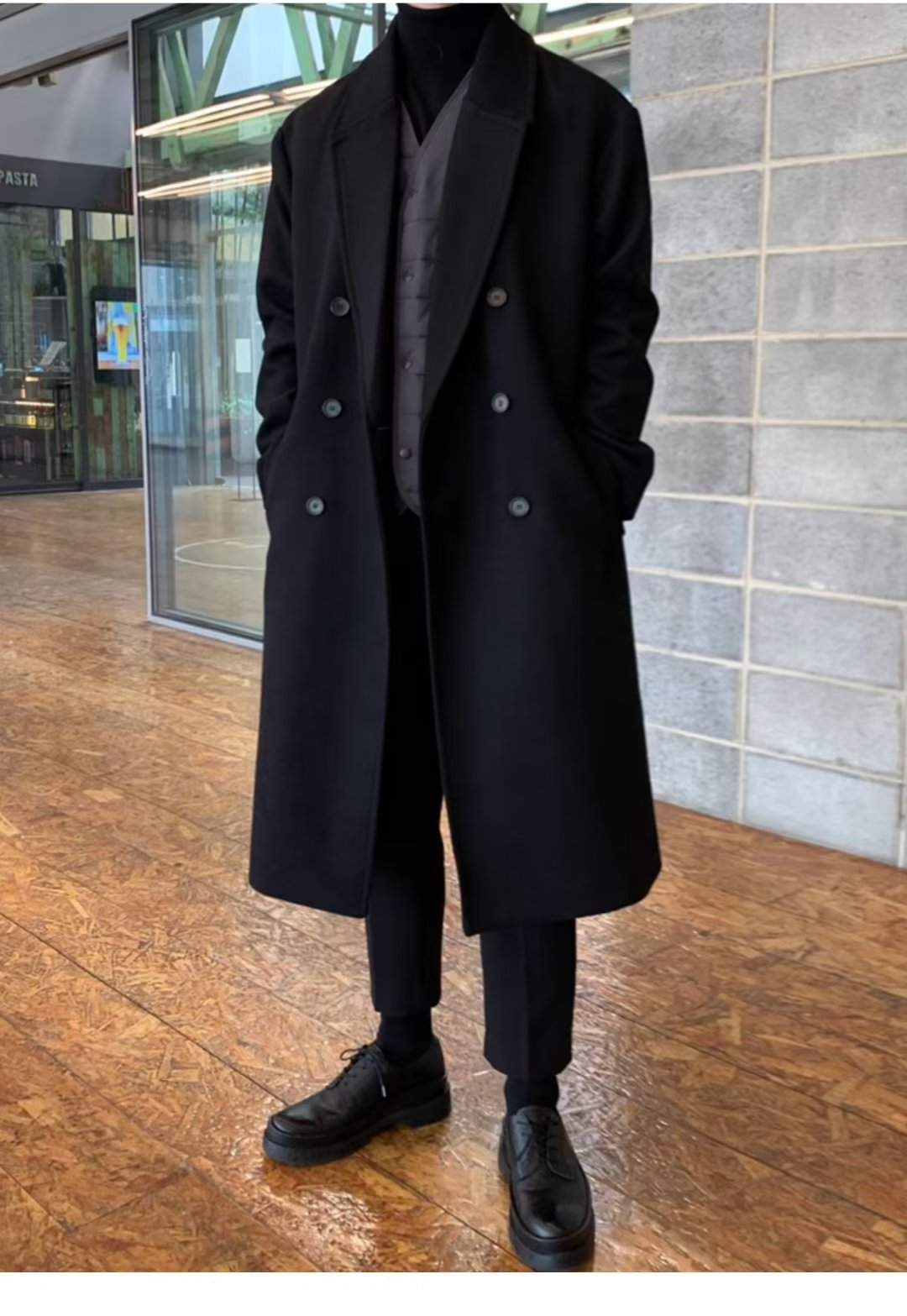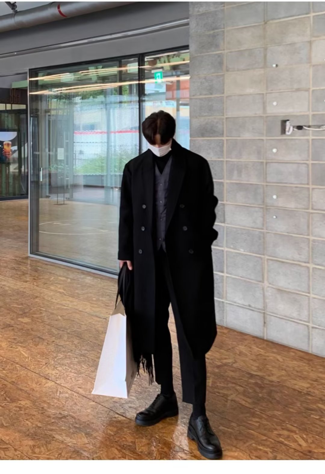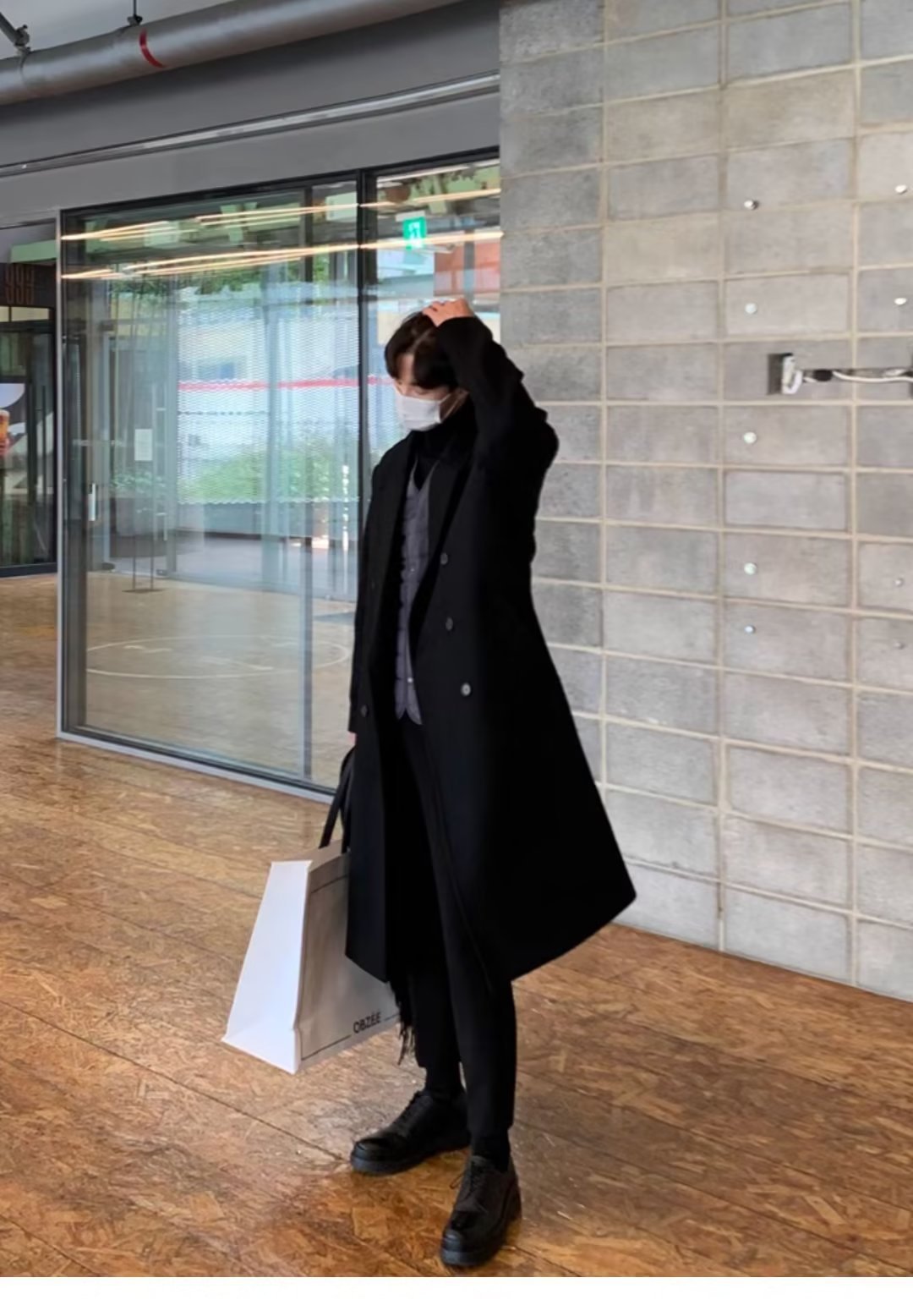 2024 겨울 한국 스타일의 간단한 단색 더블 레이어 디자인 두꺼운 모직 긴 남성 코트 루안 잘 생긴 어깨 패드 트렌치 코트스토어 가기