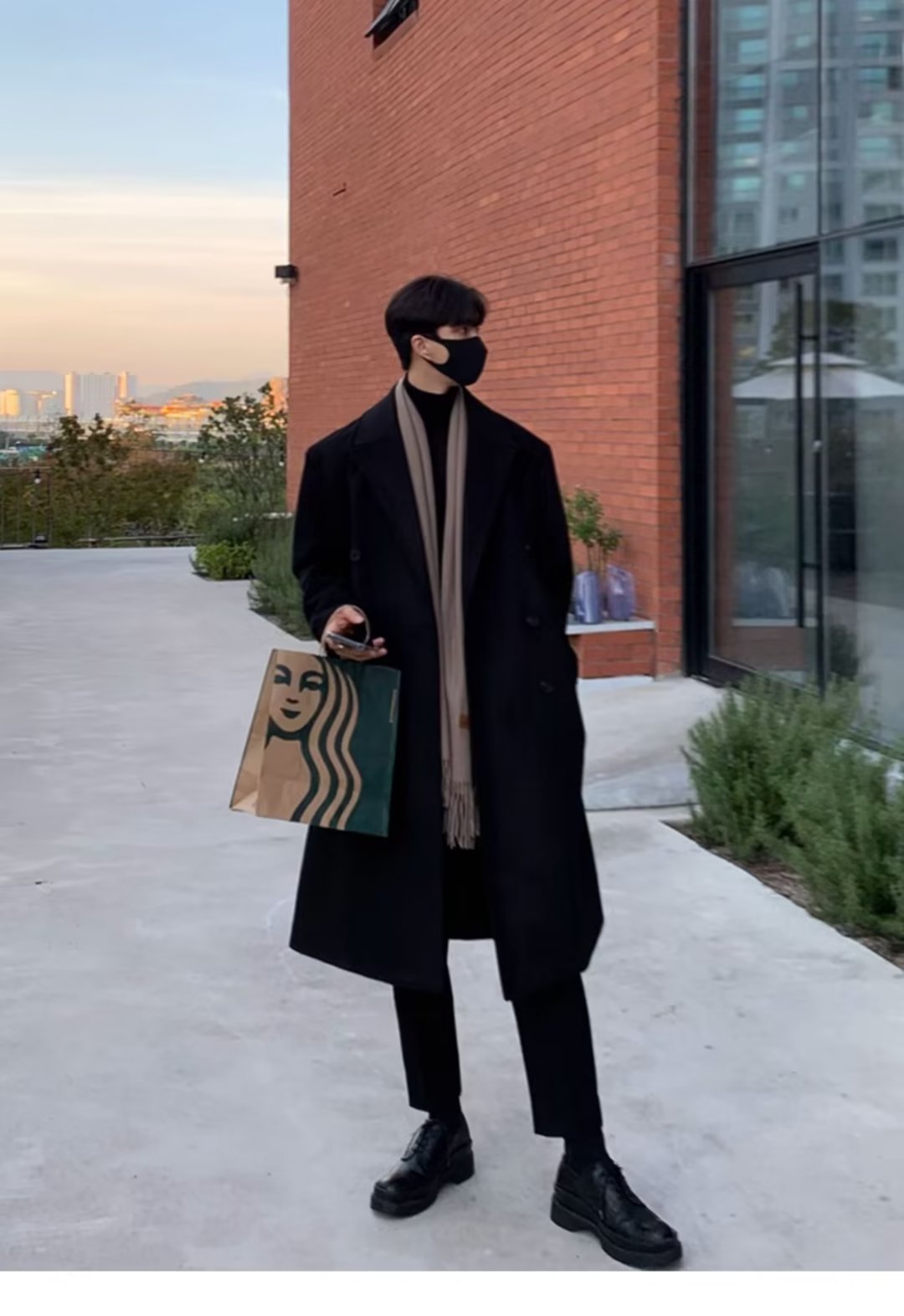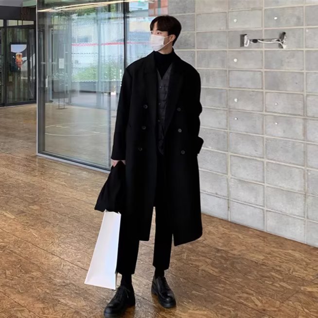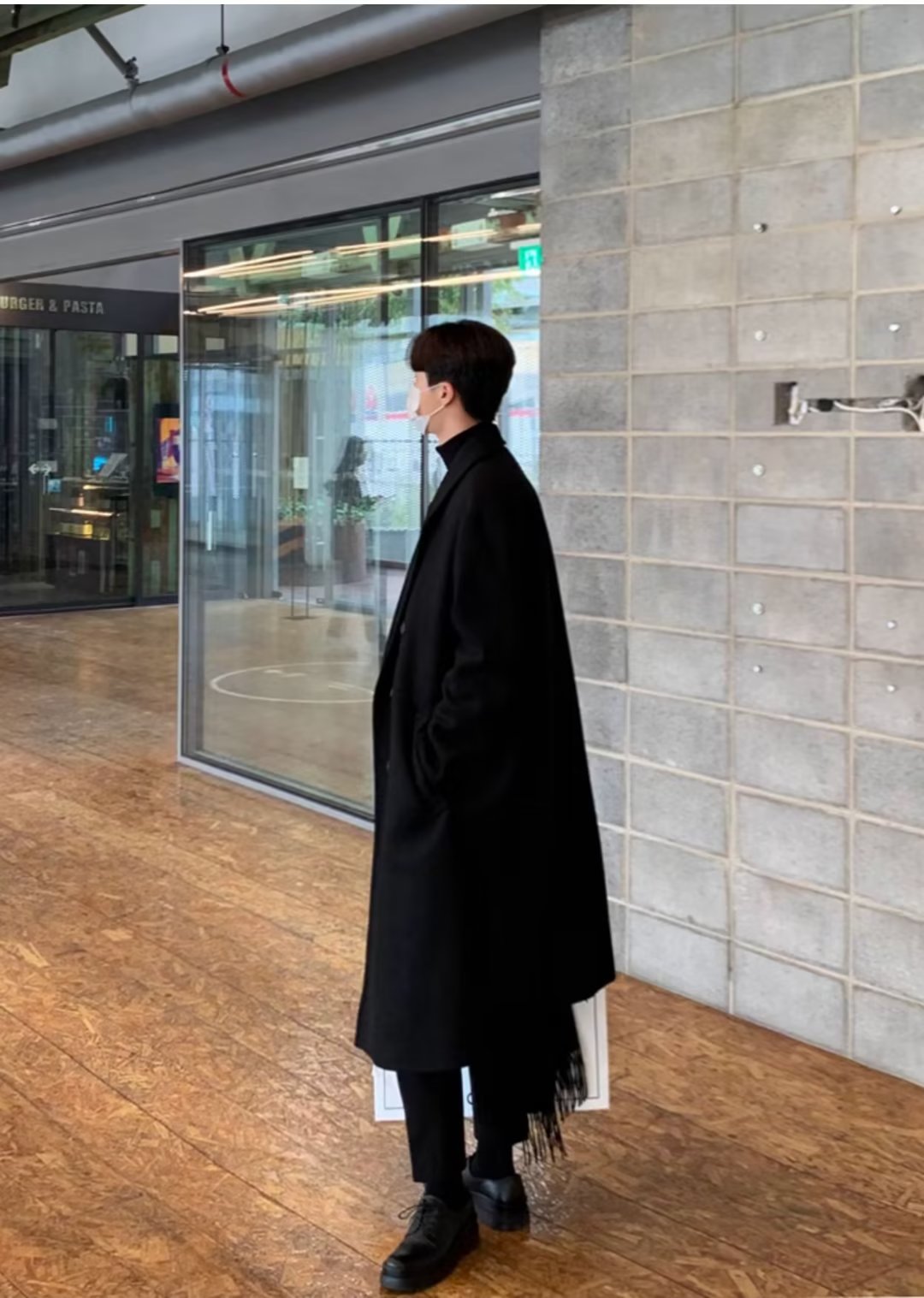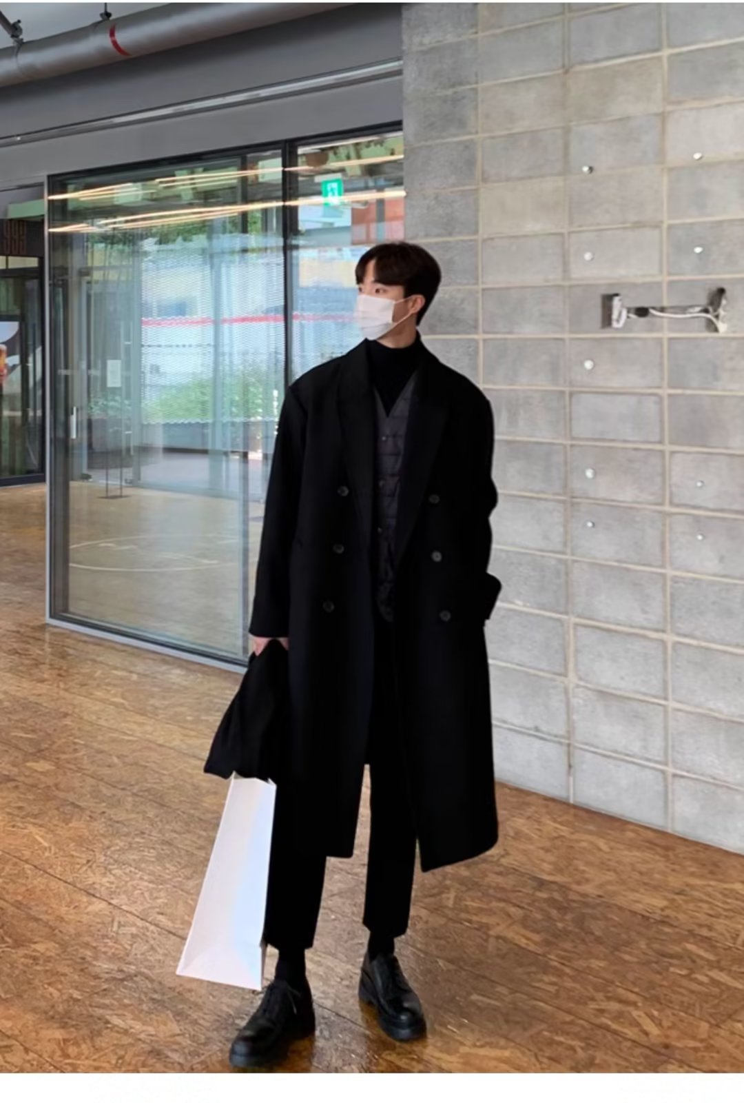 2024 겨울 한국 스타일의 간단한 단색 더블 레이어 디자인 두꺼운 모직 긴 남성 코트 루안 잘 생긴 어깨 패드 트렌치 코트스토어 가기