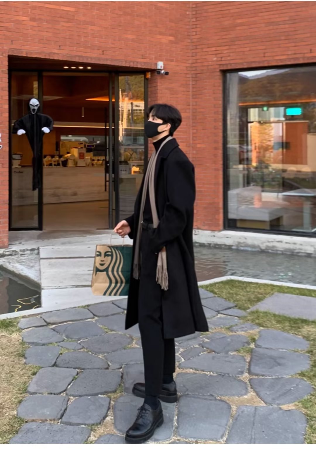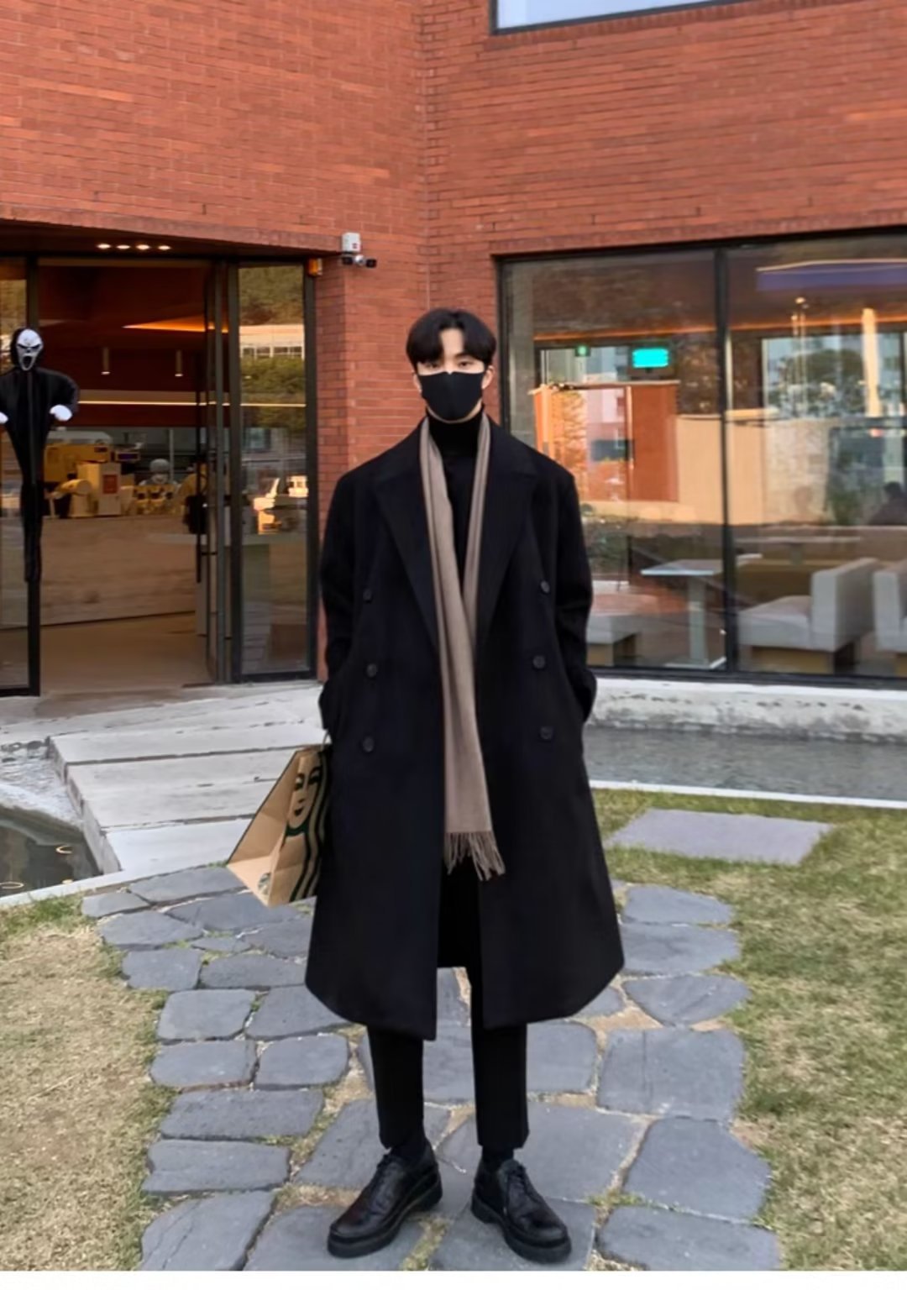 2024 겨울 한국 스타일의 간단한 단색 더블 레이어 디자인 두꺼운 모직 긴 남성 코트 루안 잘 생긴 어깨 패드 트렌치 코트