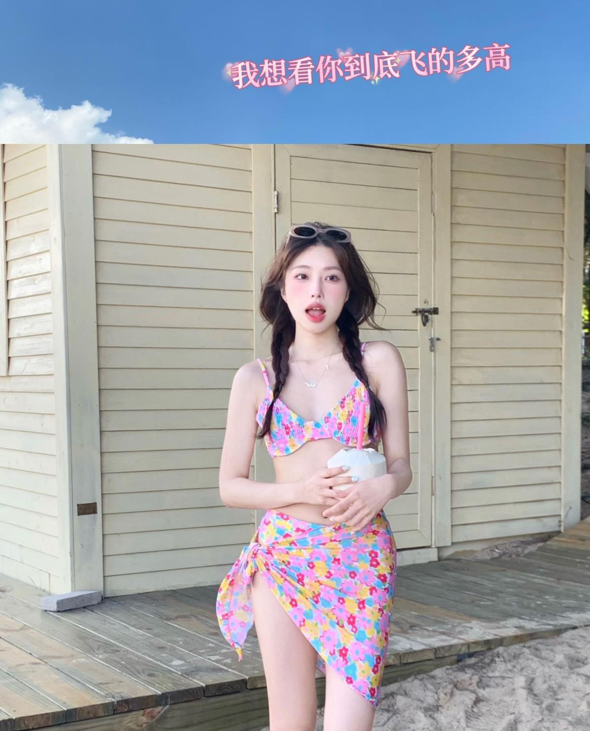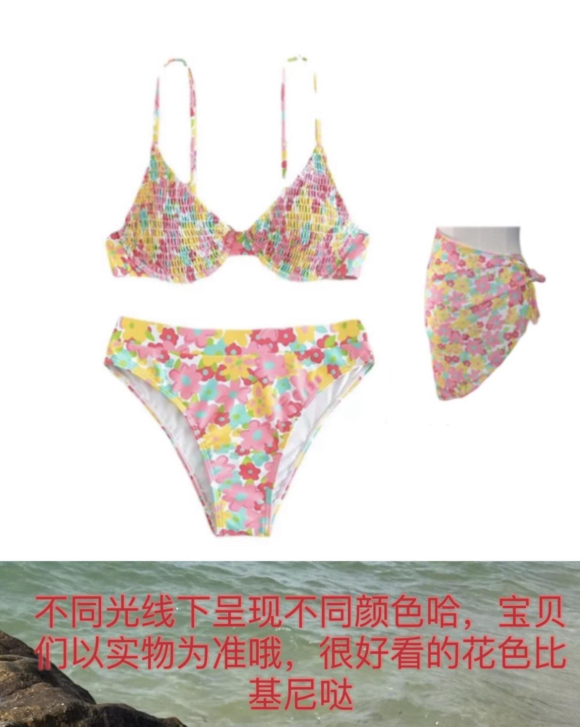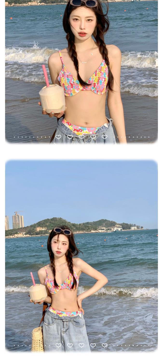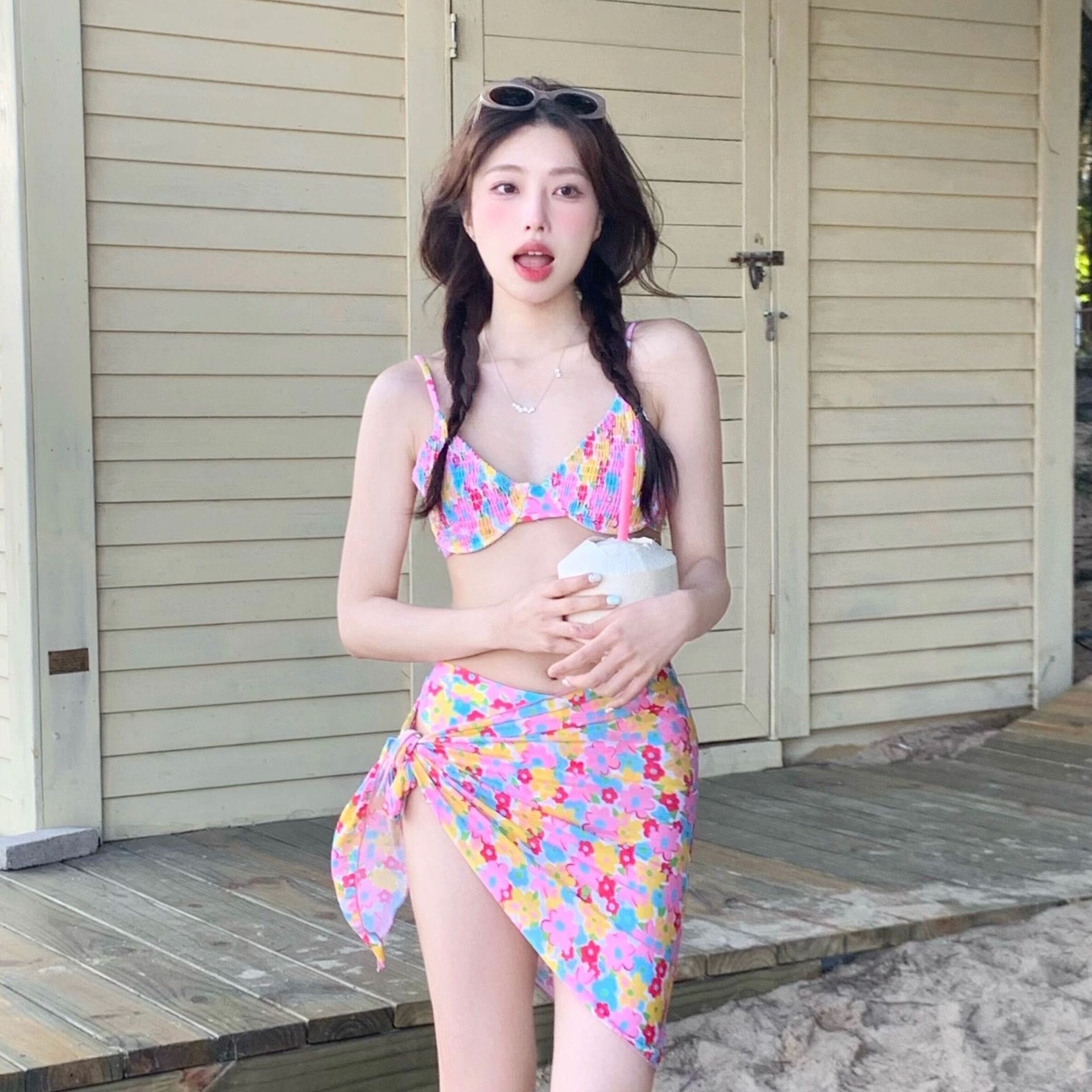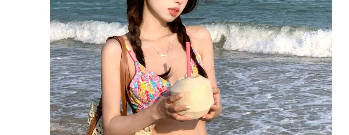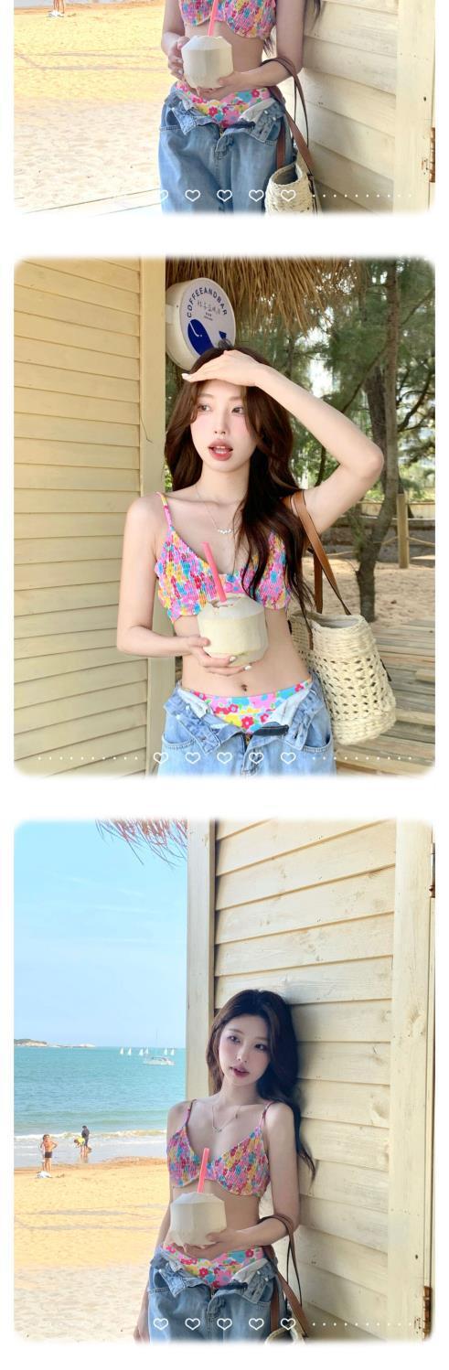 꽃 신선한 컬러 인쇄 된 플리츠 비키니 강철 지원 작은 가슴은 여성을위한 온천 해변 휴가 수영복을 모았습니다.스토어 가기