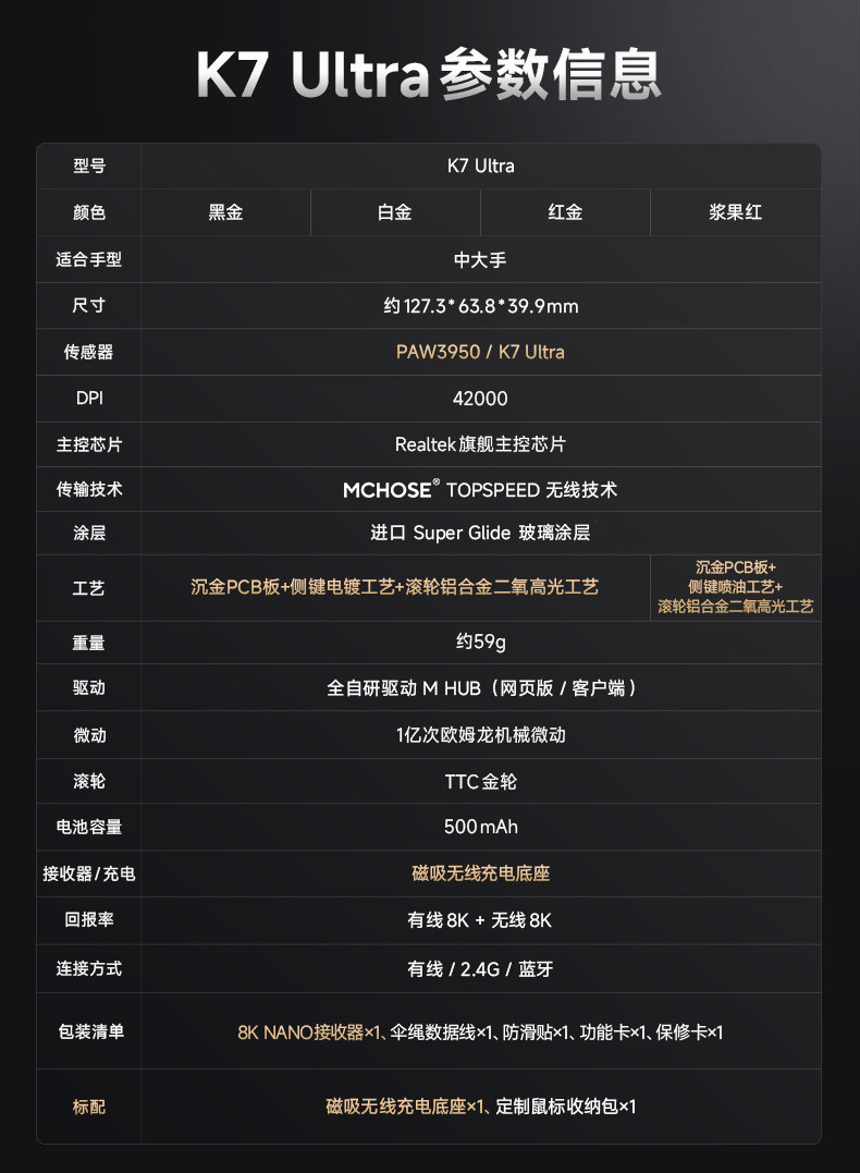 MCHOSE K7 울트라 무선 경량 게이밍 e스포츠 게이밍 3950 무선 충전 마우스