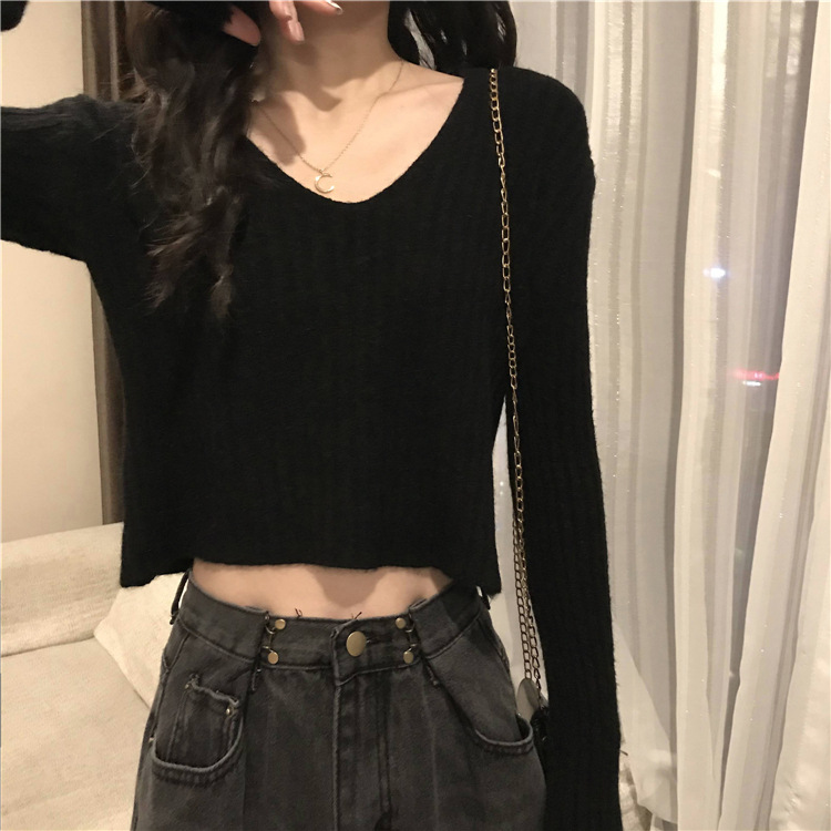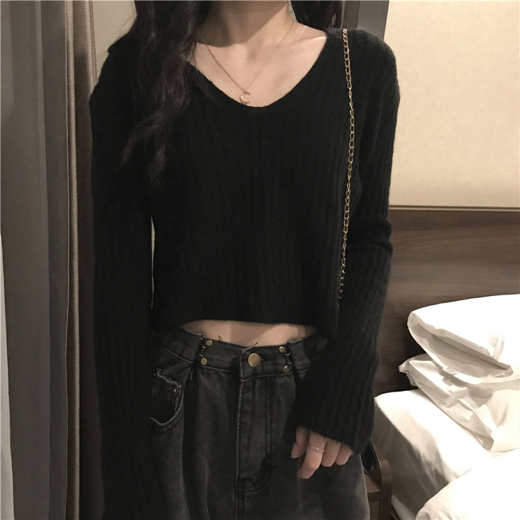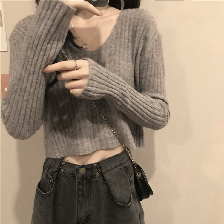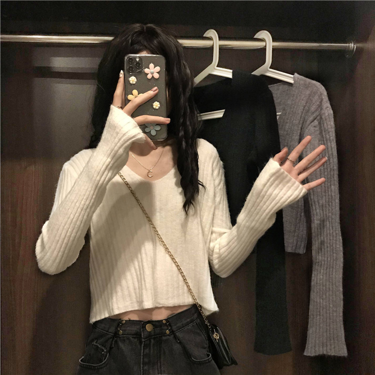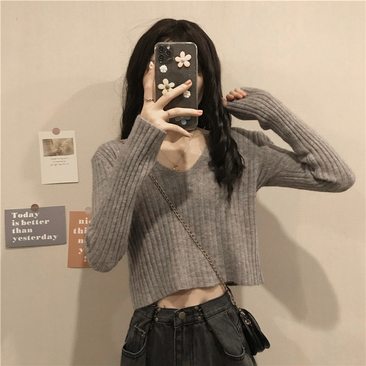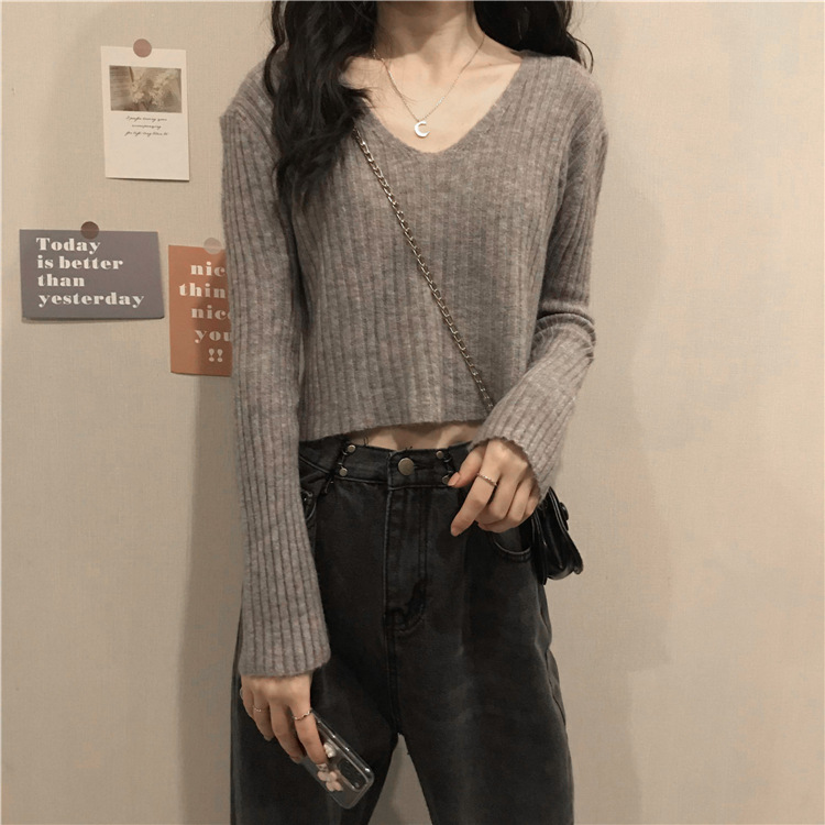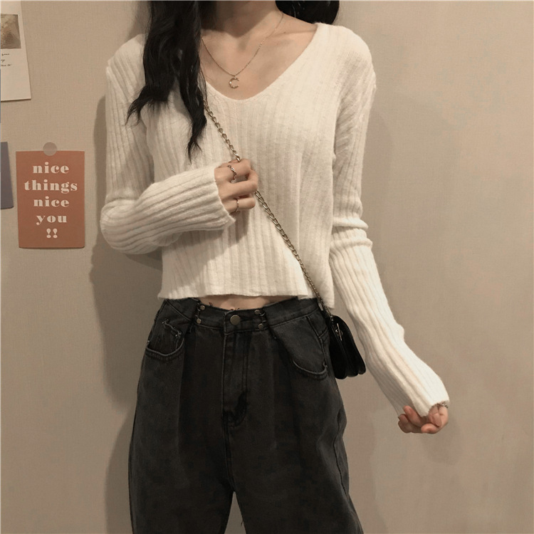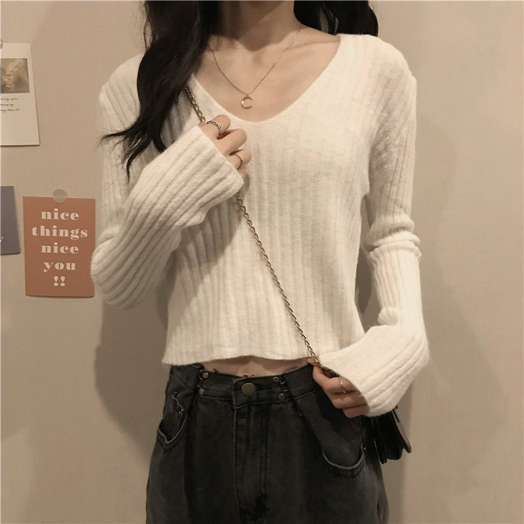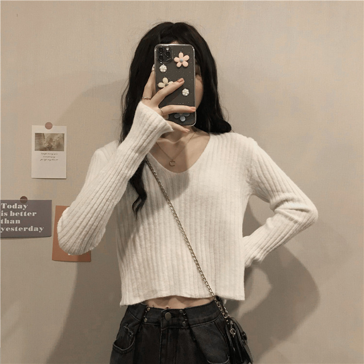 부드러운 왁스 다목적 V-넥 핏 긴팔 스웨터 여성의 가을 느슨한 탄성 슬리밍