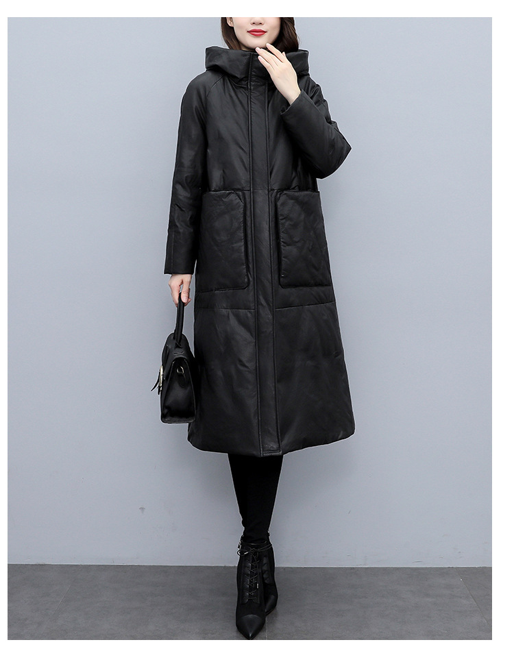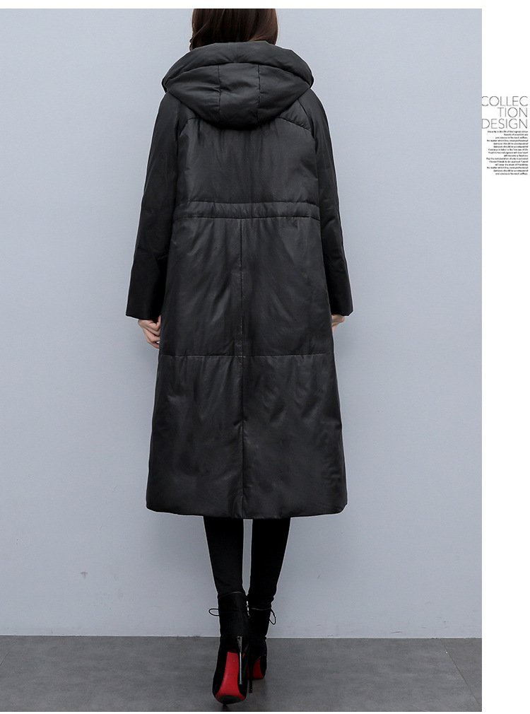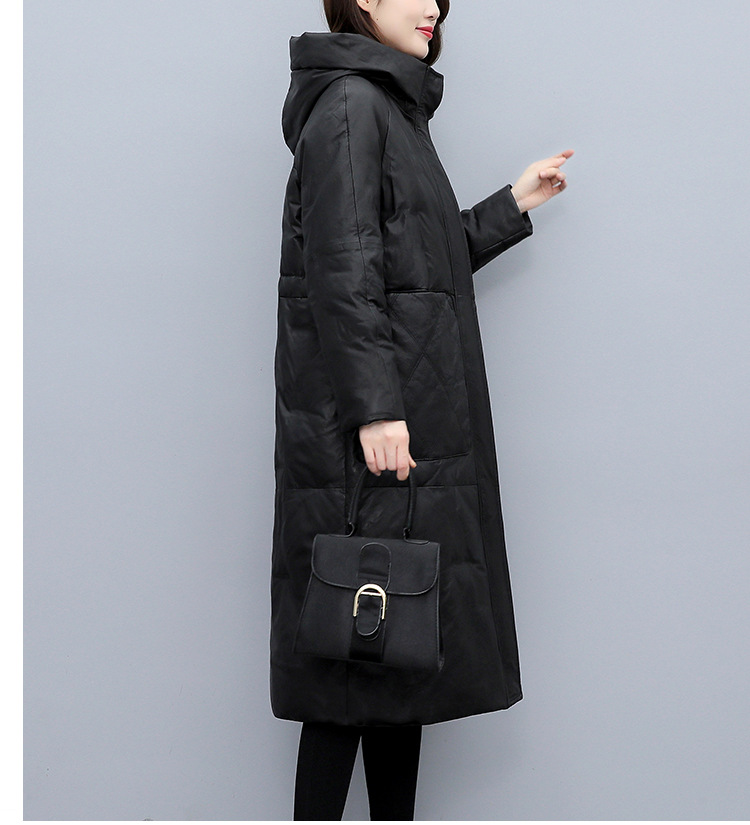 Haining 2025 겨울 신상 여성 정품 가죽 다운 후드 루즈한 대형 정품 양가죽 롱 코트
