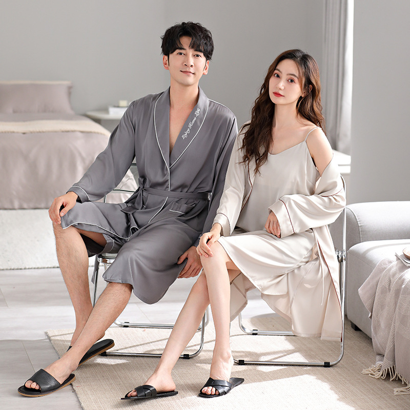 한 야통 커플 잠옷 새틴 아이스 실크 봄과 가을 가정복 남성용 잠옷 반바지 여성용 잠옷 슬립 스커트 가슴 패드