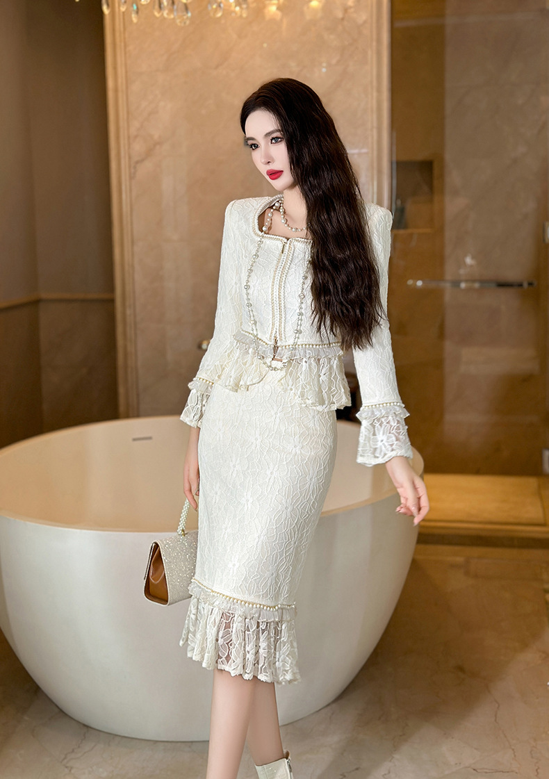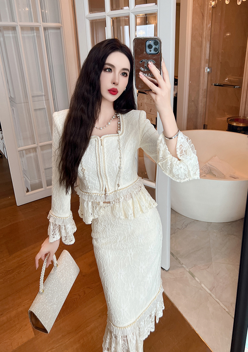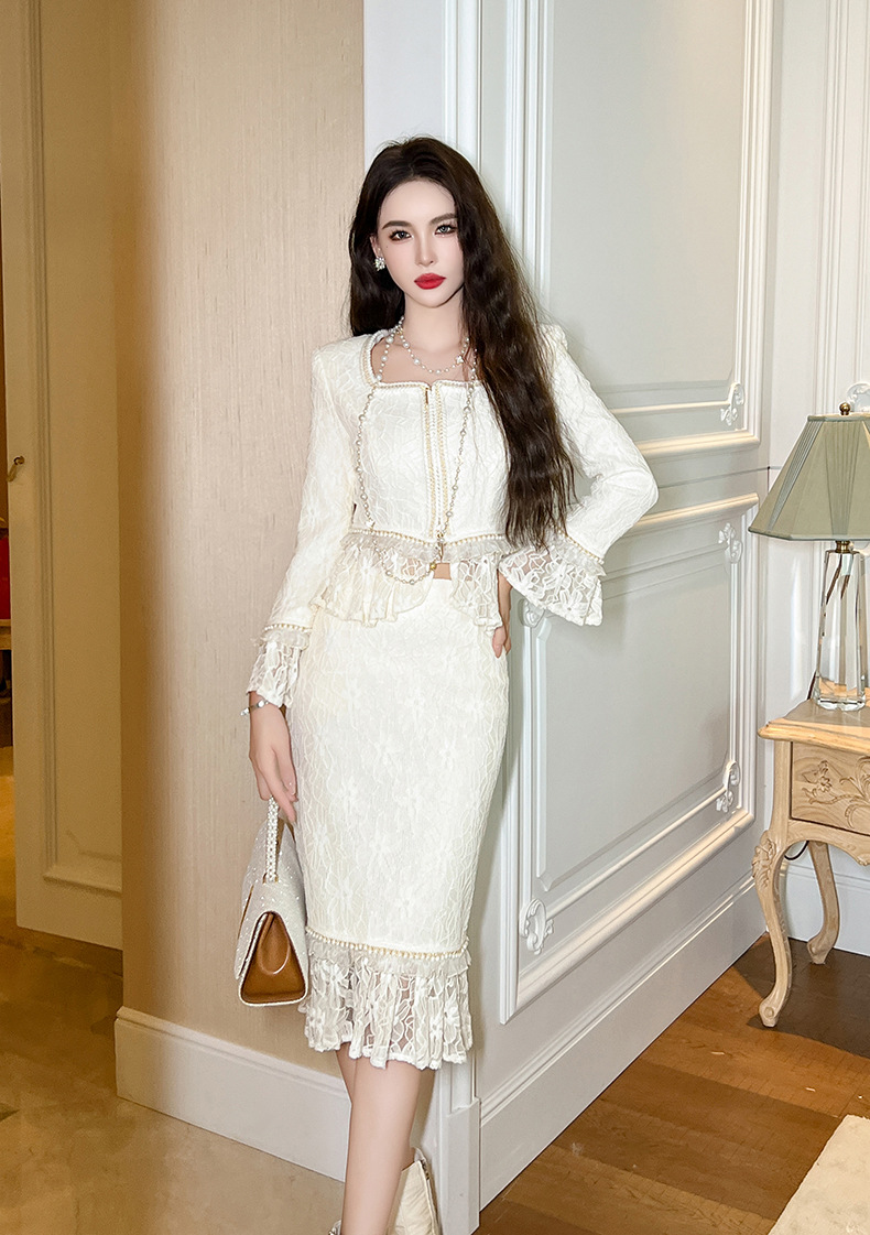 2025 가을 신상 여성용 작은 프랑스 스타일 디자인 레이스 탑과 힙을 감싸는 스커트 세트 20925