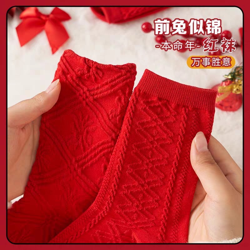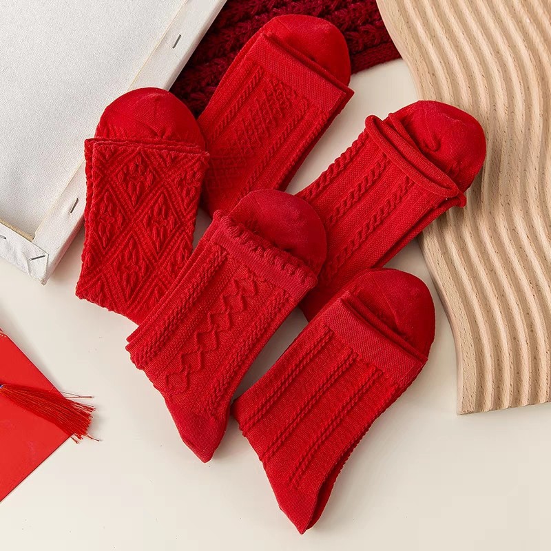 Benmingnian 양말 여자의 중간 길이 양말 가을과 겨울 면 새해 웨딩 양말 축제 단색 토끼 년 빨간 양말