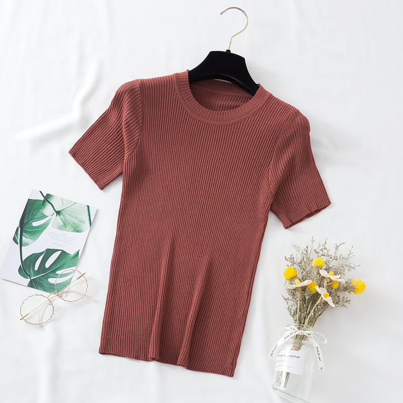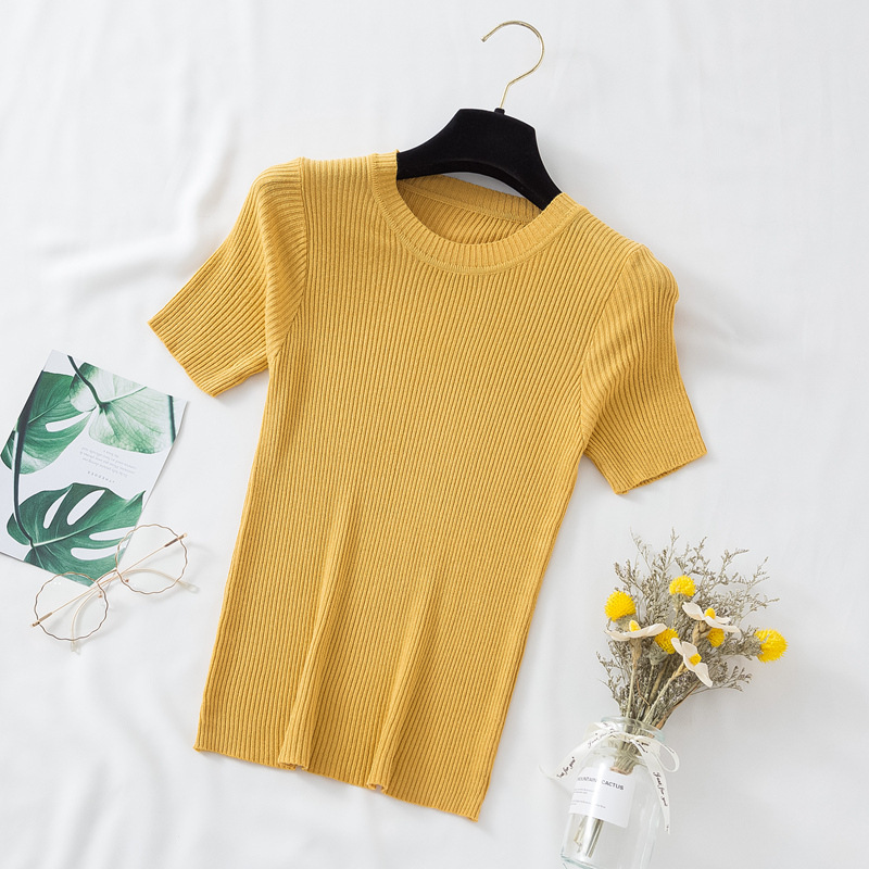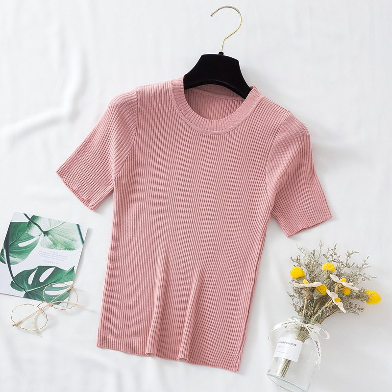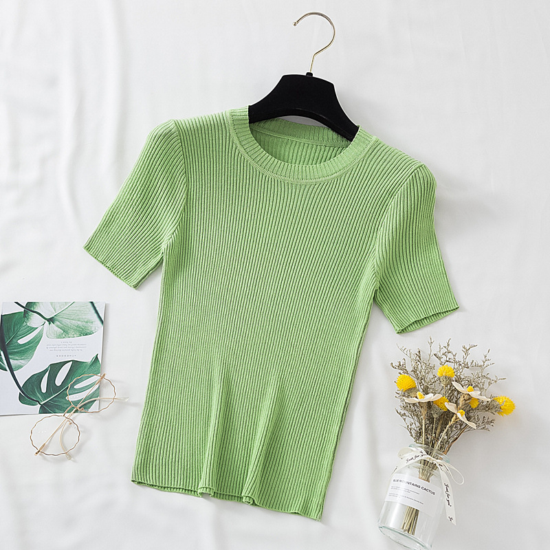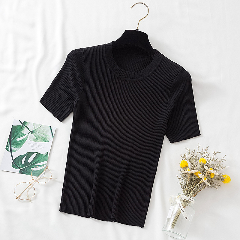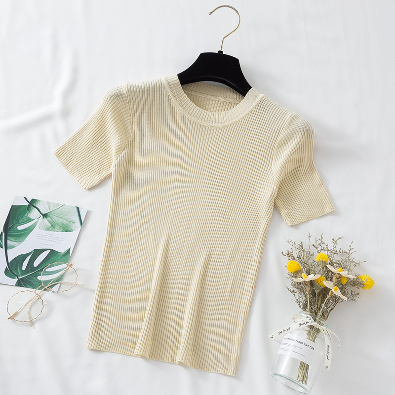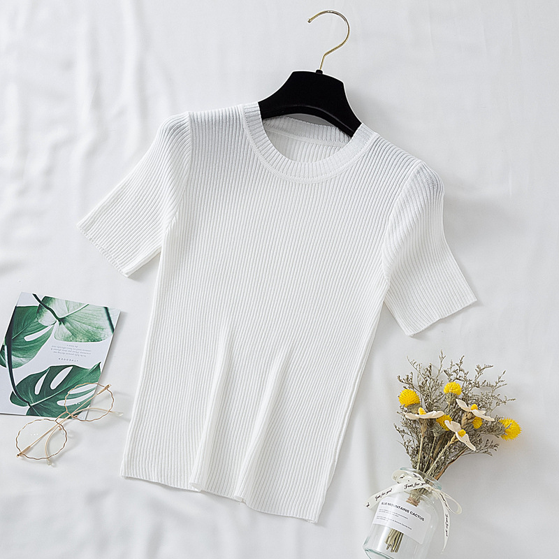 2022 여름 새로운 라운드 넥 슬림 바닥 반팔 티셔츠 여성 탑 타이트 내부 아이스 실크 스웨터 얇은 도매스토어 가기