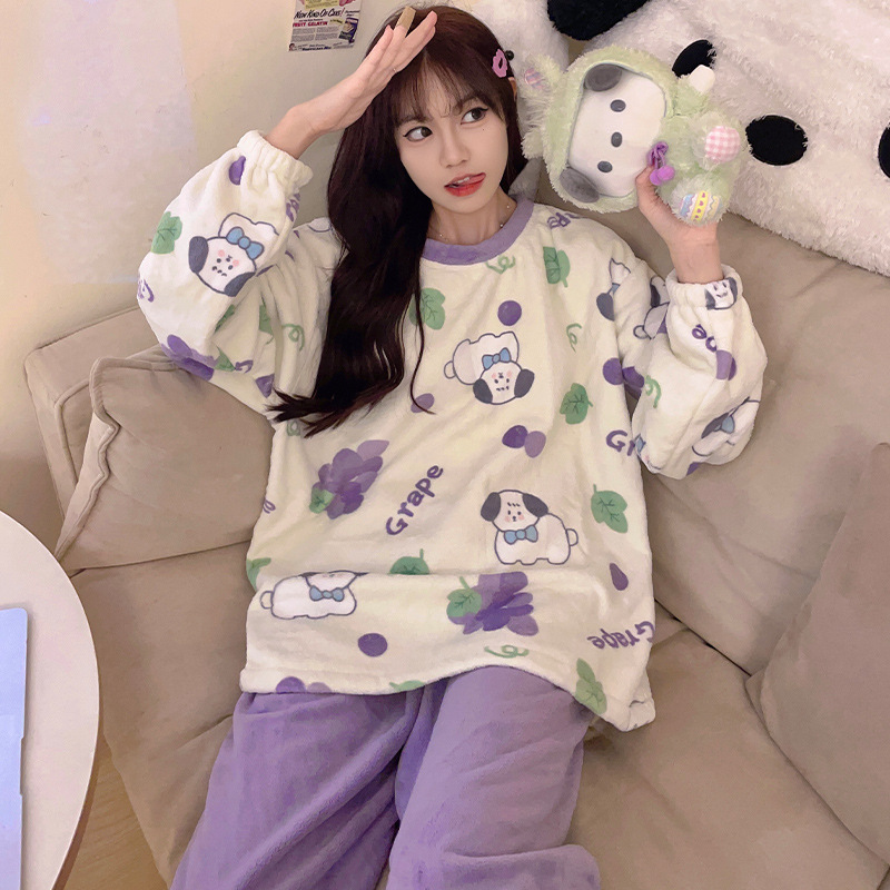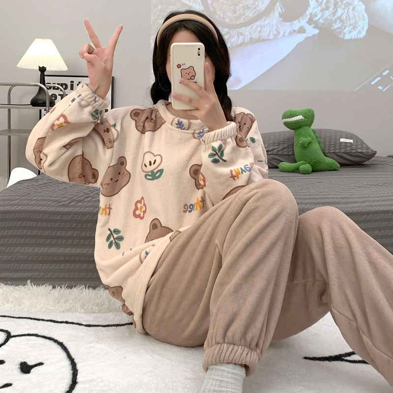 잠옷 여자의 가을과 겨울 플란넬 두꺼운 달콤한 귀여운 한국 산호 양털 크루넥 잠옷 가정 옷 세트스토어 가기