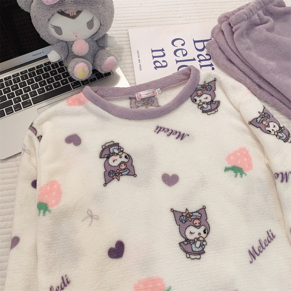 잠옷 여자의 가을과 겨울 플란넬 두꺼운 달콤한 귀여운 한국 산호 양털 크루넥 잠옷 가정 옷 세트