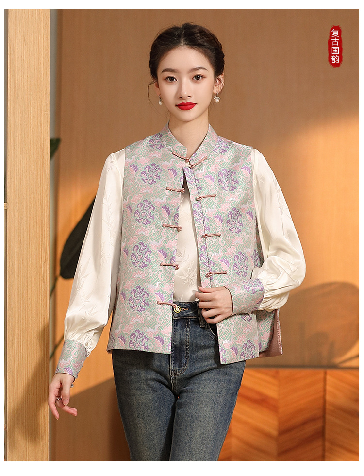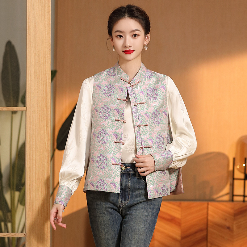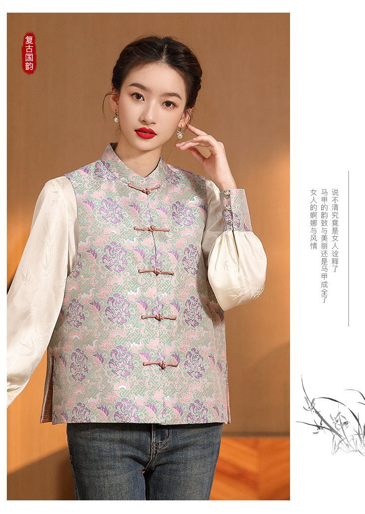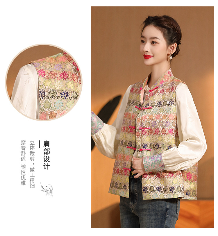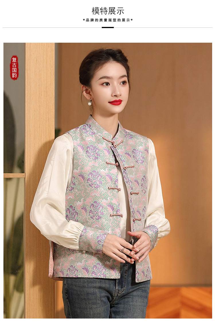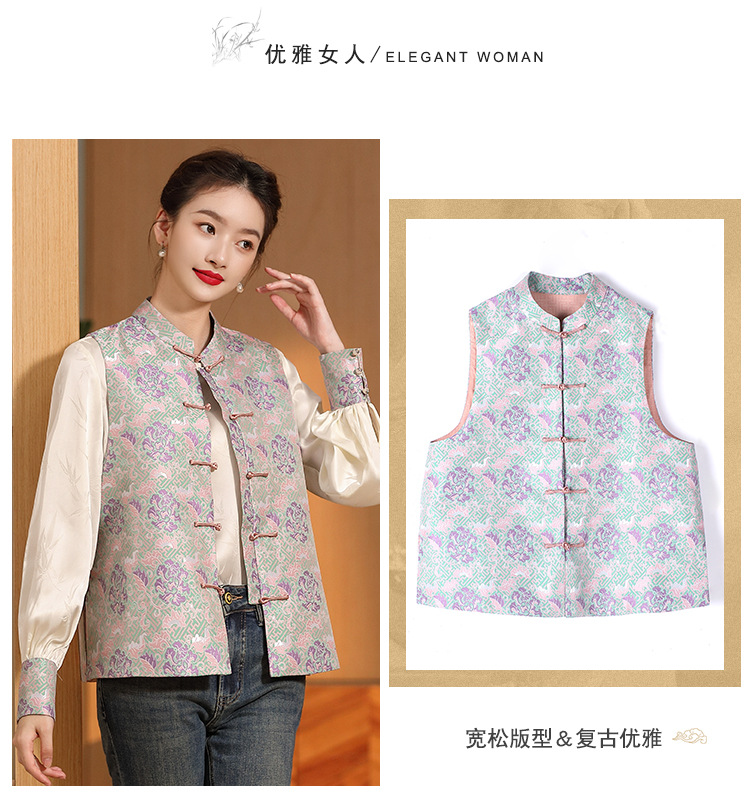 2024 봄 새로운 여성 의류 중국 스타일 칼라 탑 자카드 개선 된 빈티지 송 브로케이드 자카드 여성 조끼