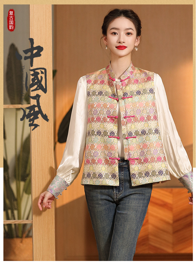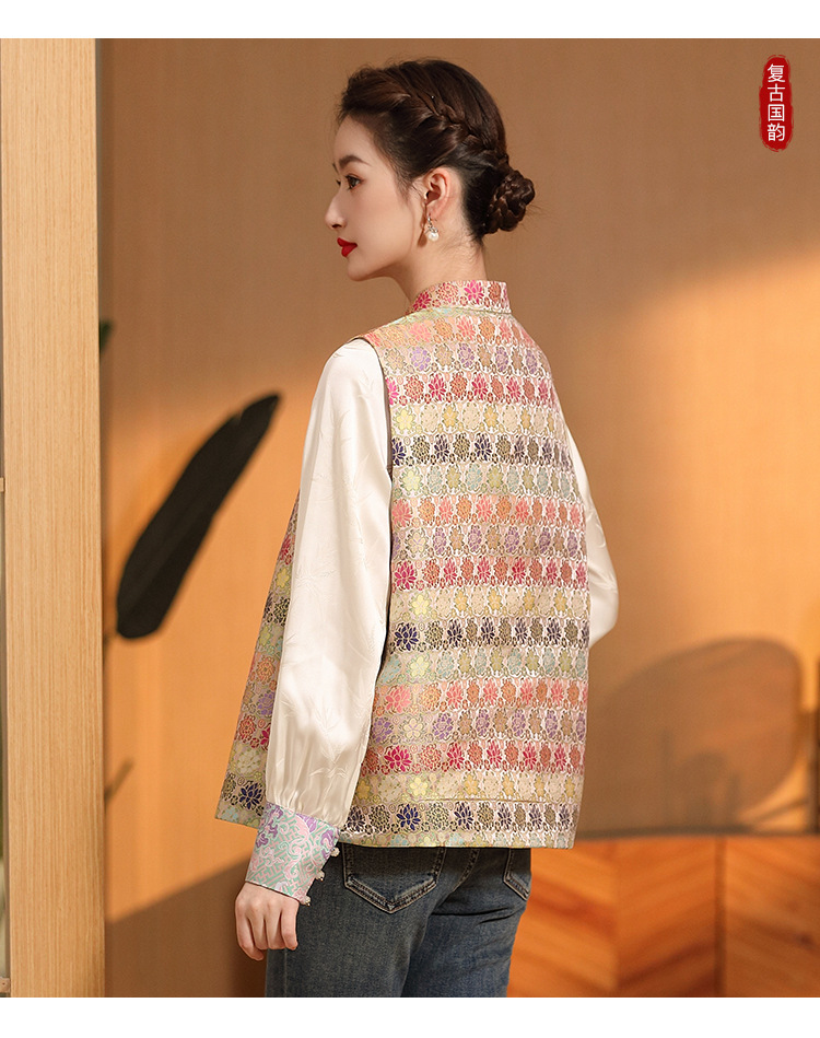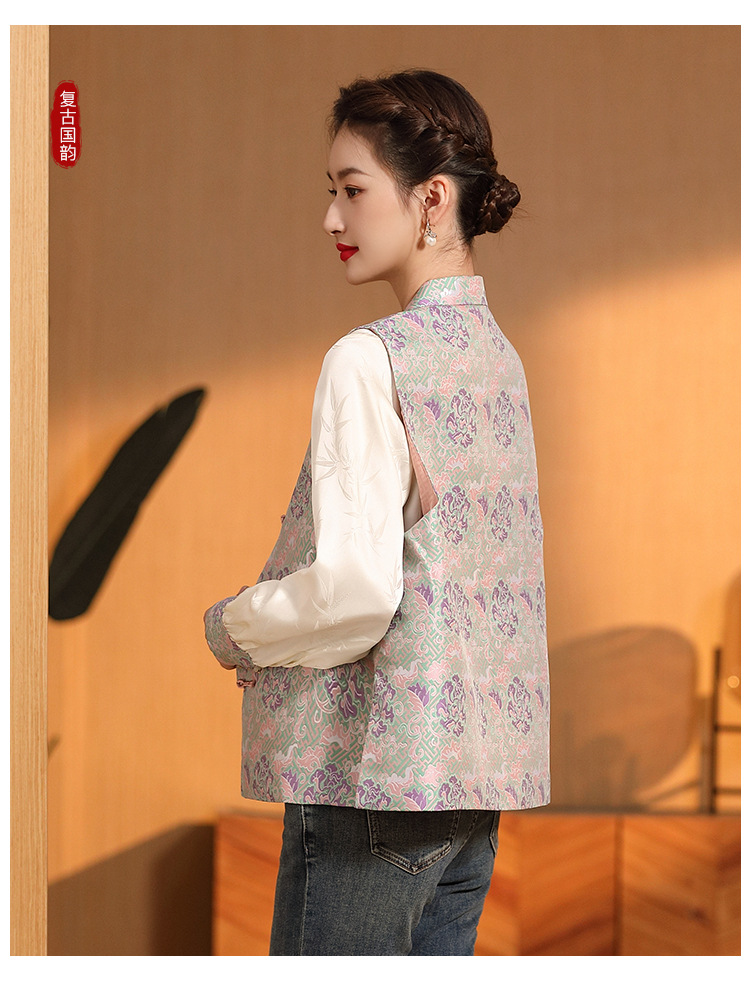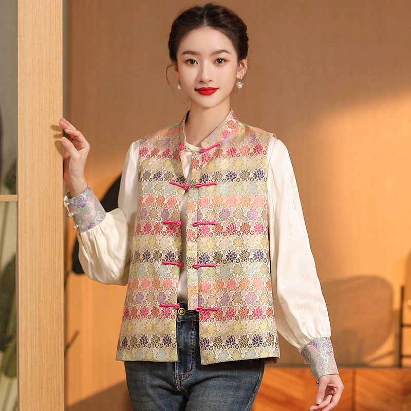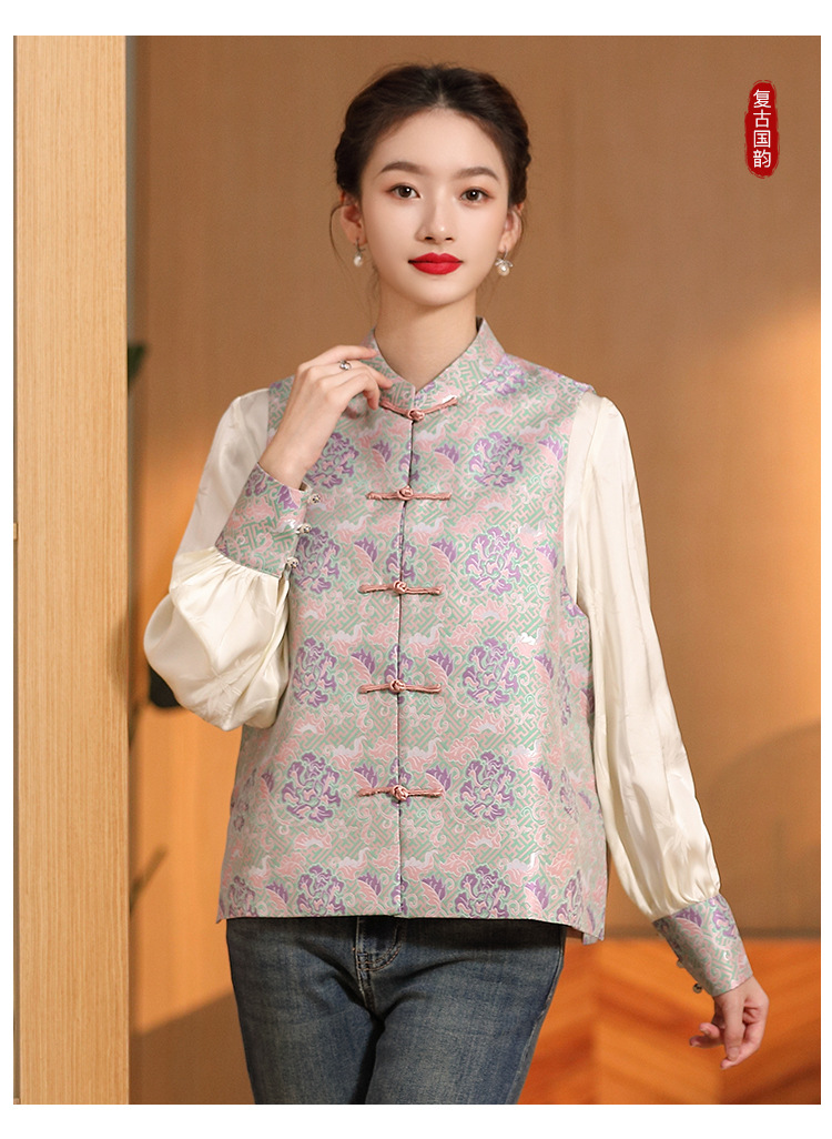 2024 봄 새로운 여성 의류 중국 스타일 칼라 탑 자카드 개선 된 빈티지 송 브로케이드 자카드 여성 조끼