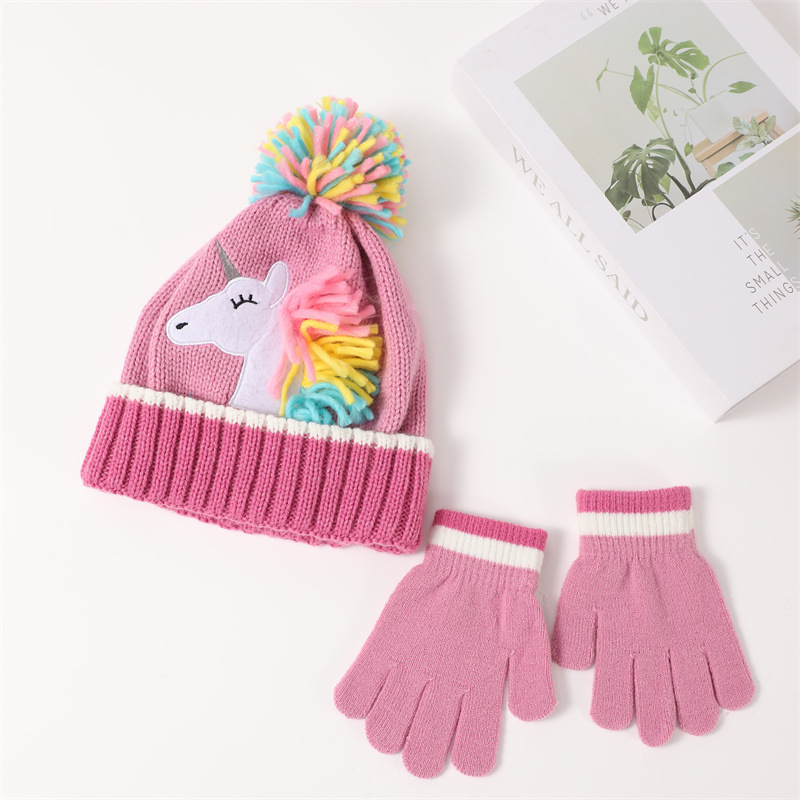 가을과 겨울 어린이의 새로운 유니콘 모자 장갑 기모 따뜻한 소년과 소녀 양모 모자 만화 세트 도매
