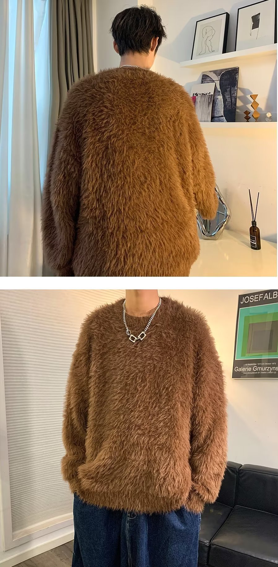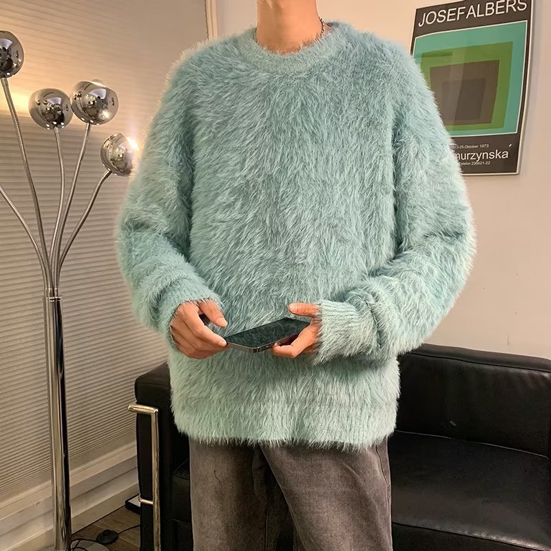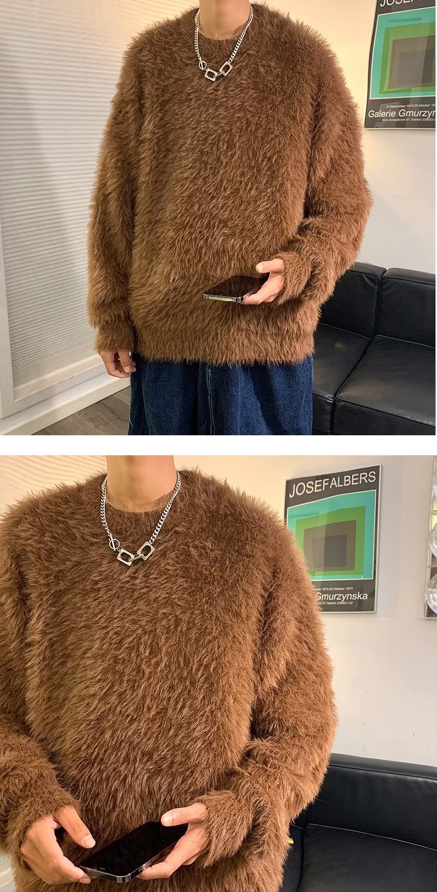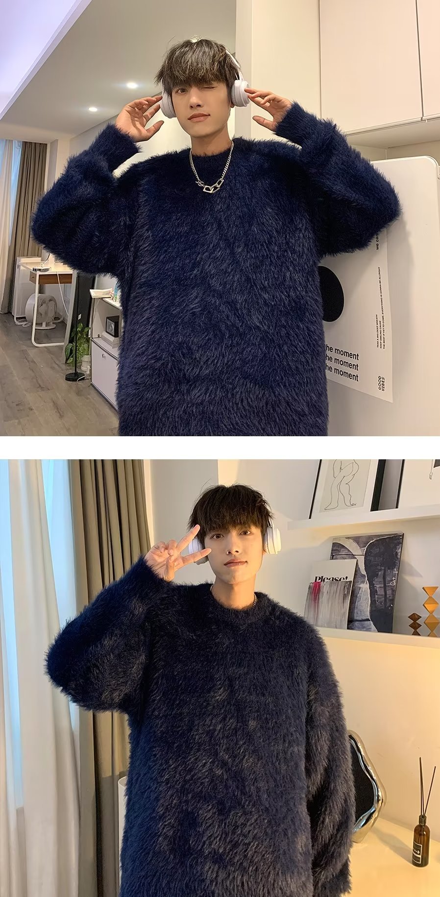 모헤어 푹신한 스웨터 남성용 트렌디 브랜드 게으른 스타일 고급 소프트 왁스 화이트 크루넥 스웨터 오버 사이즈