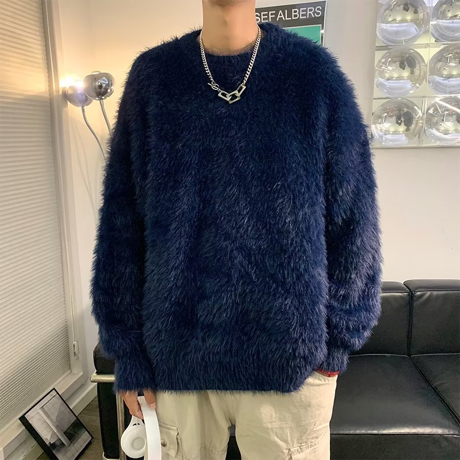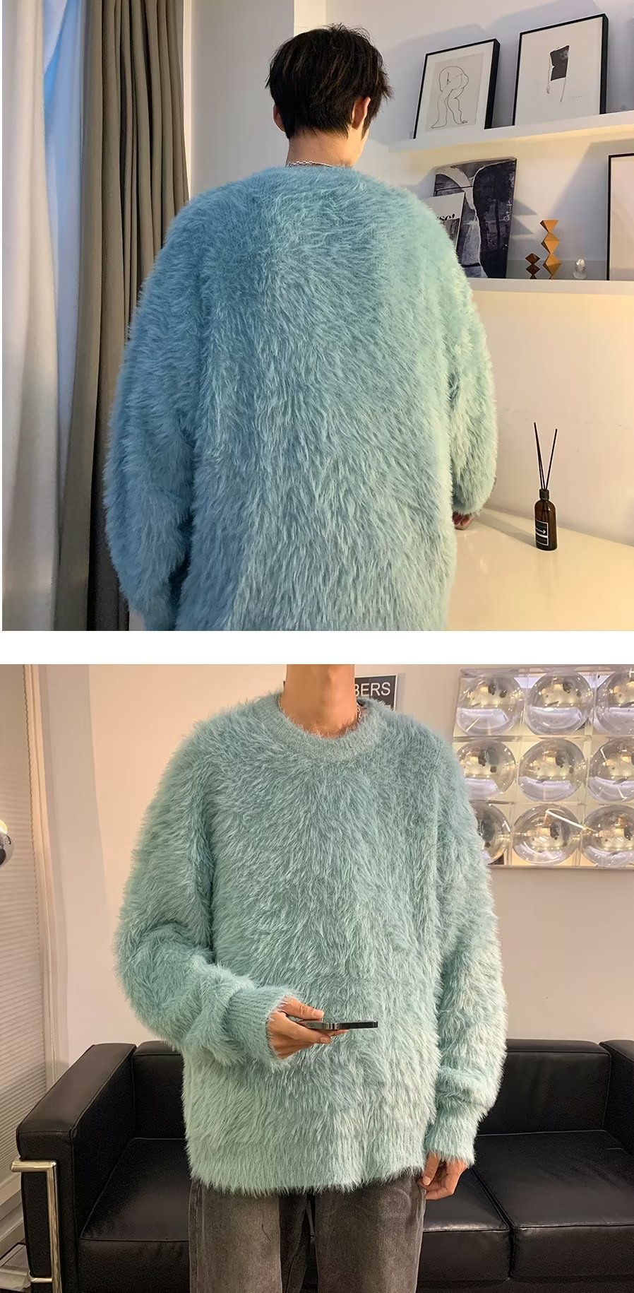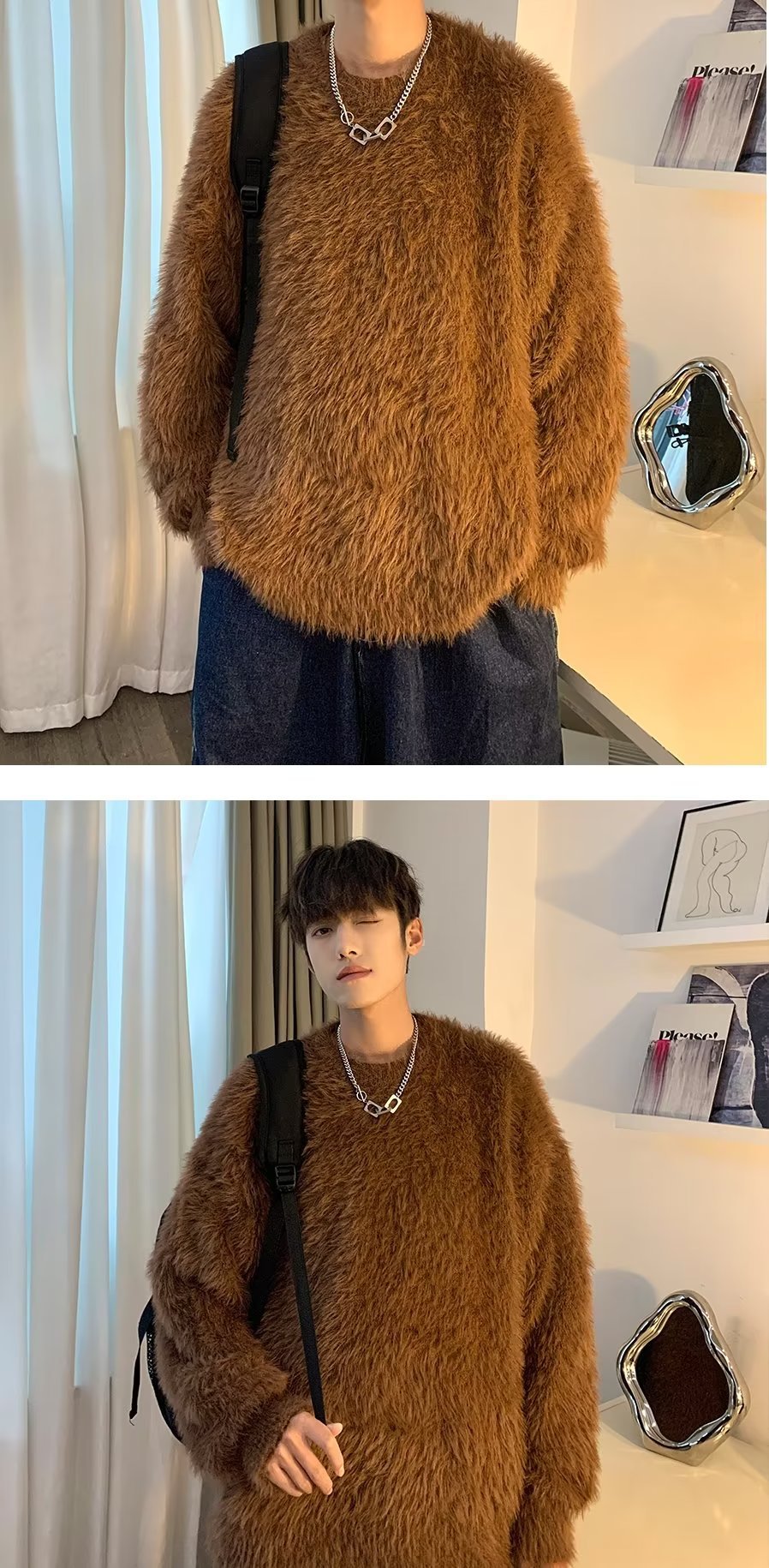 모헤어 푹신한 스웨터 남성용 트렌디 브랜드 게으른 스타일 고급 소프트 왁스 화이트 크루넥 스웨터 오버 사이즈